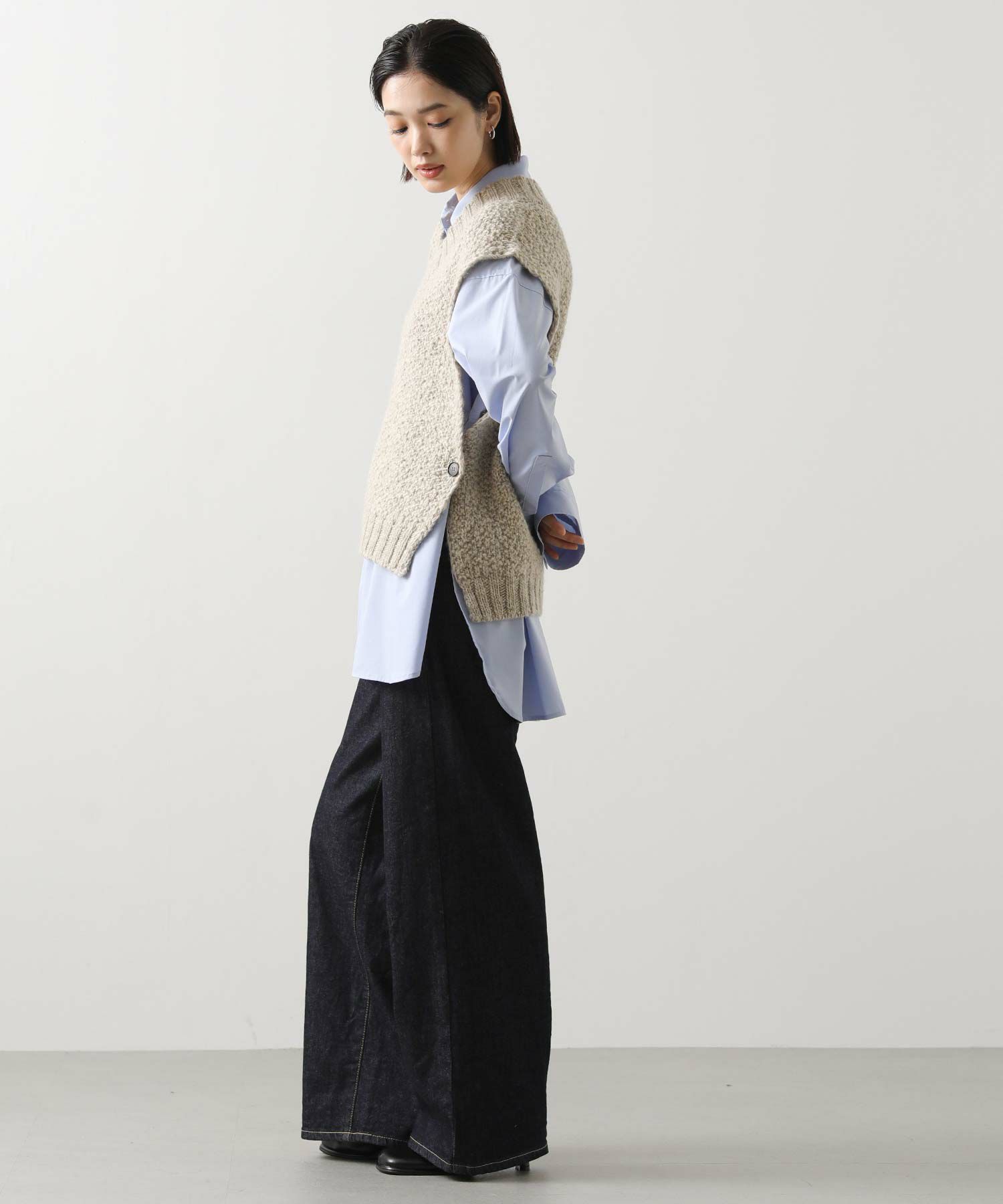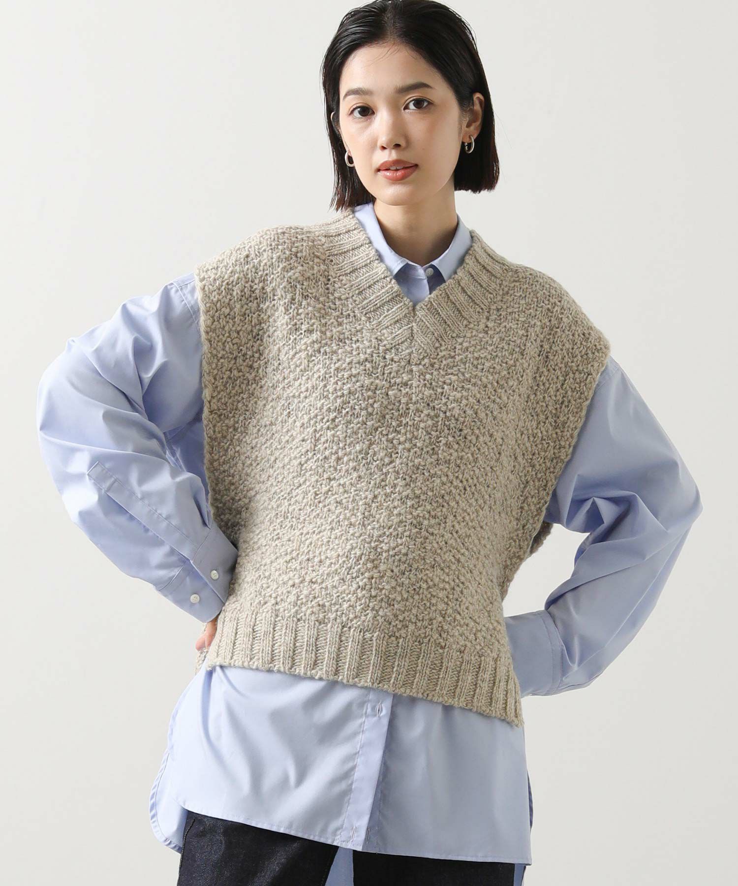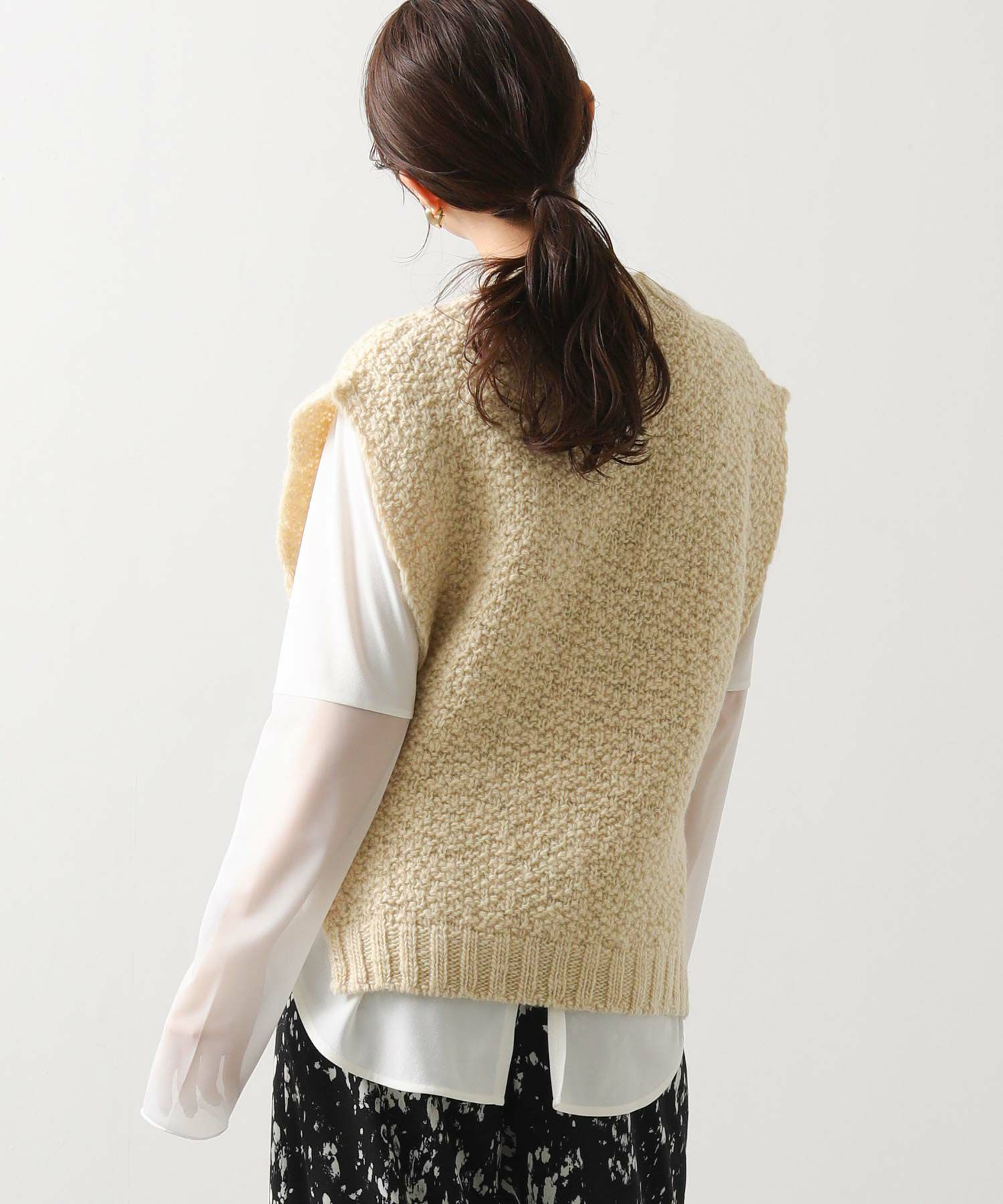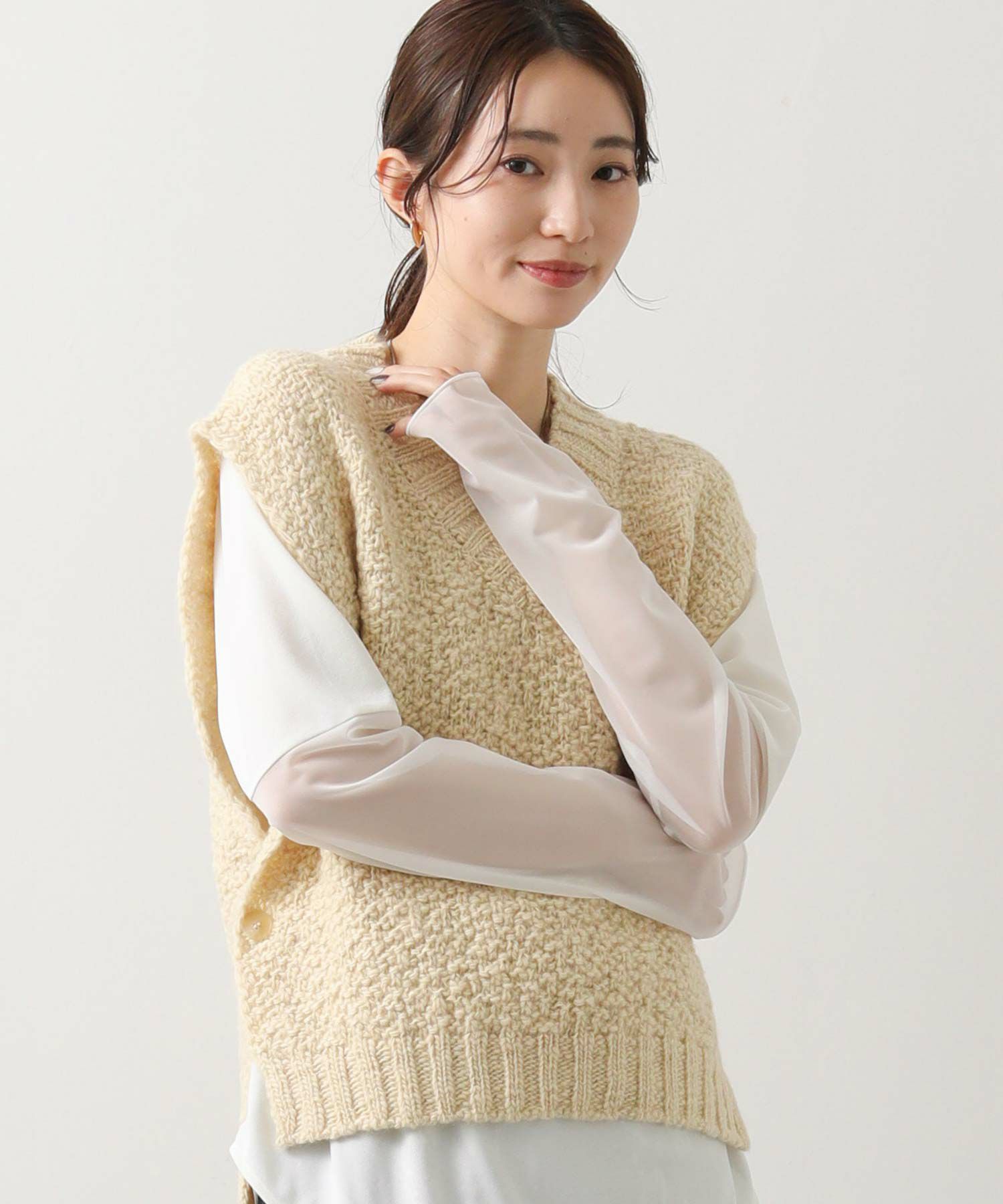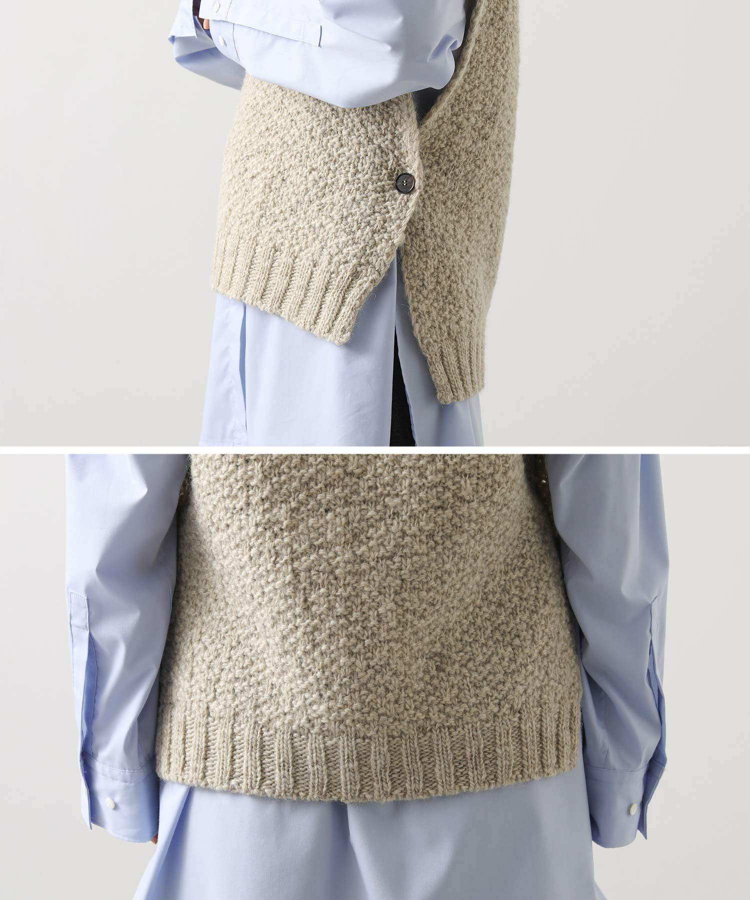 脇のボタンを止めてVネックショートベストに、ボタンを開けて肩部分をずらしてボートネックショートポンチョ風にアレンジ出来るデザインニット。