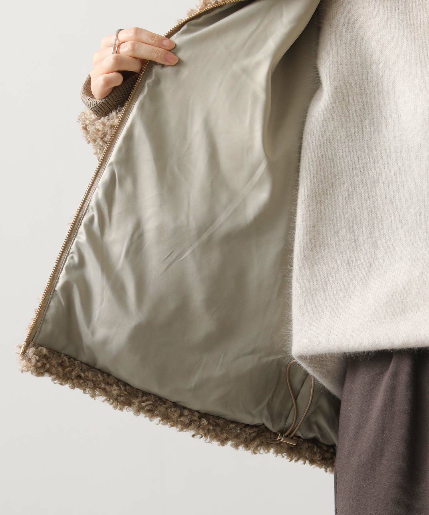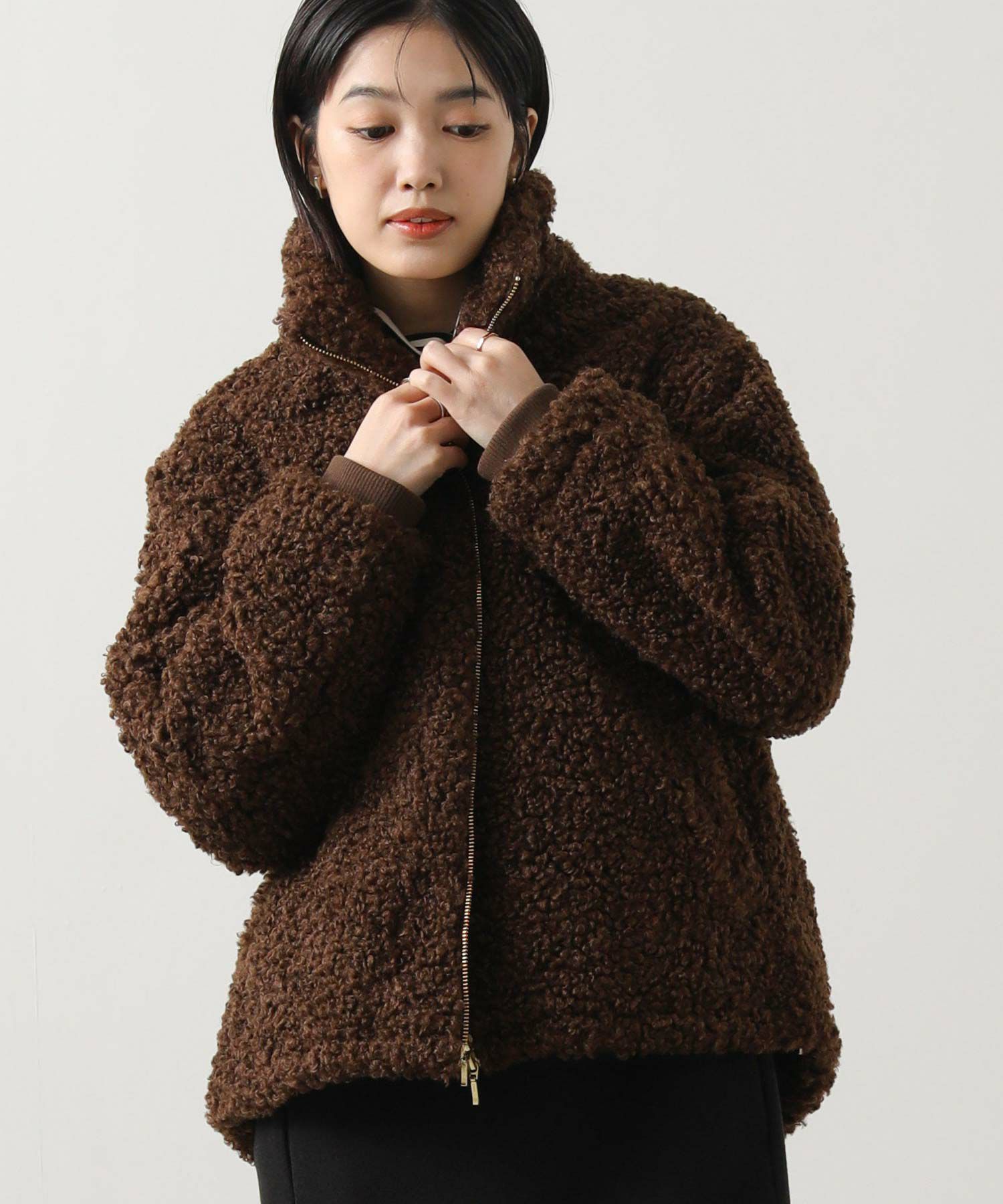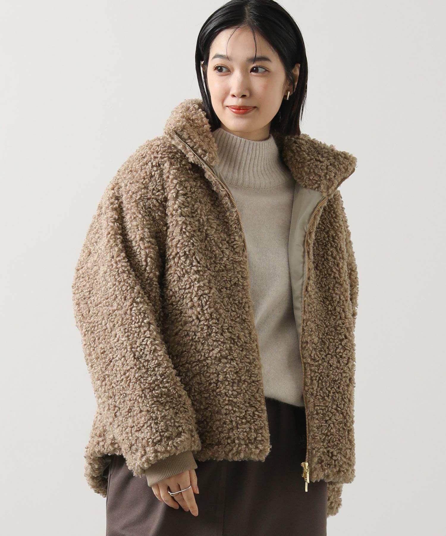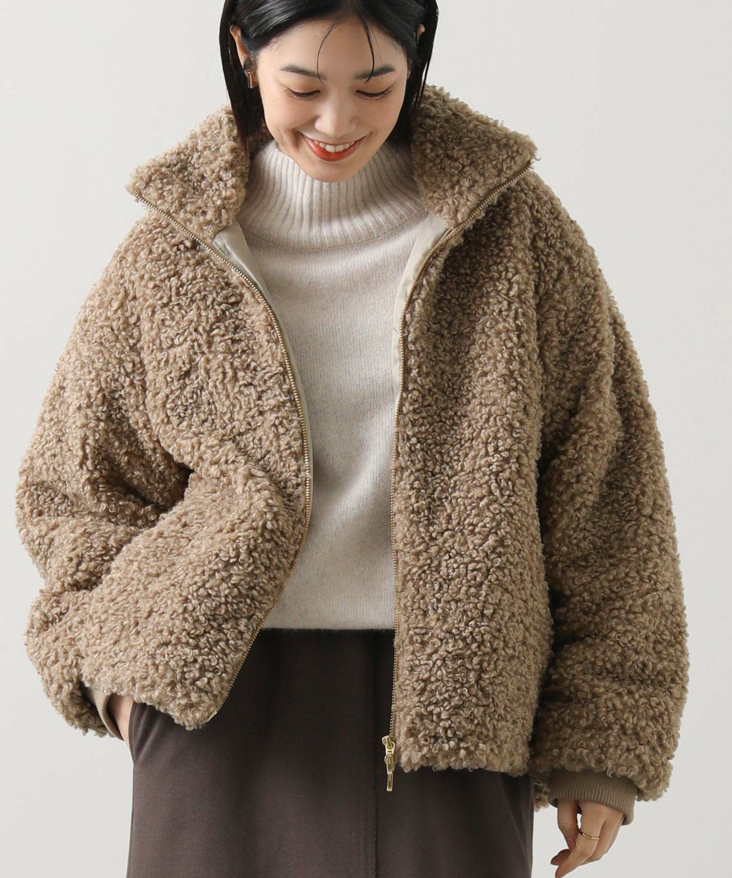 毛足が長めのプードルボアを使用したハイネックブルゾン。