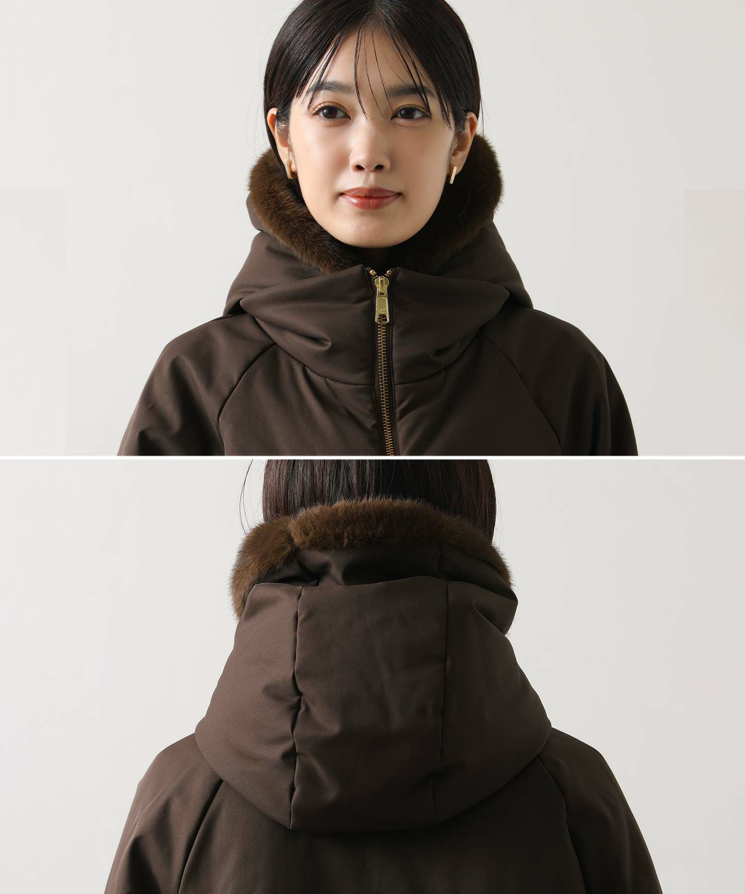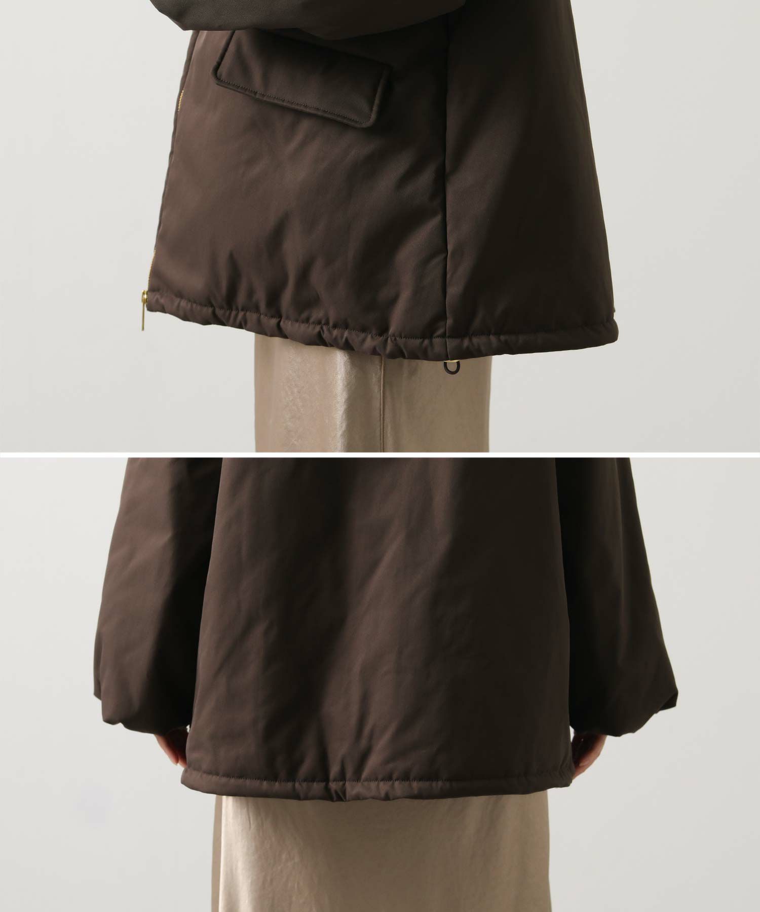 ファーを外すとシンプルなスタンドネックデザインの中綿コート。