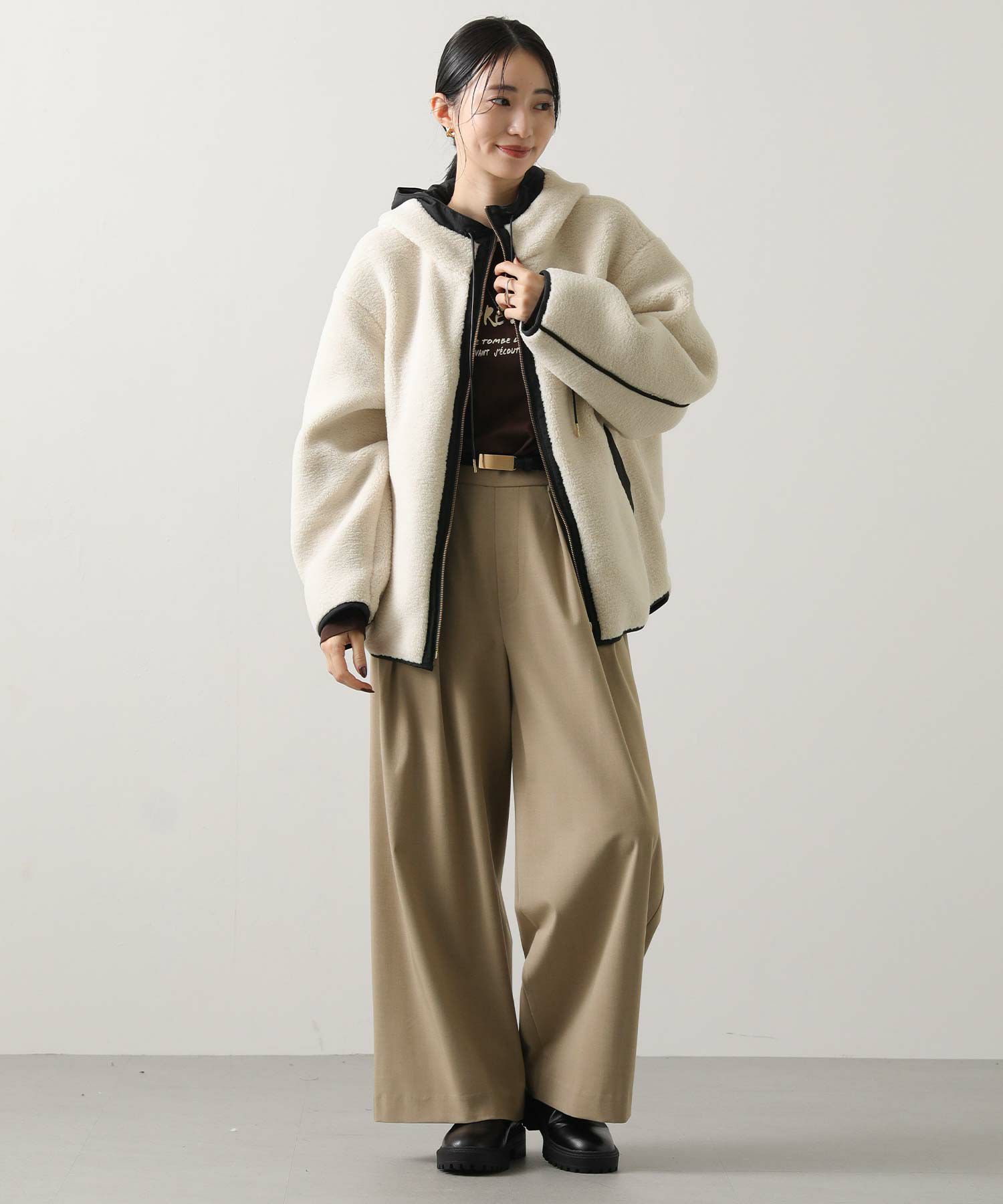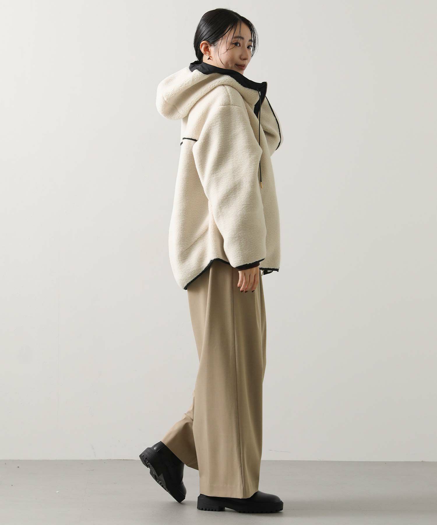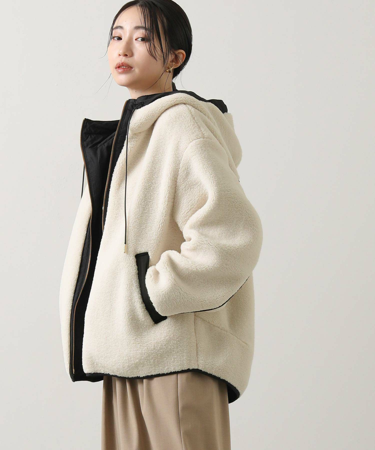 カジュアルすぎず、女性らしい雰囲気のフーディーボアブルゾン。
