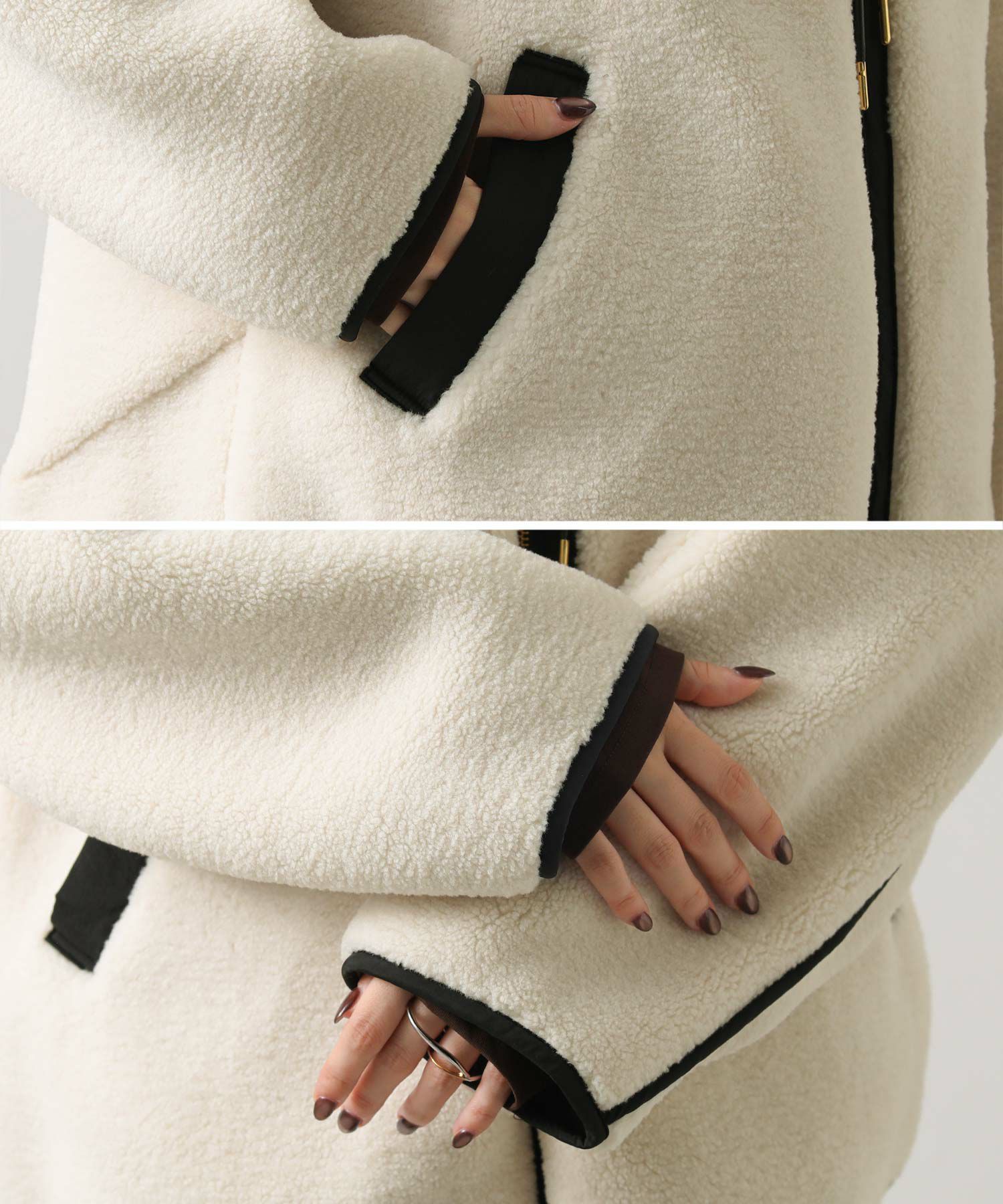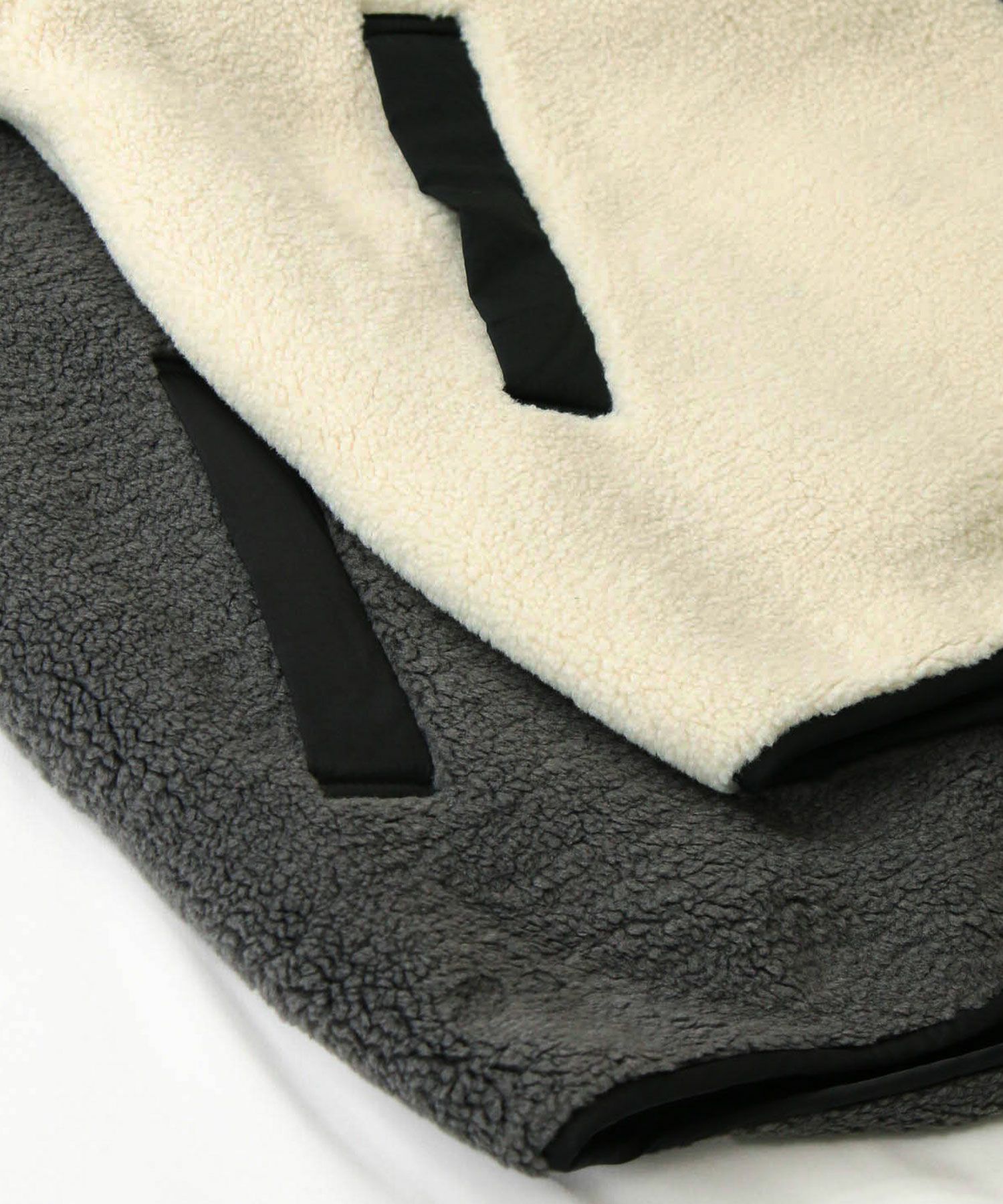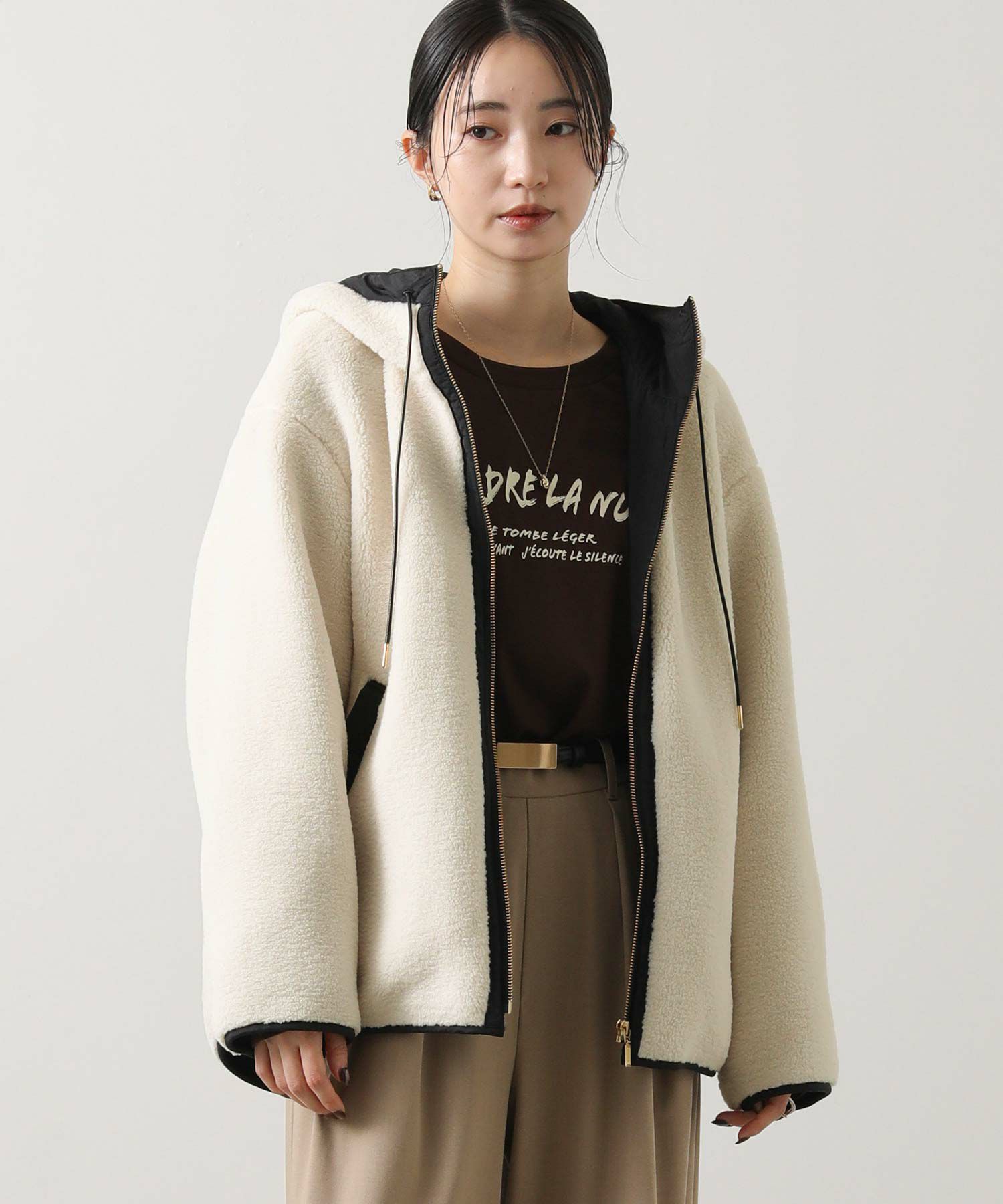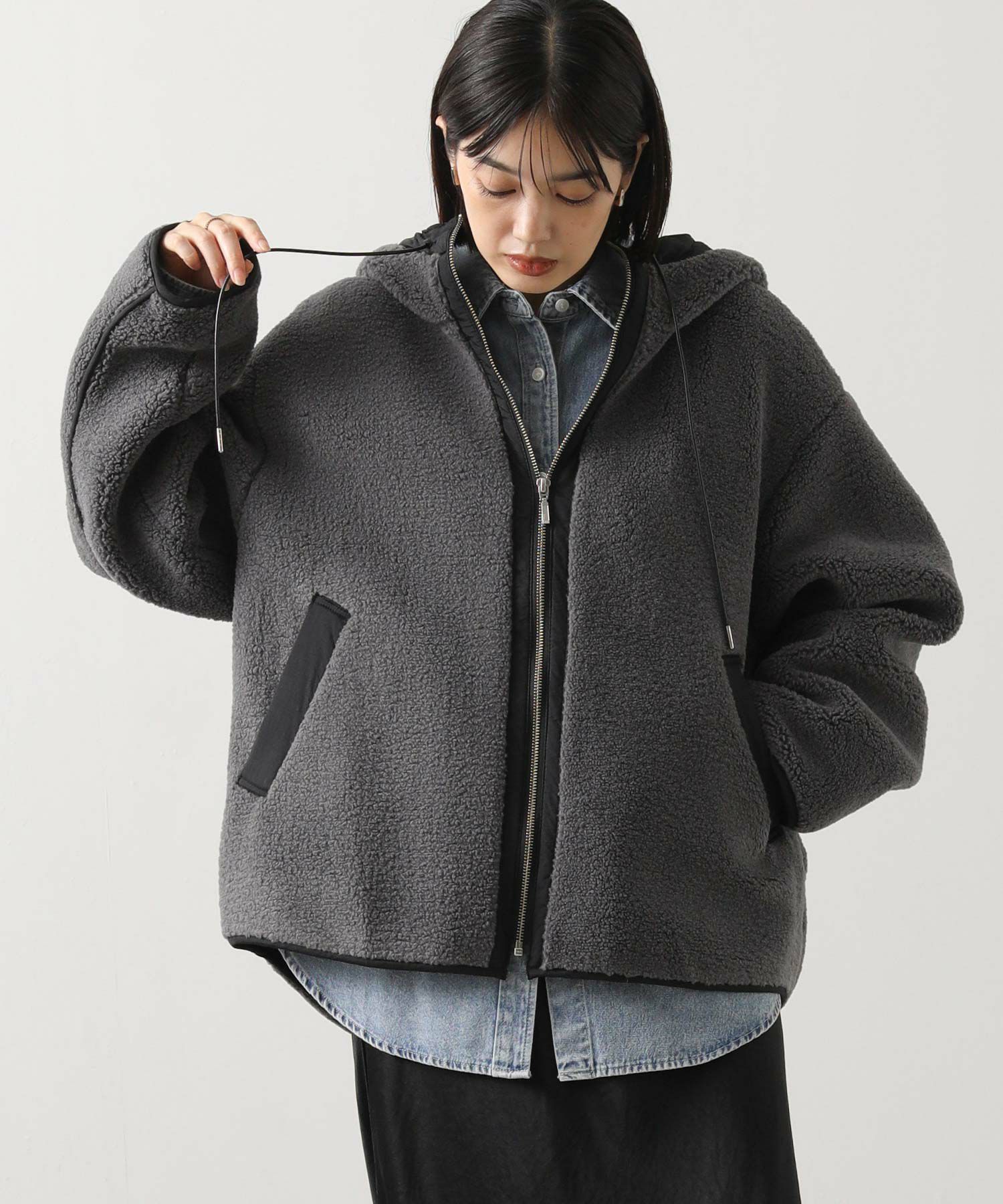 カジュアルすぎず、女性らしい雰囲気のフーディーボアブルゾン。