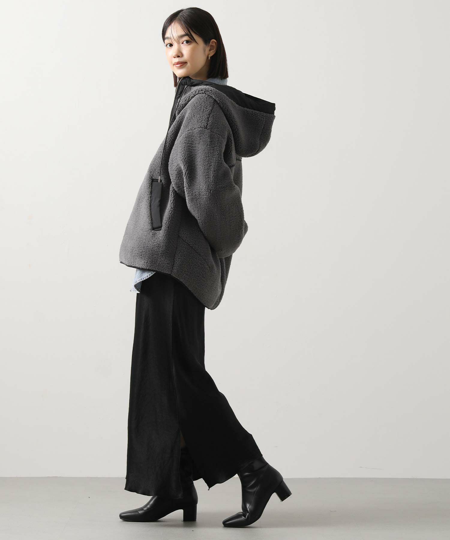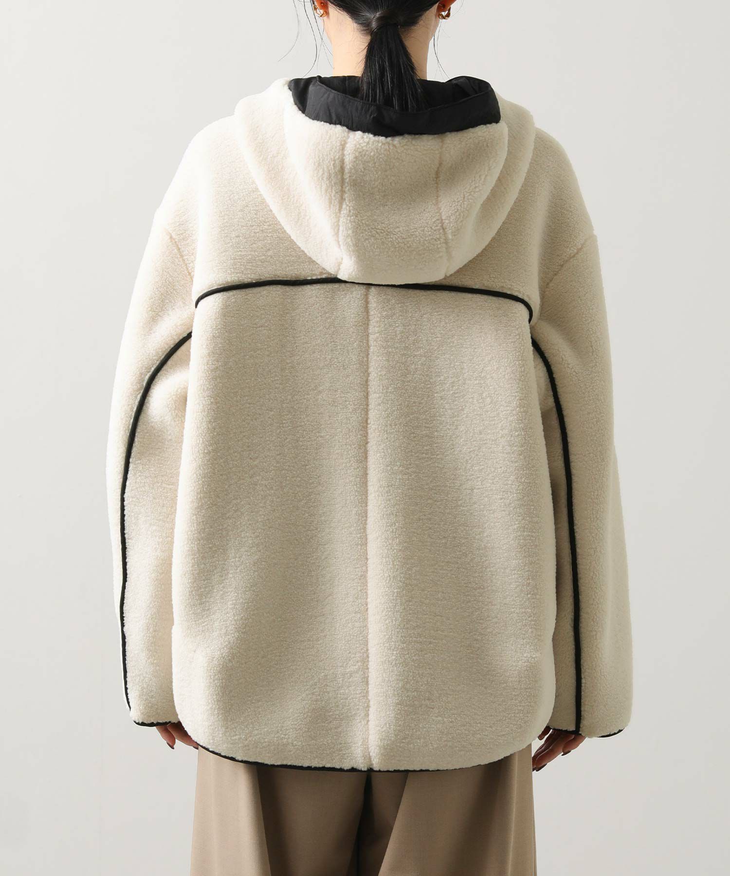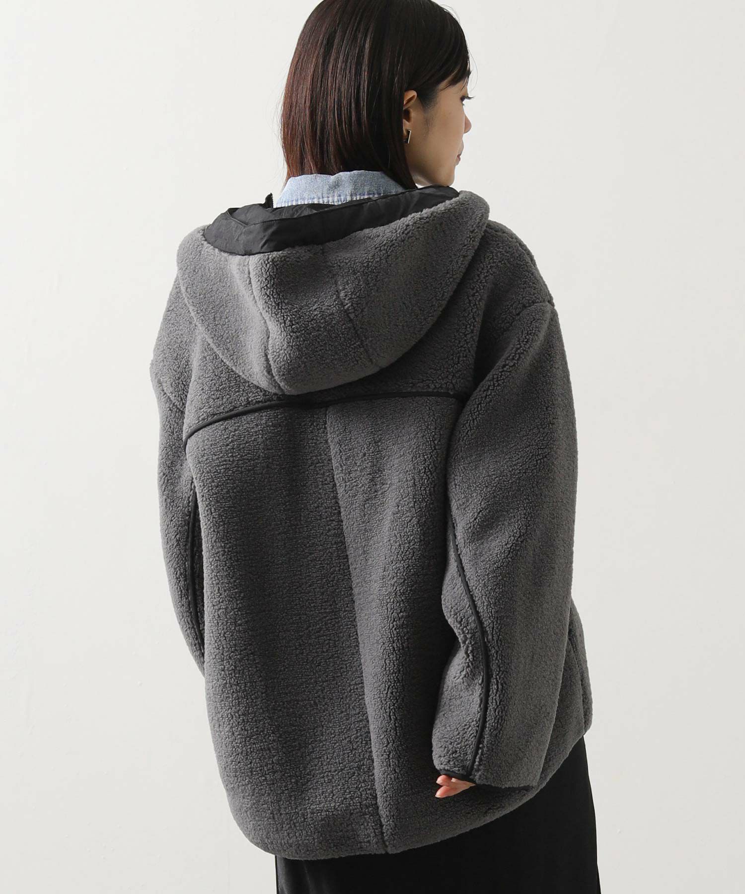 着た時に大きく見えないシルエットと、小顔に見せてくれる絶妙なフードデザイン。