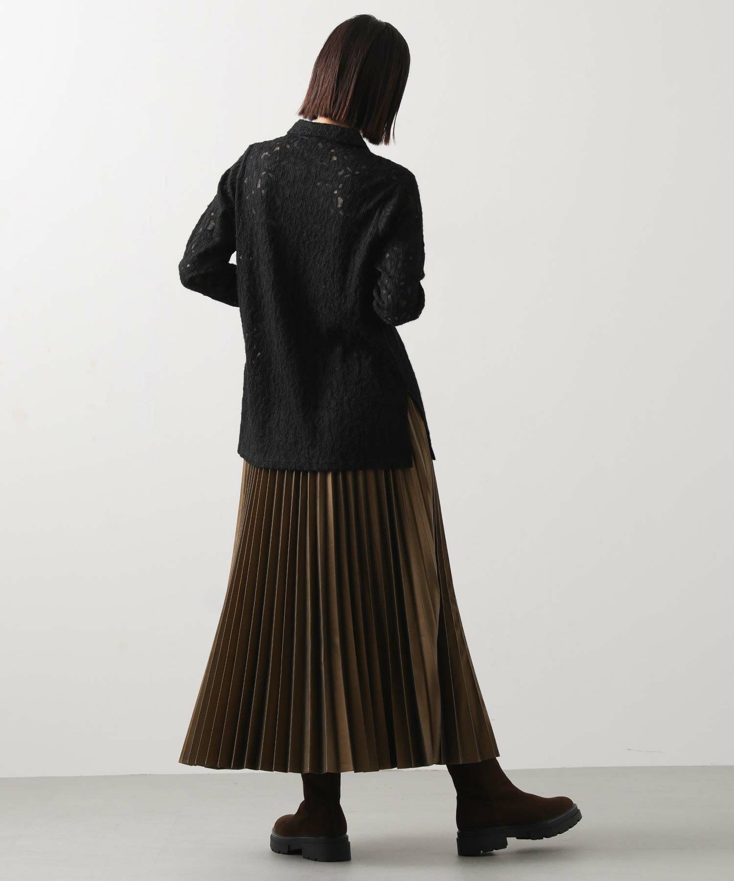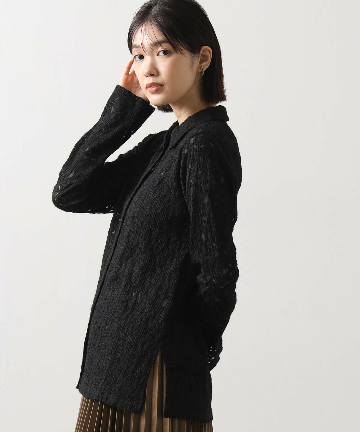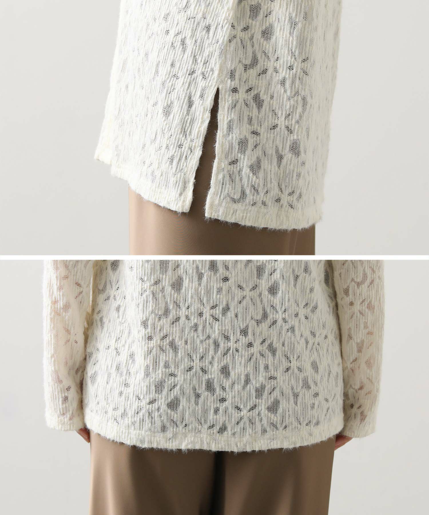 起毛したストレッチレース素材が柔らかく女性らしい印象を与え、インナーやボトム次第でさまざまなカジュアルスタイルに合わせやすいアイテム。
