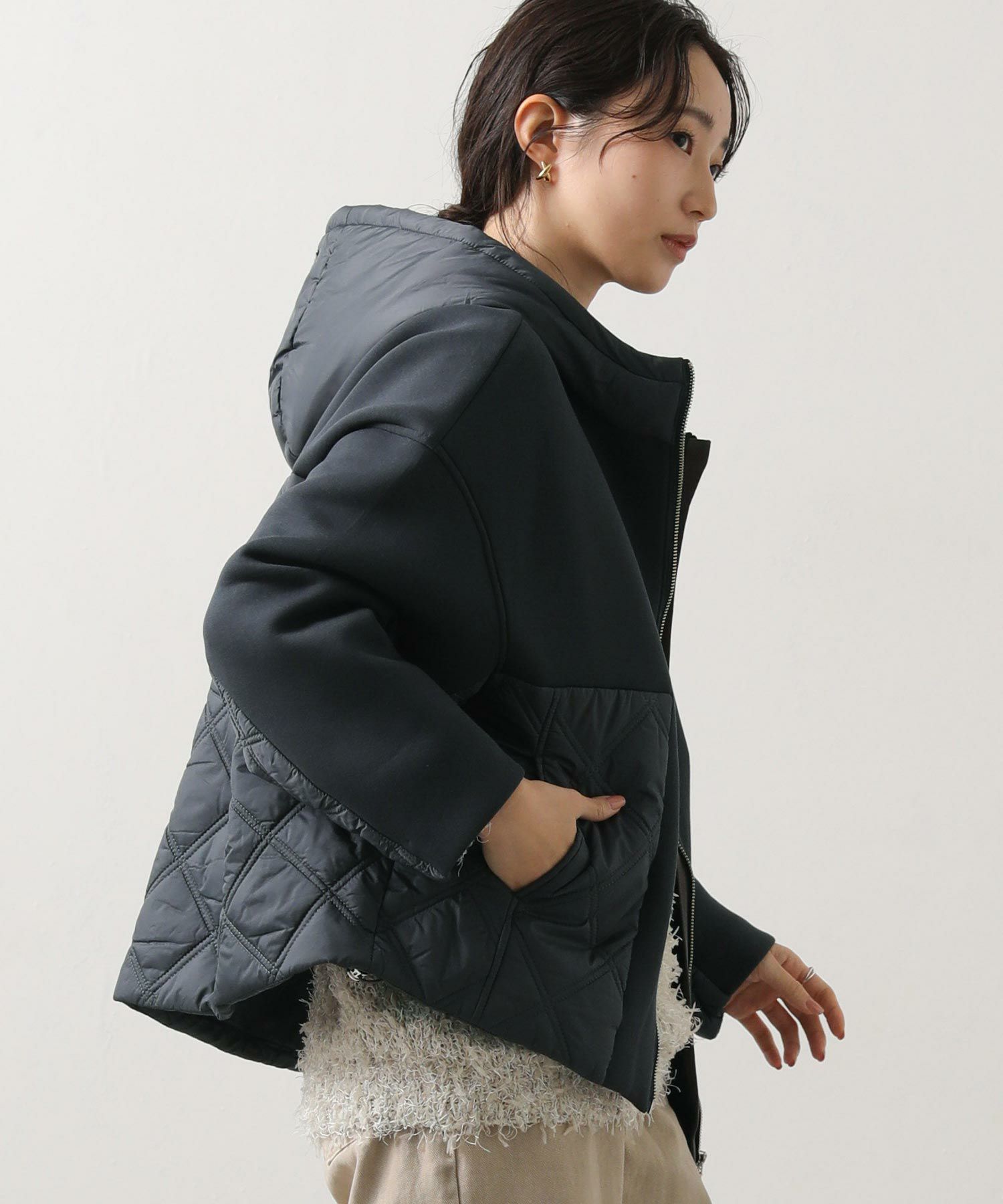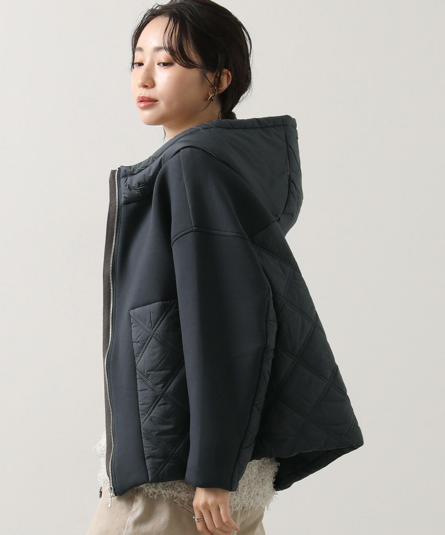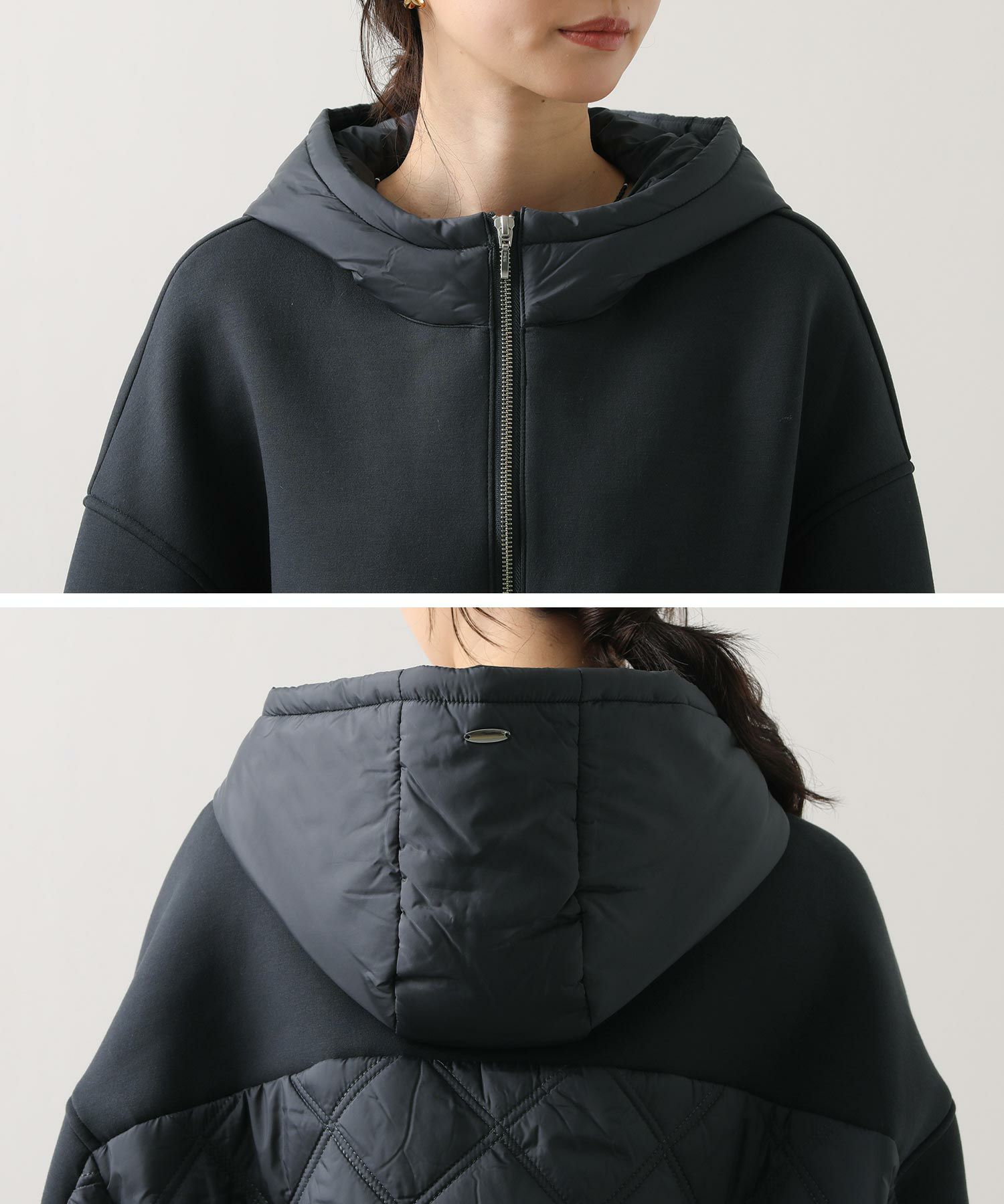 サイドや後身頃、フードのキルティング切替がアクセントに。