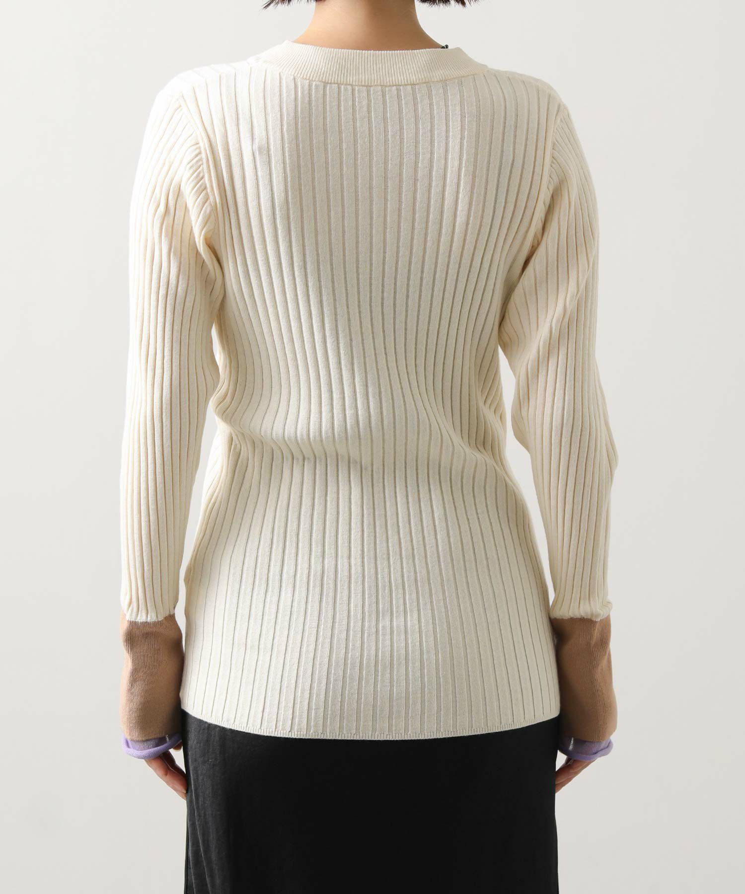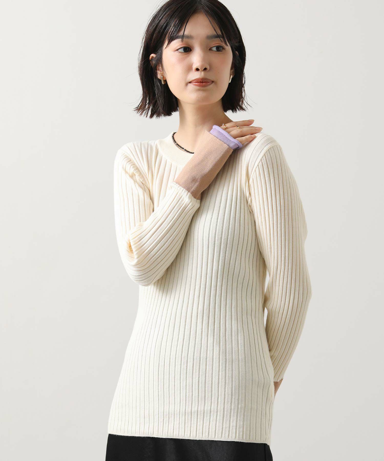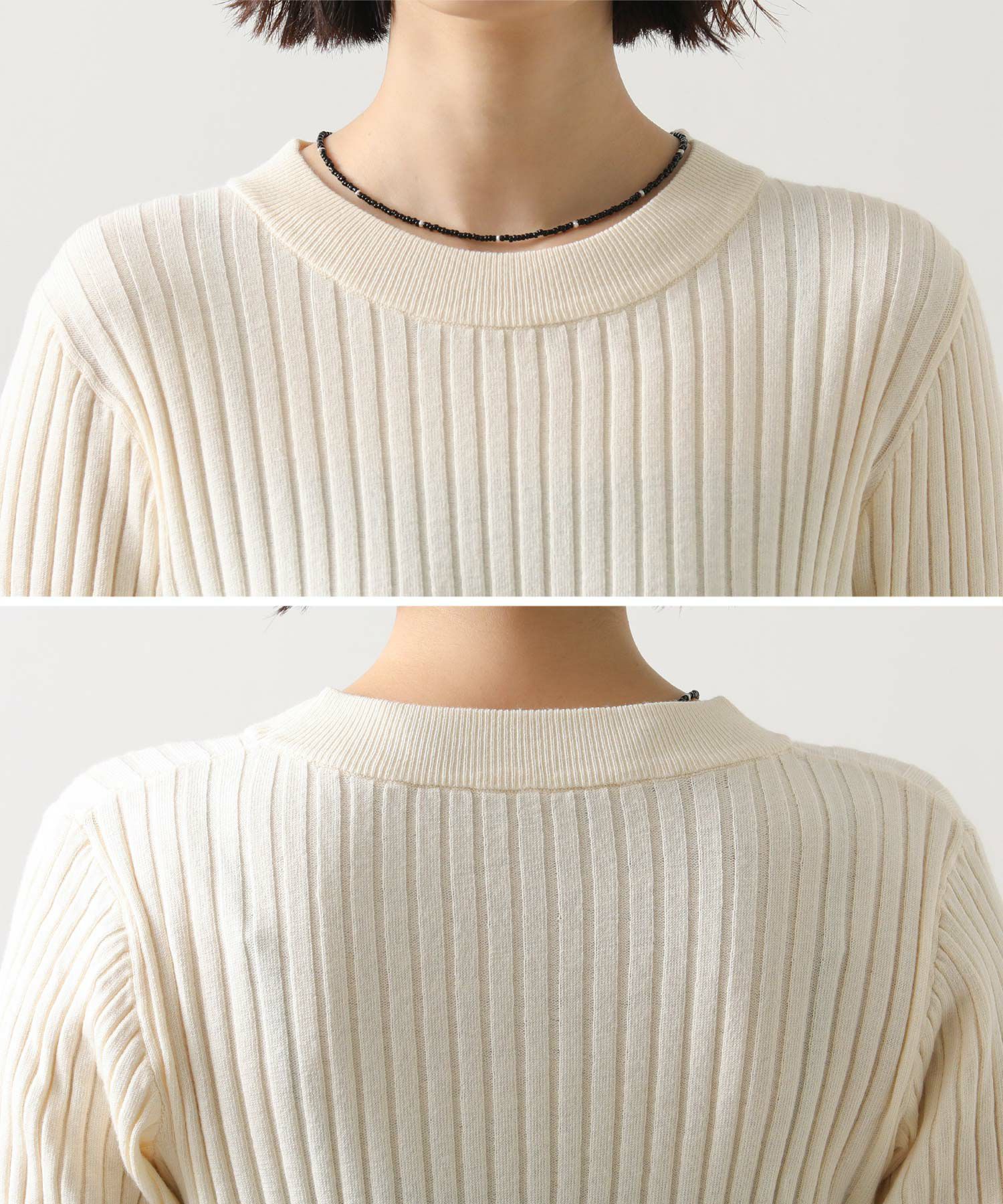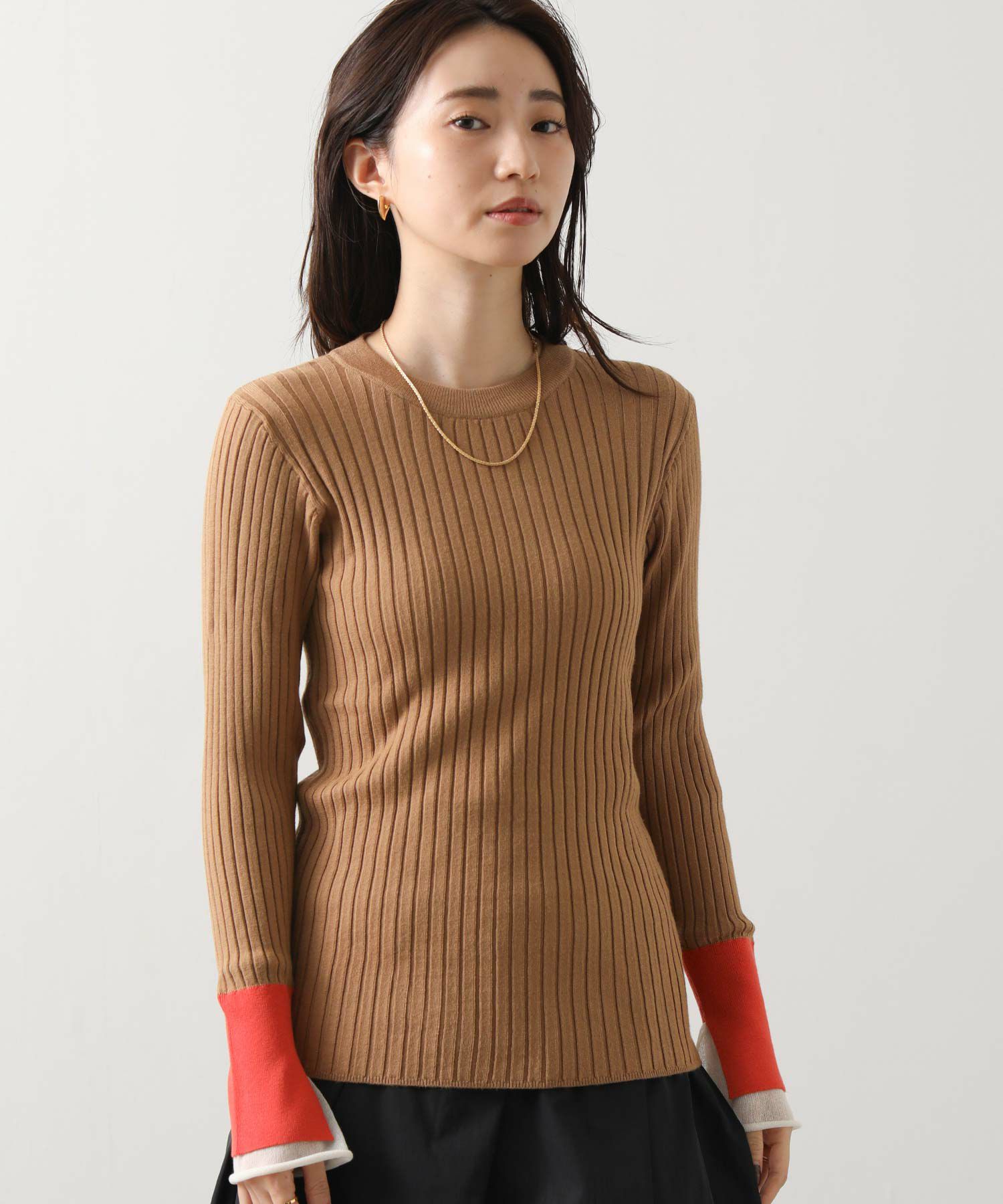 縦ラインを強調するワイドリブが、すっきりとした印象を与えるニットトップス。