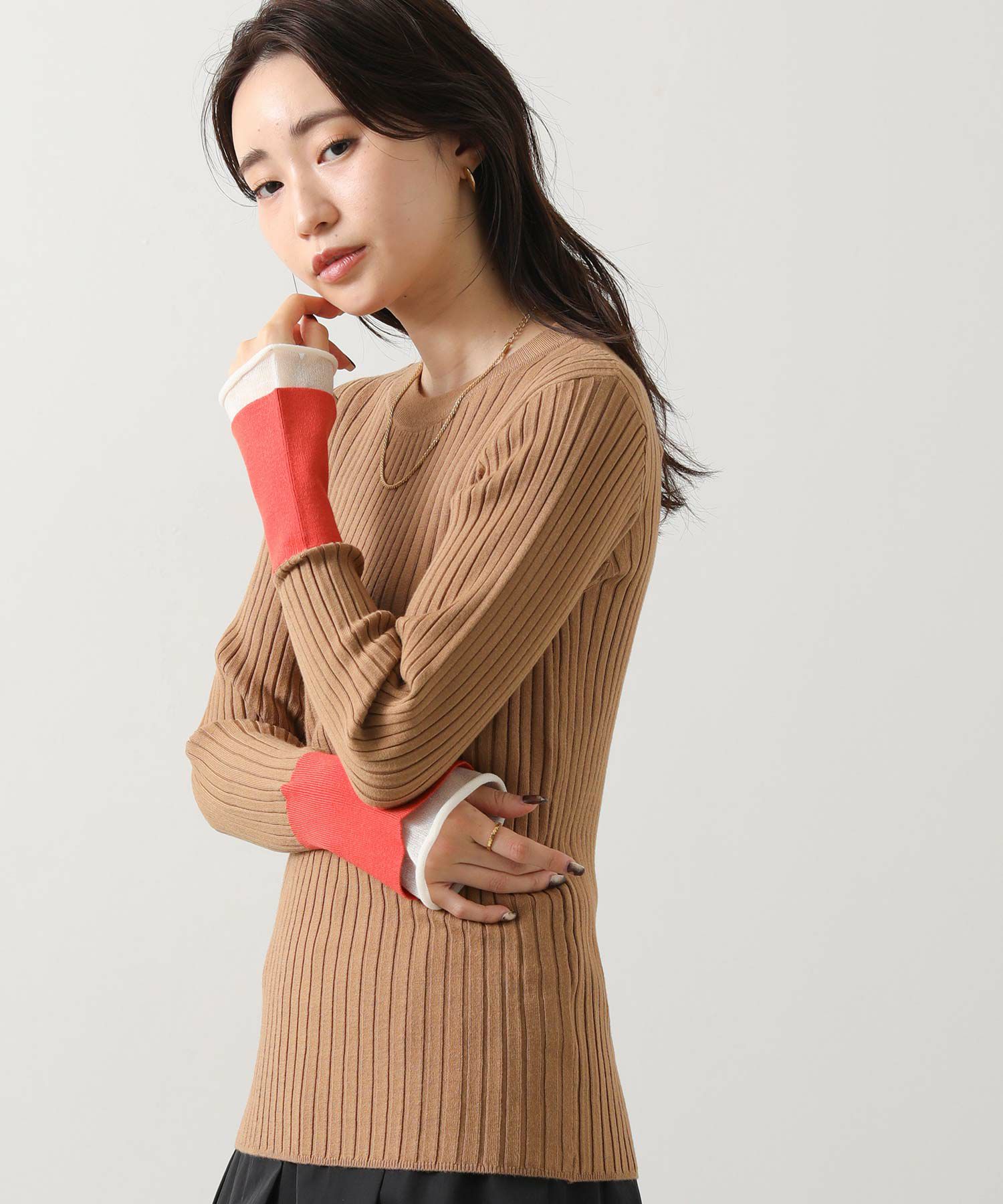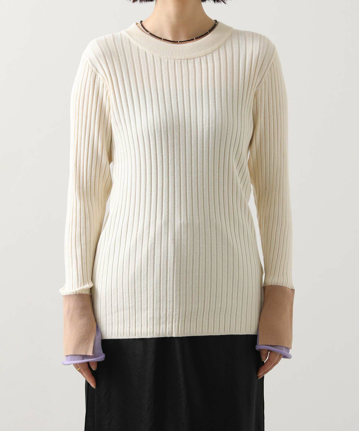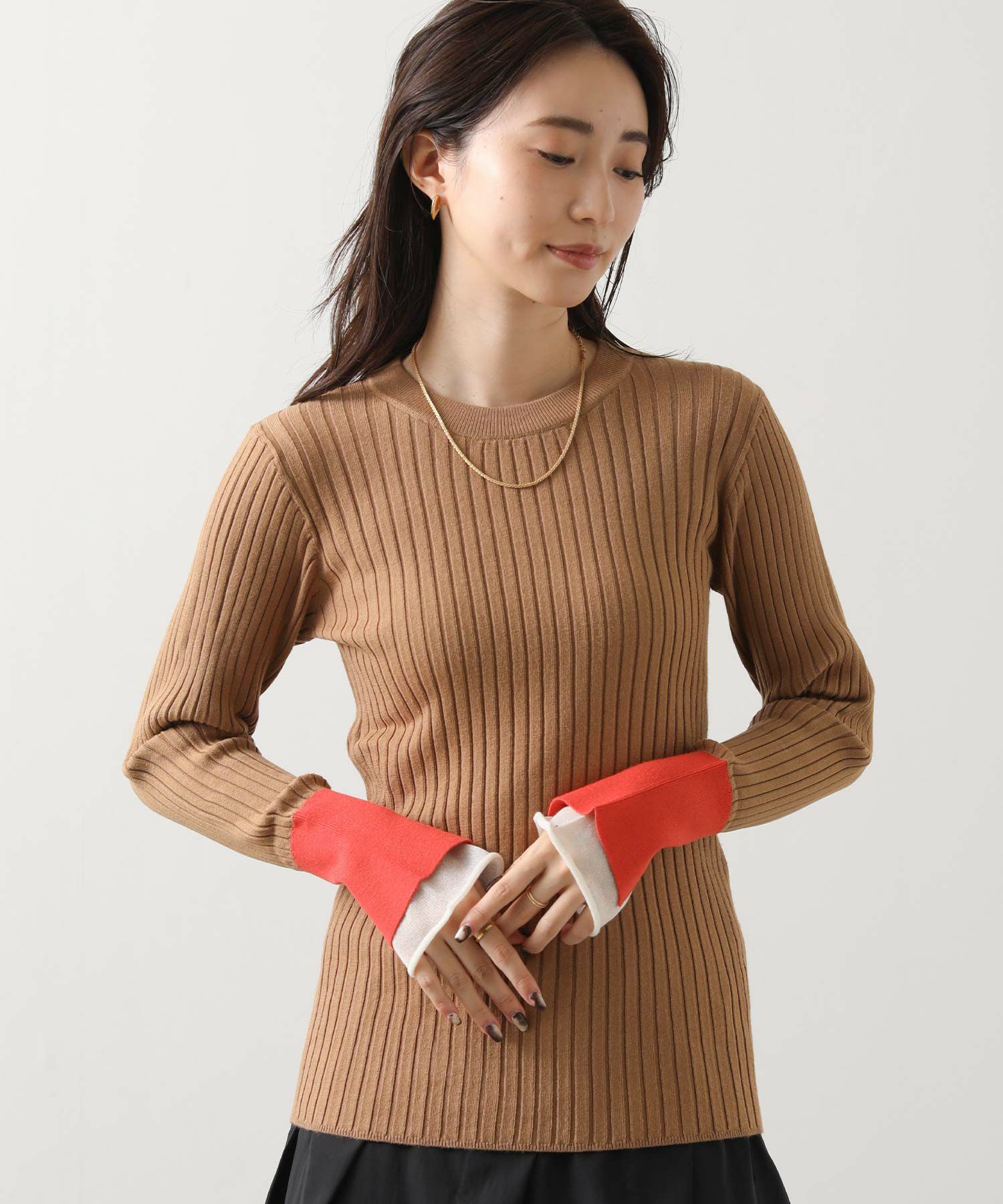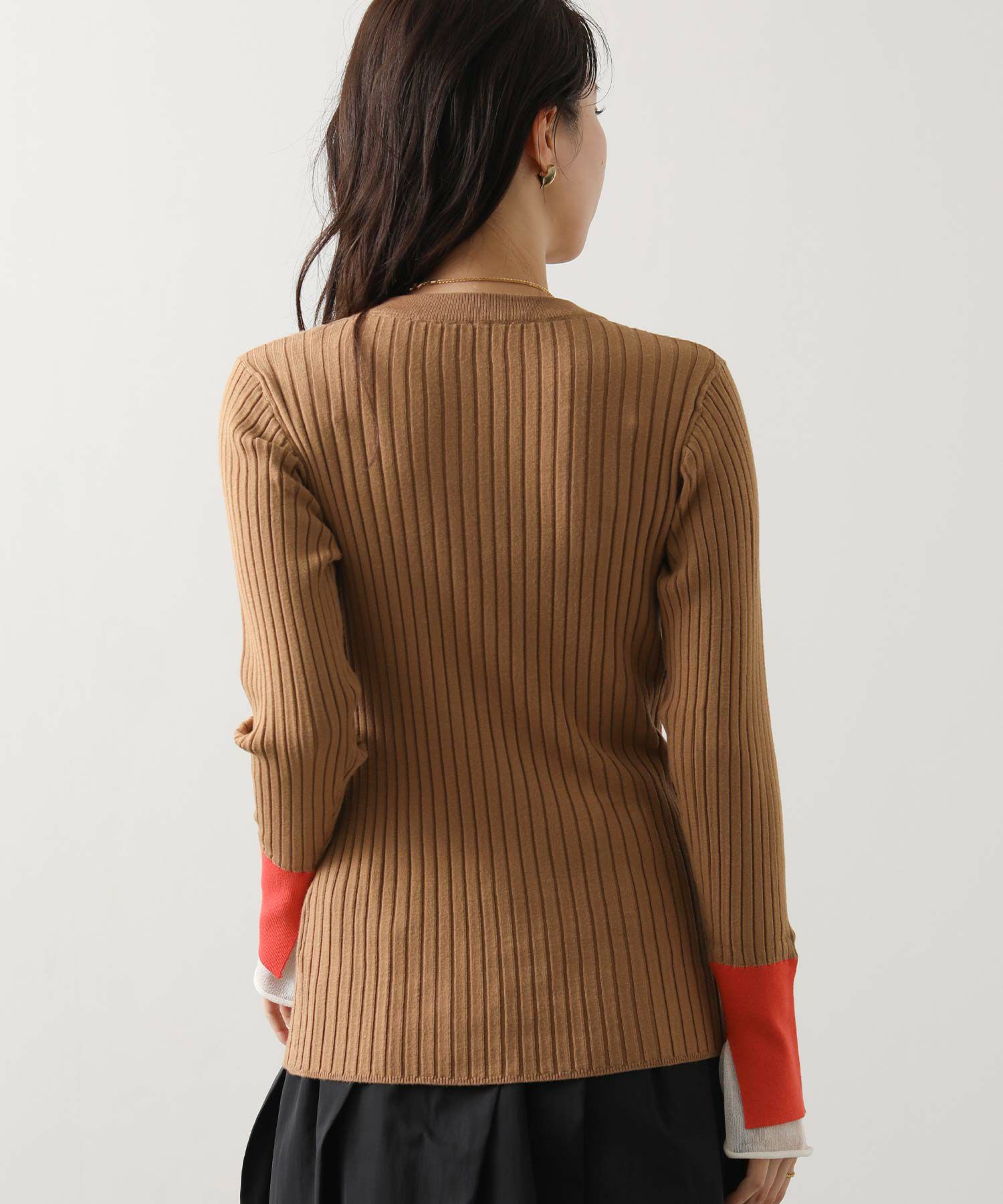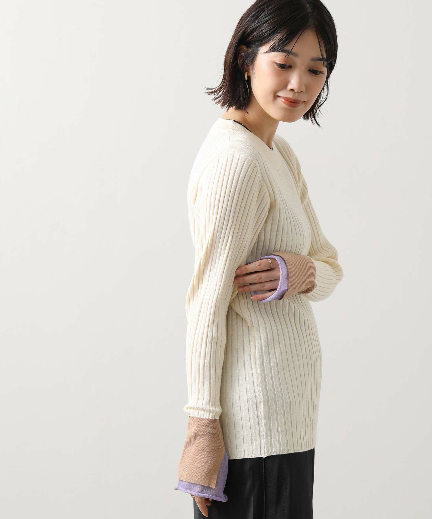 縦ラインを強調するワイドリブが、すっきりとした印象を与えるニットトップス。