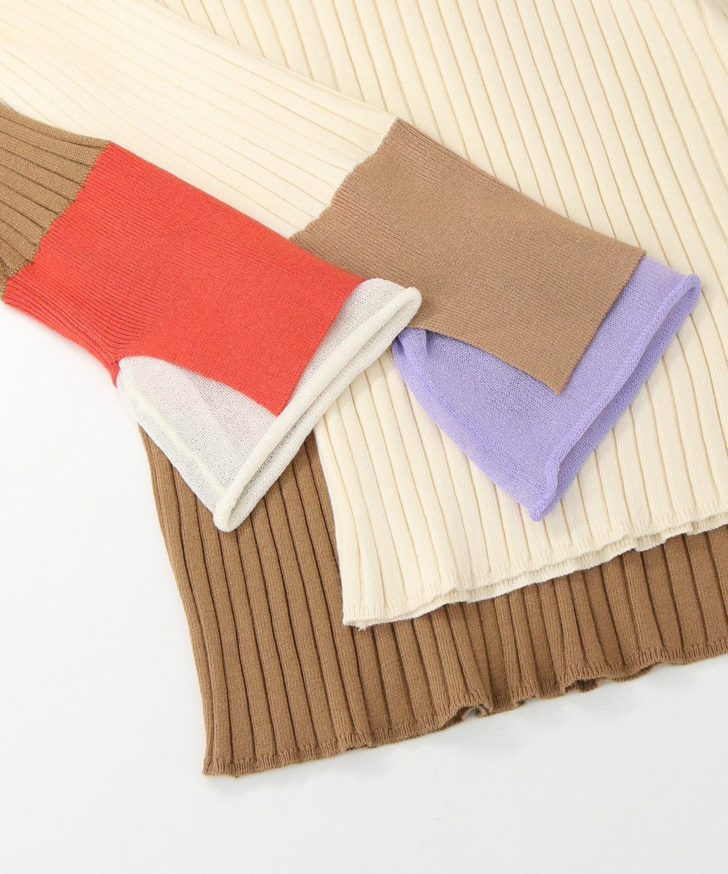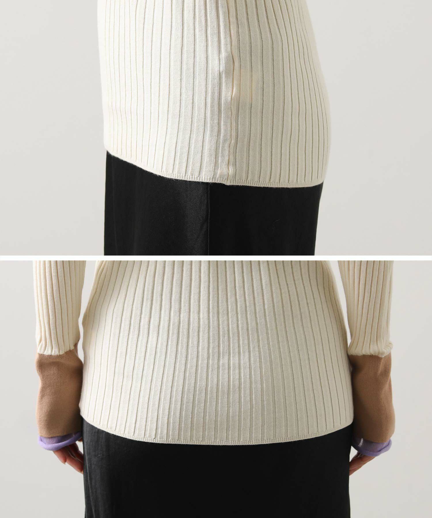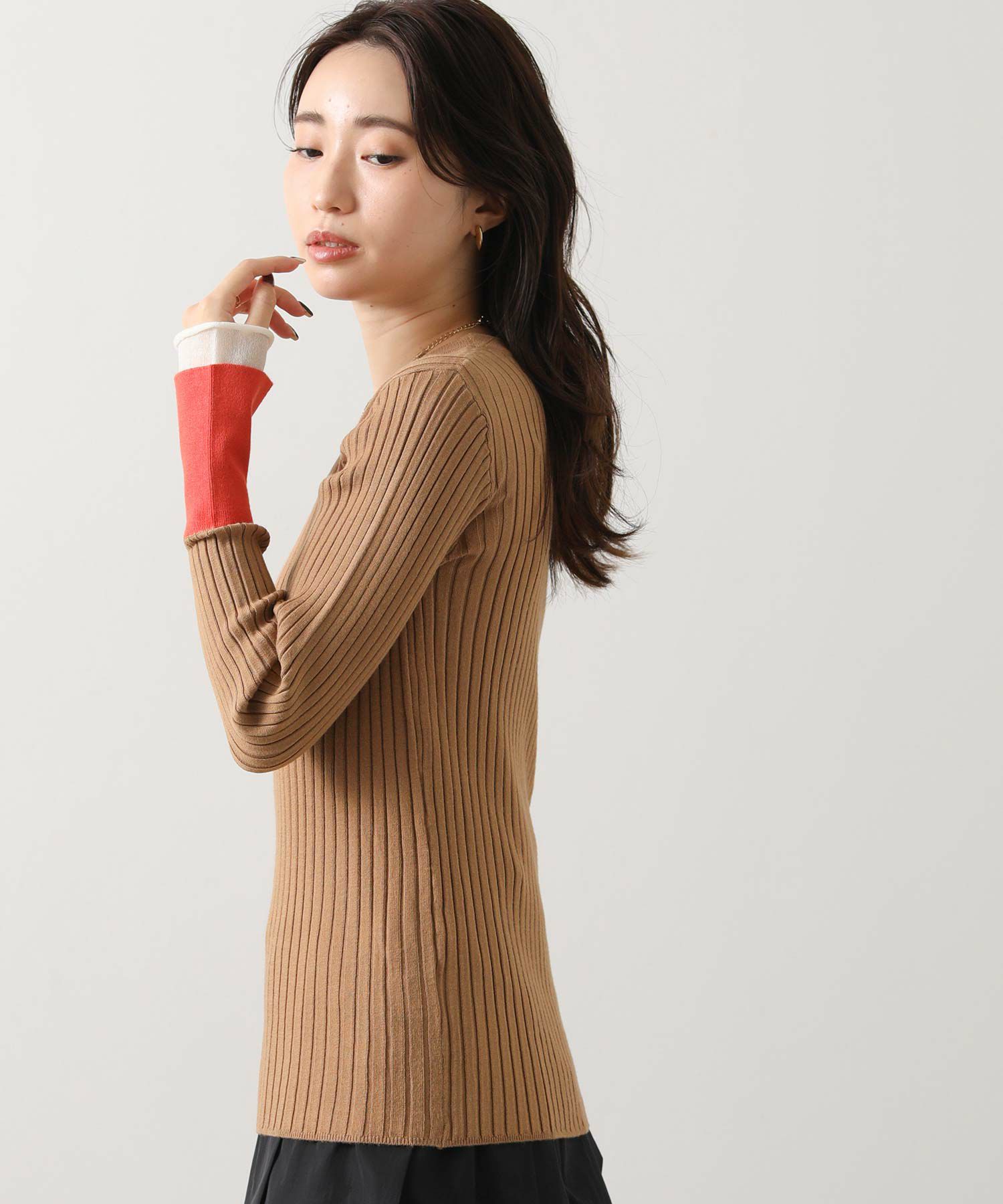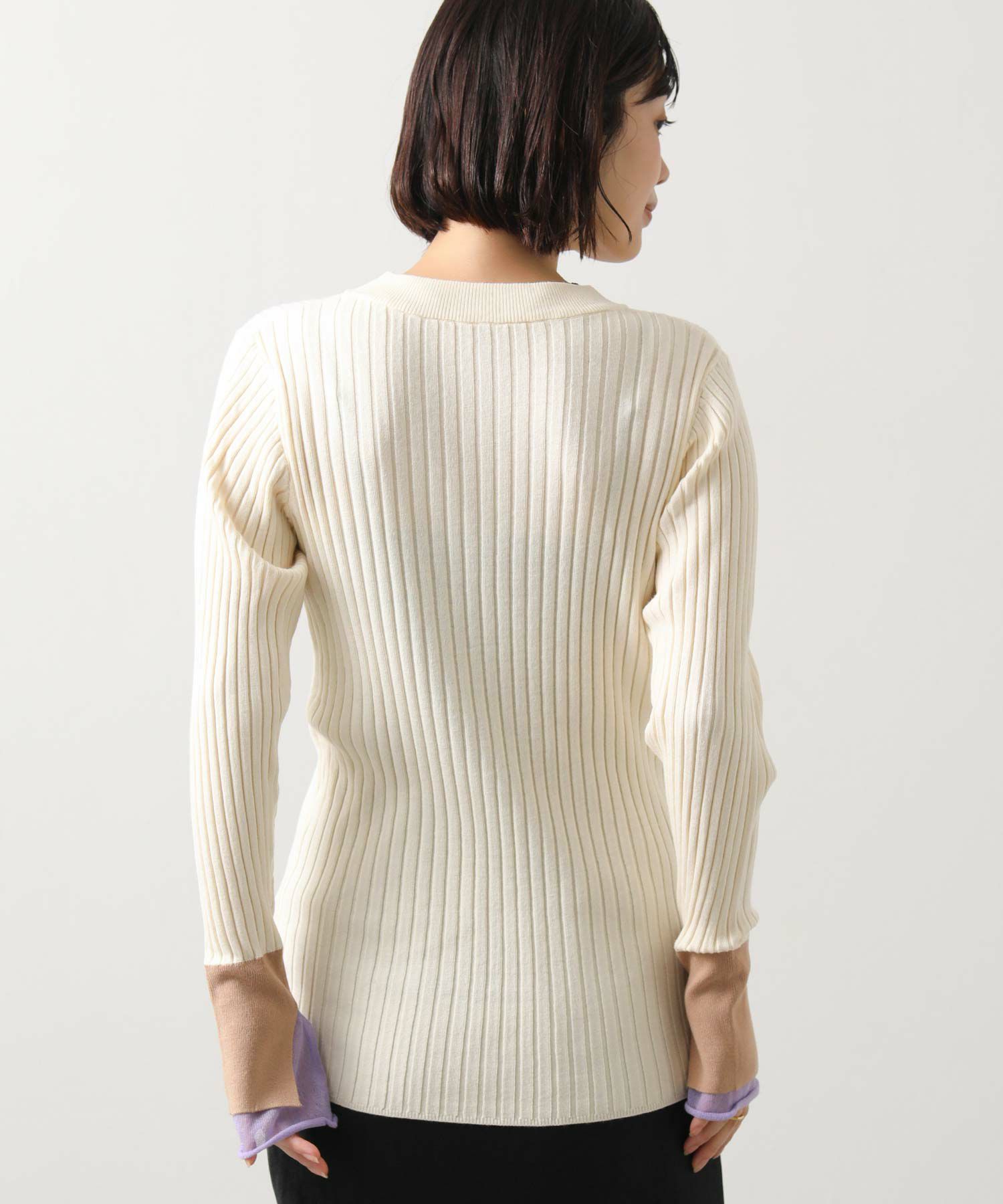 縦ラインを強調するワイドリブが、すっきりとした印象を与えるニットトップス。