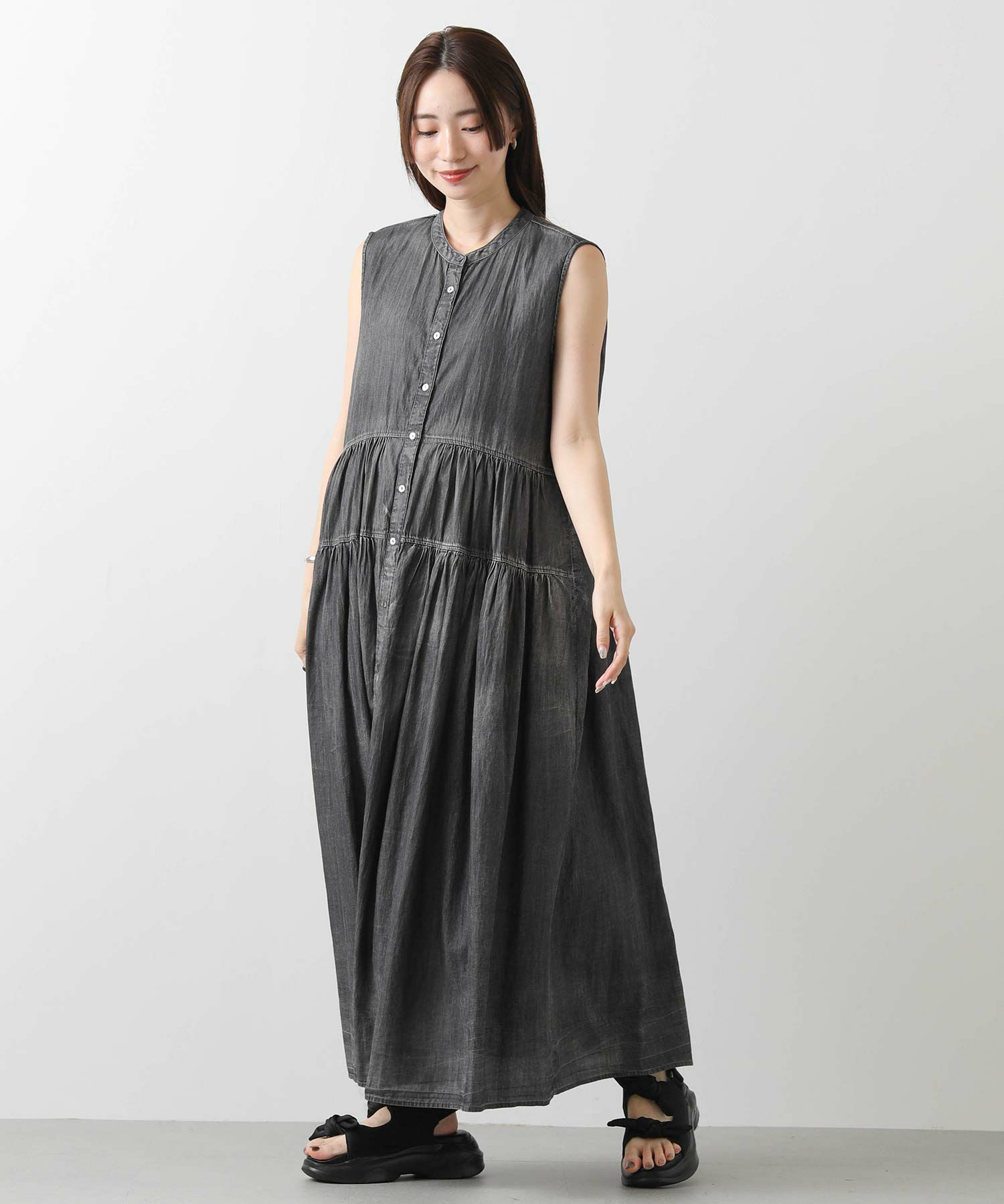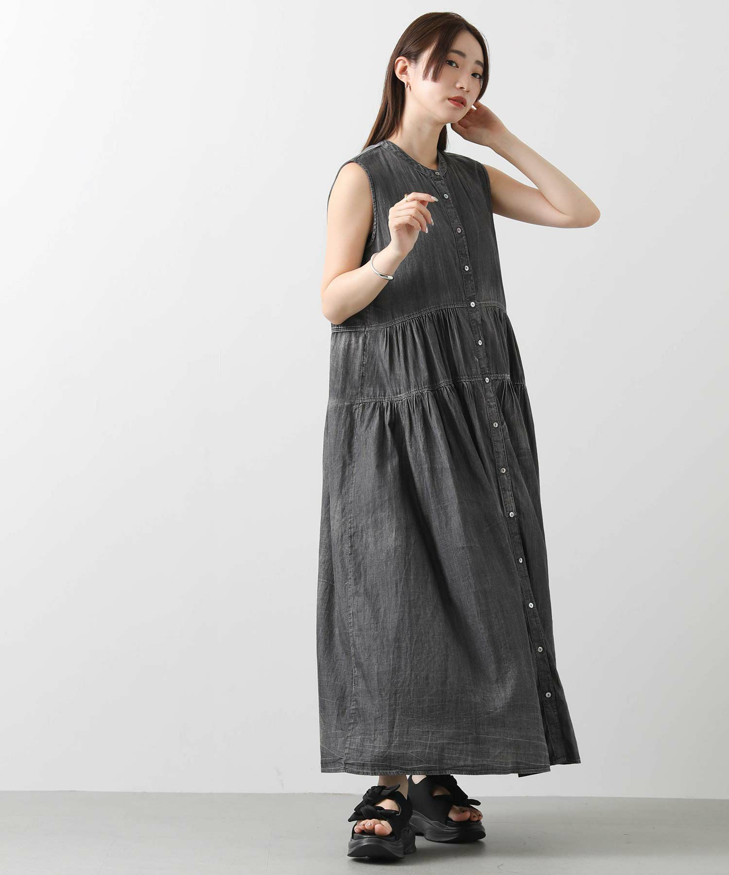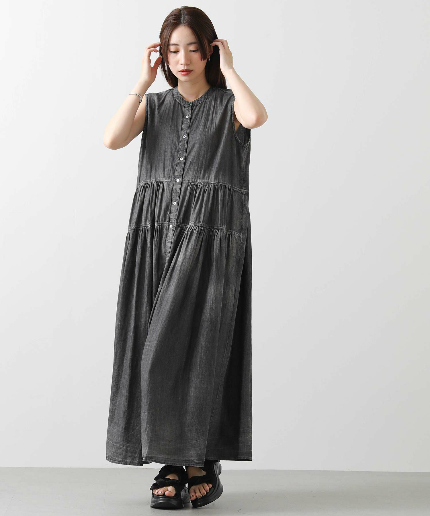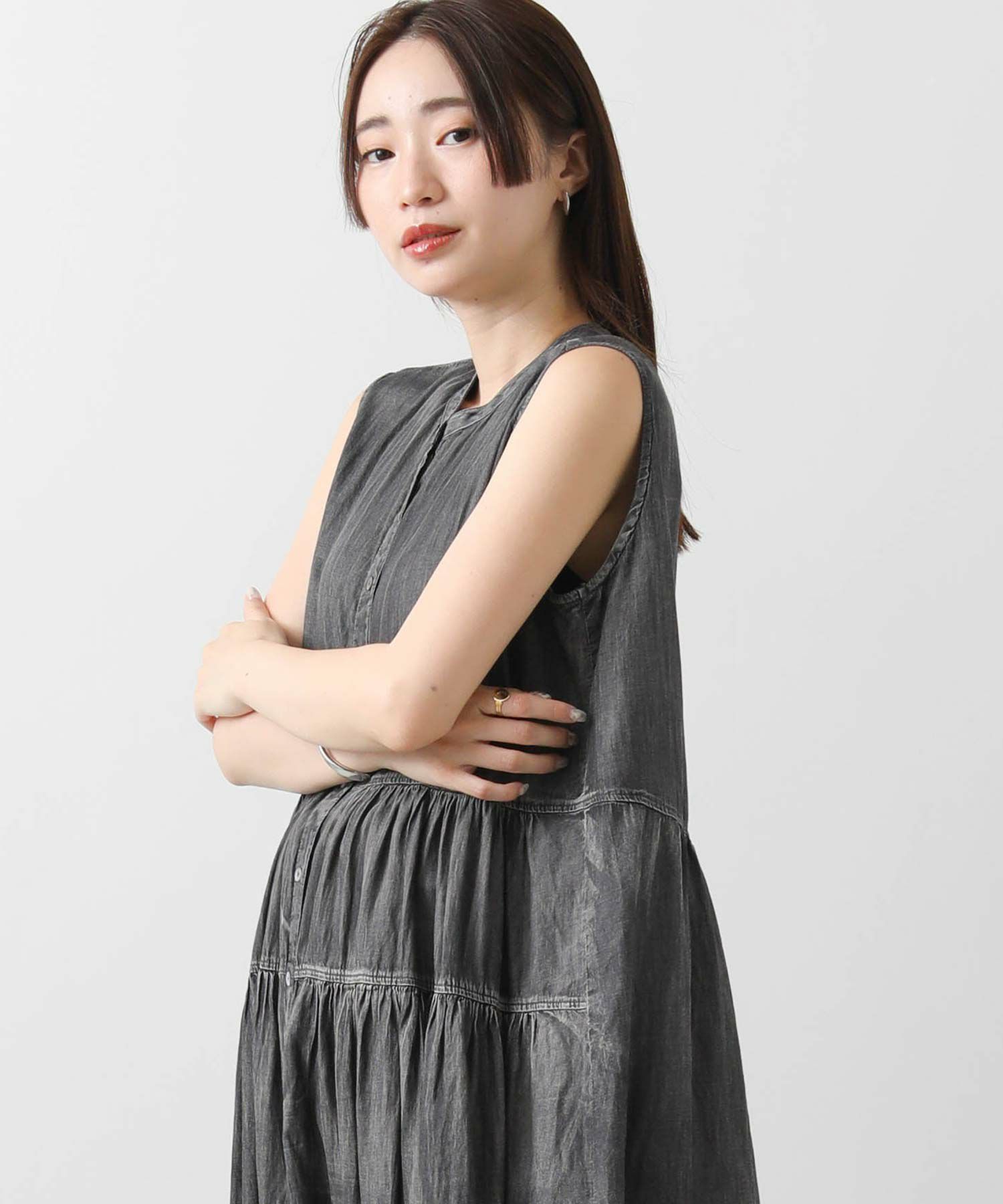 色落ち加工を施して、こなれ感のあるノースリーブティアードワンピに仕上げました。