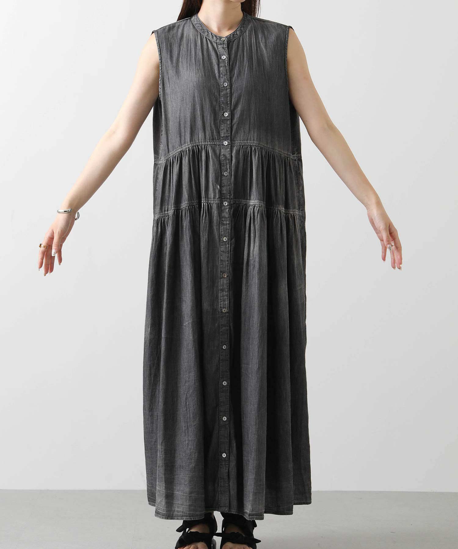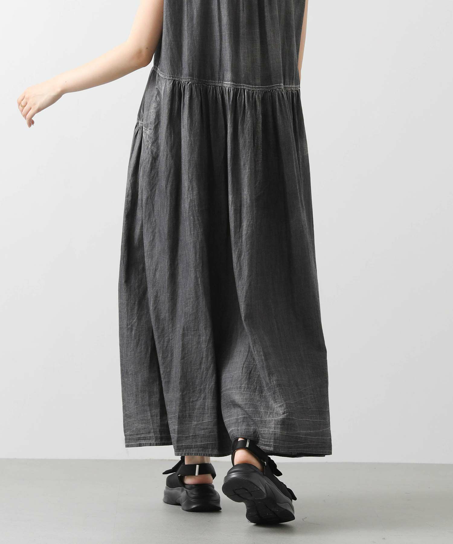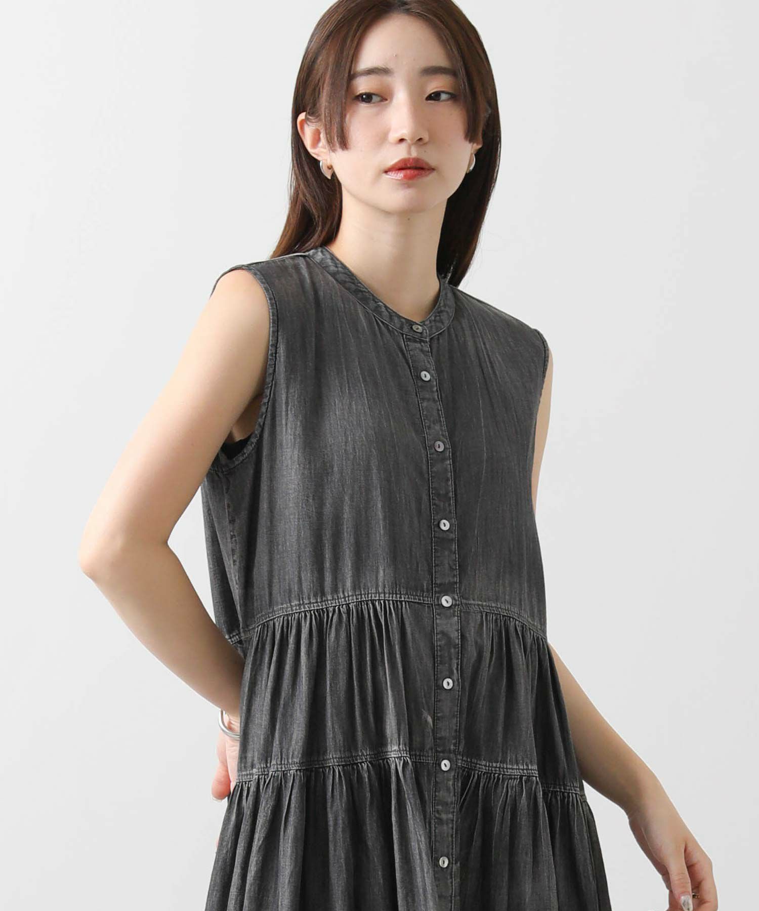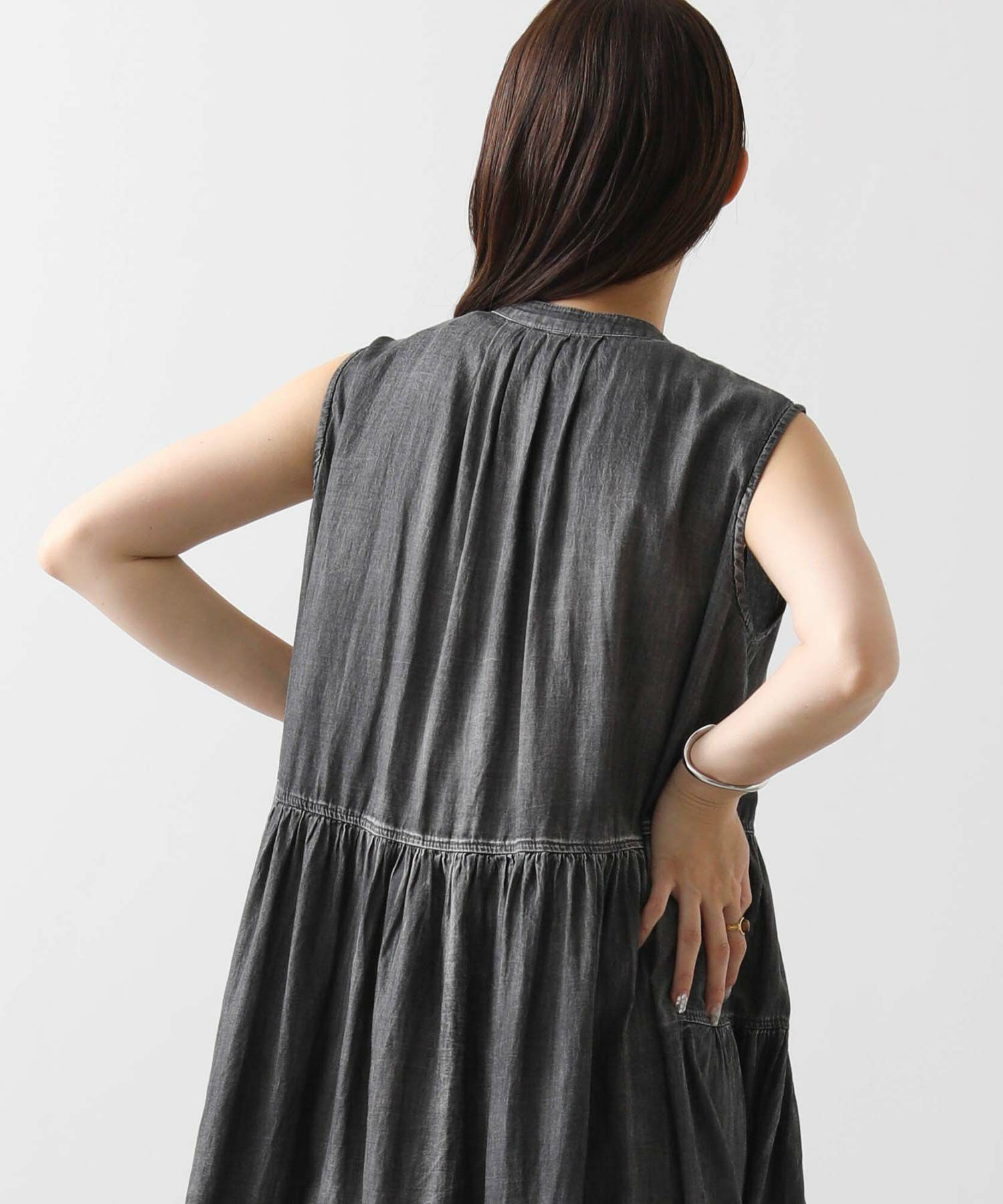 色落ち加工を施して、こなれ感のあるノースリーブティアードワンピに仕上げました。