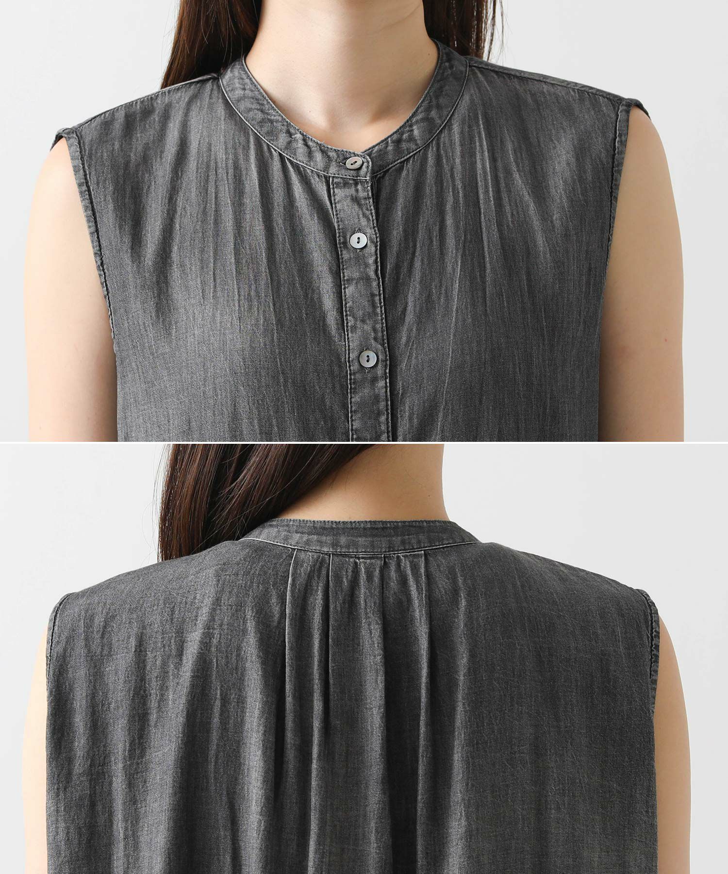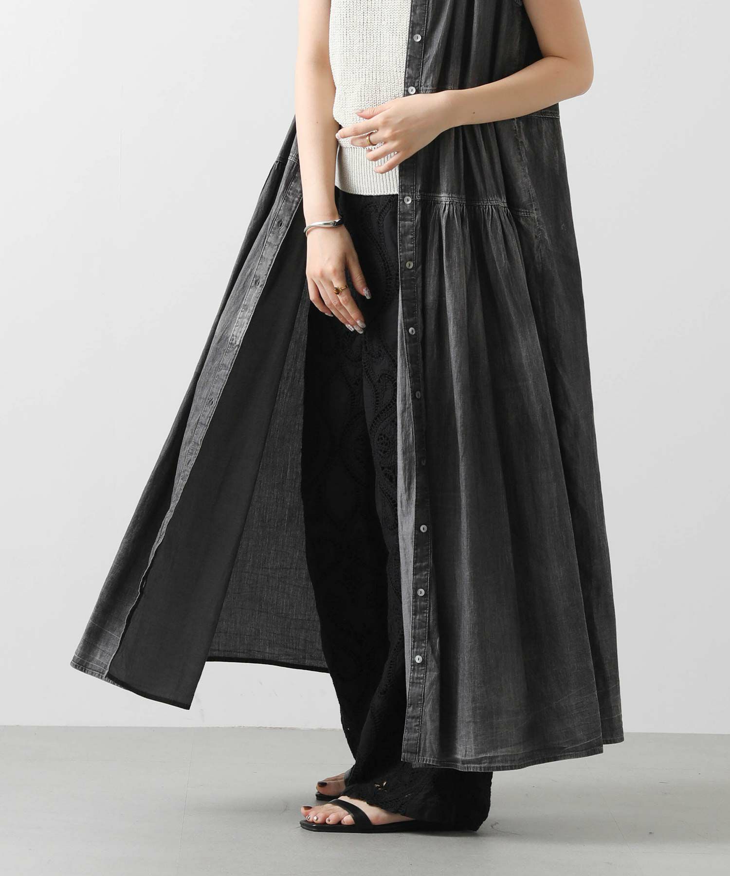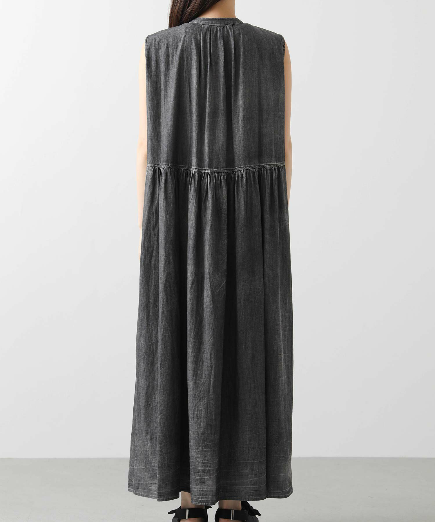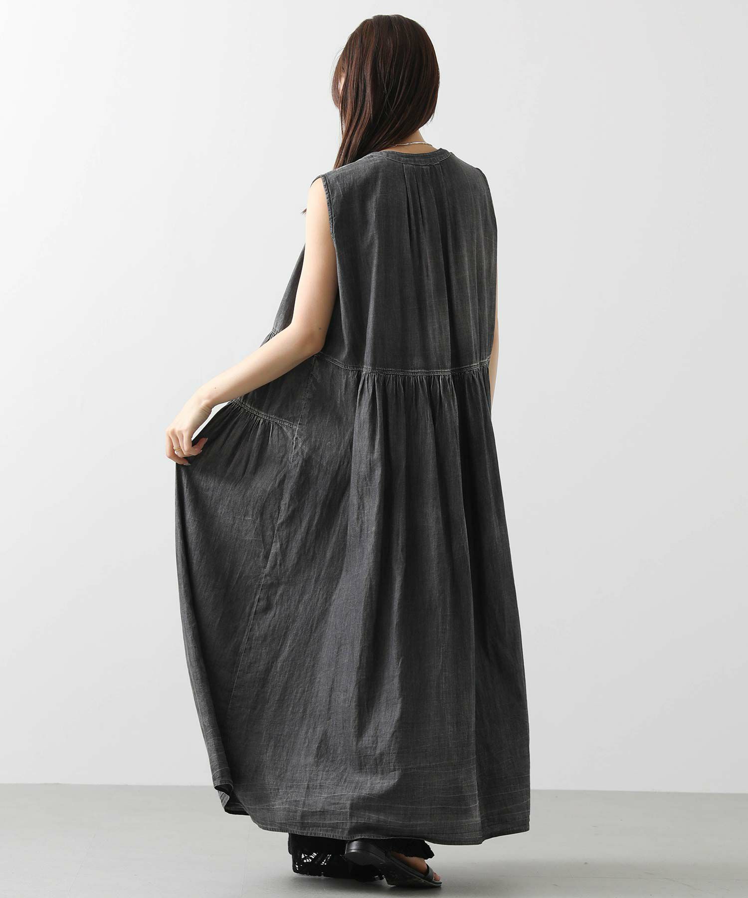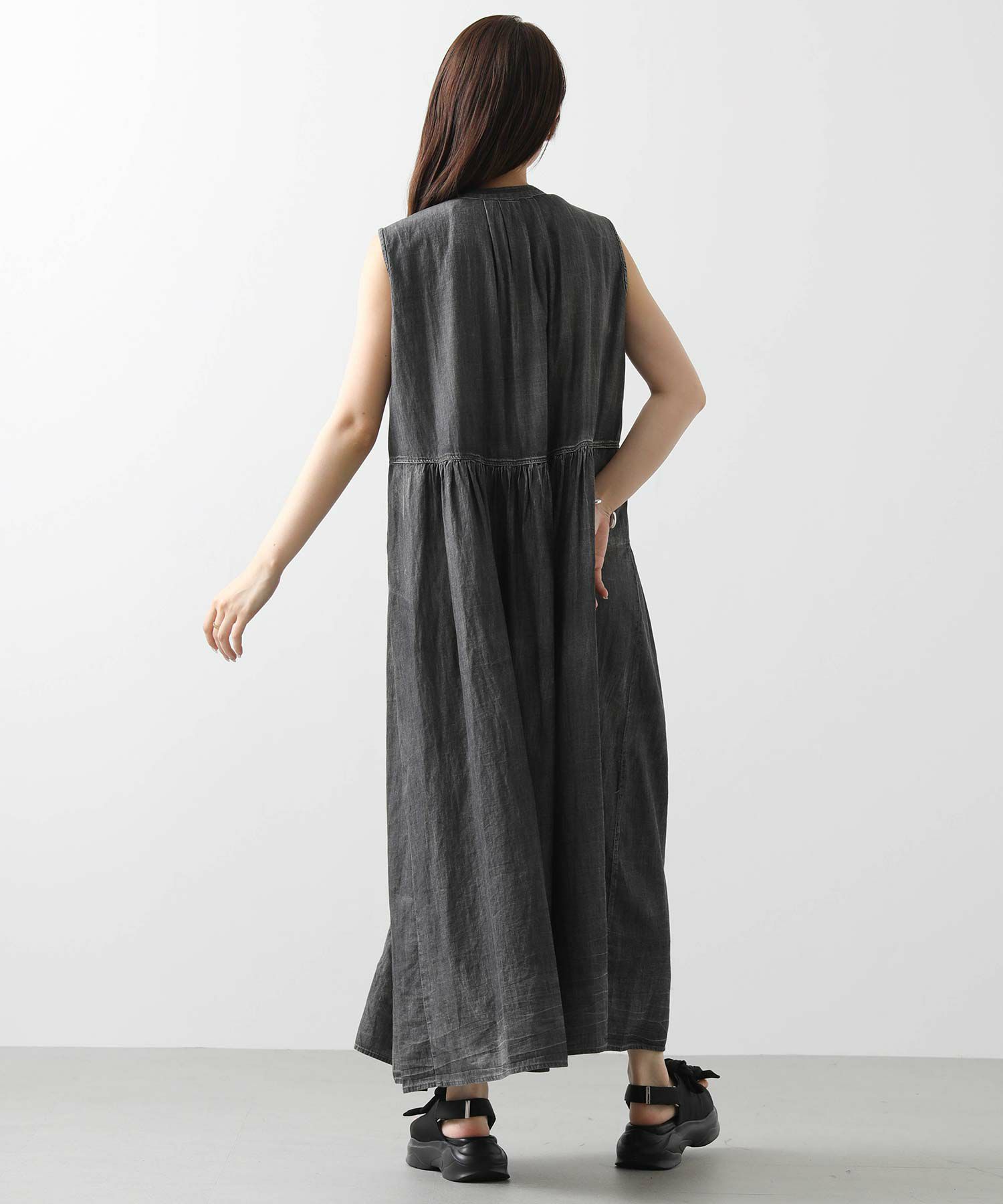 色落ち加工を施して、こなれ感のあるノースリーブティアードワンピに仕上げました。