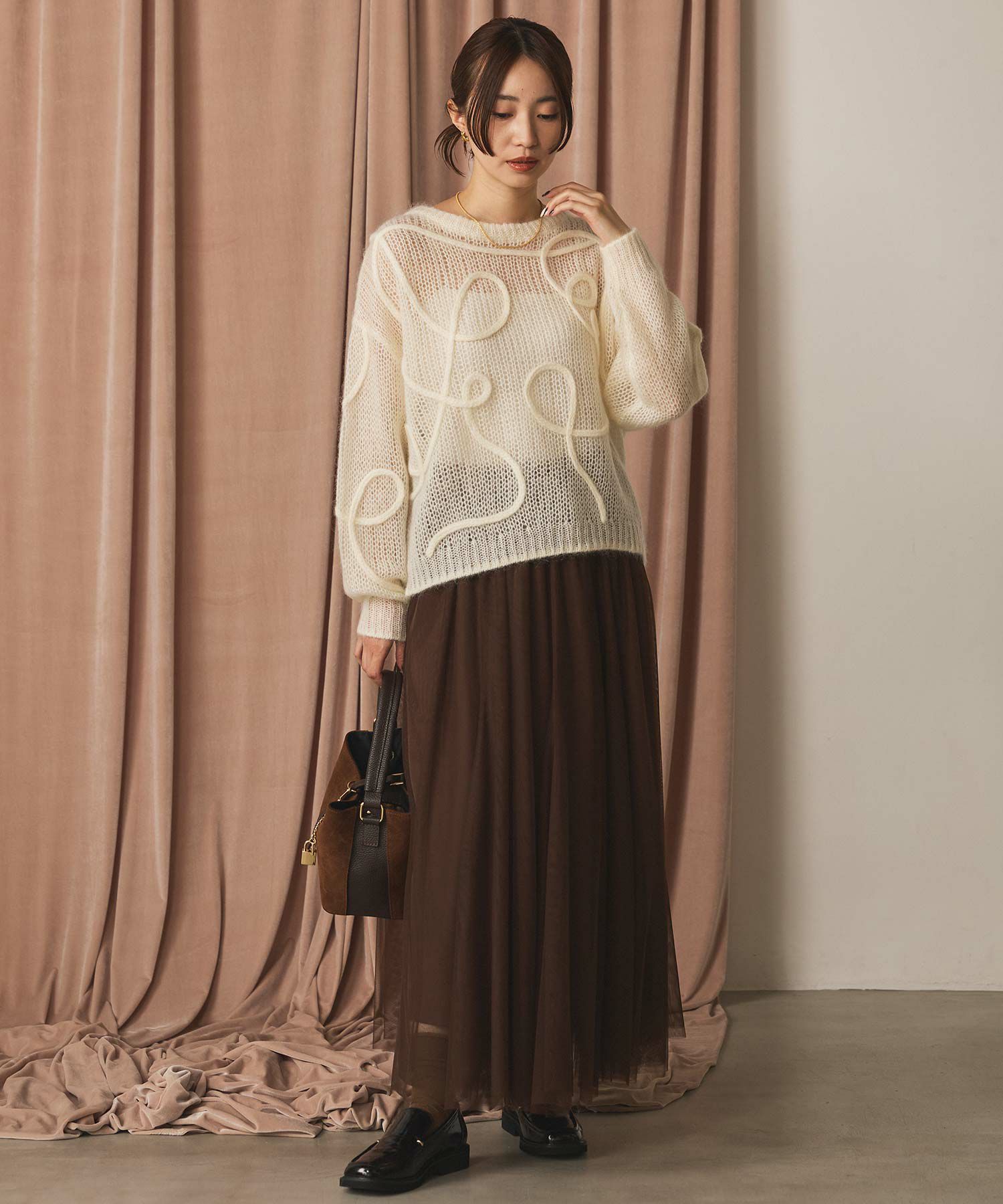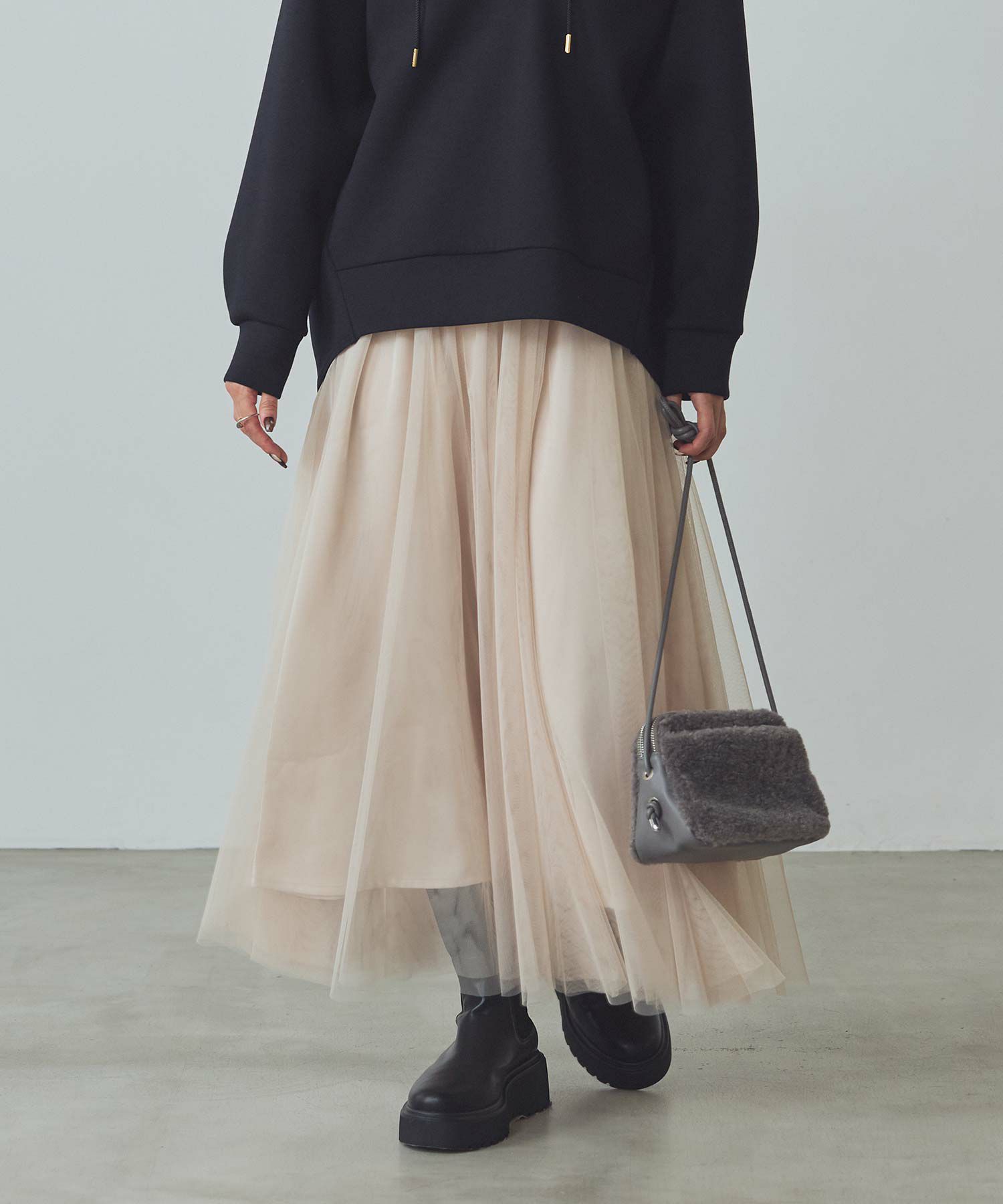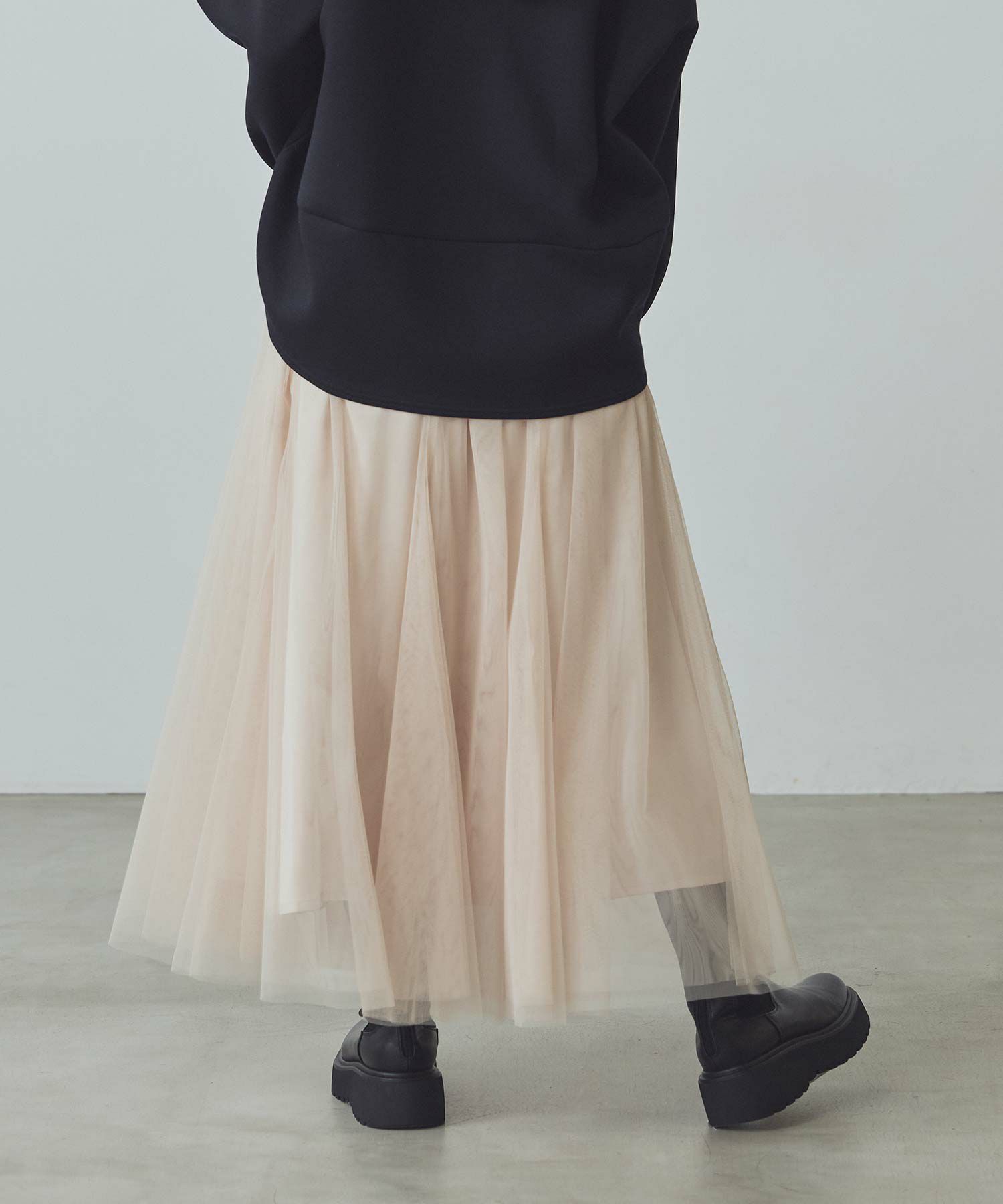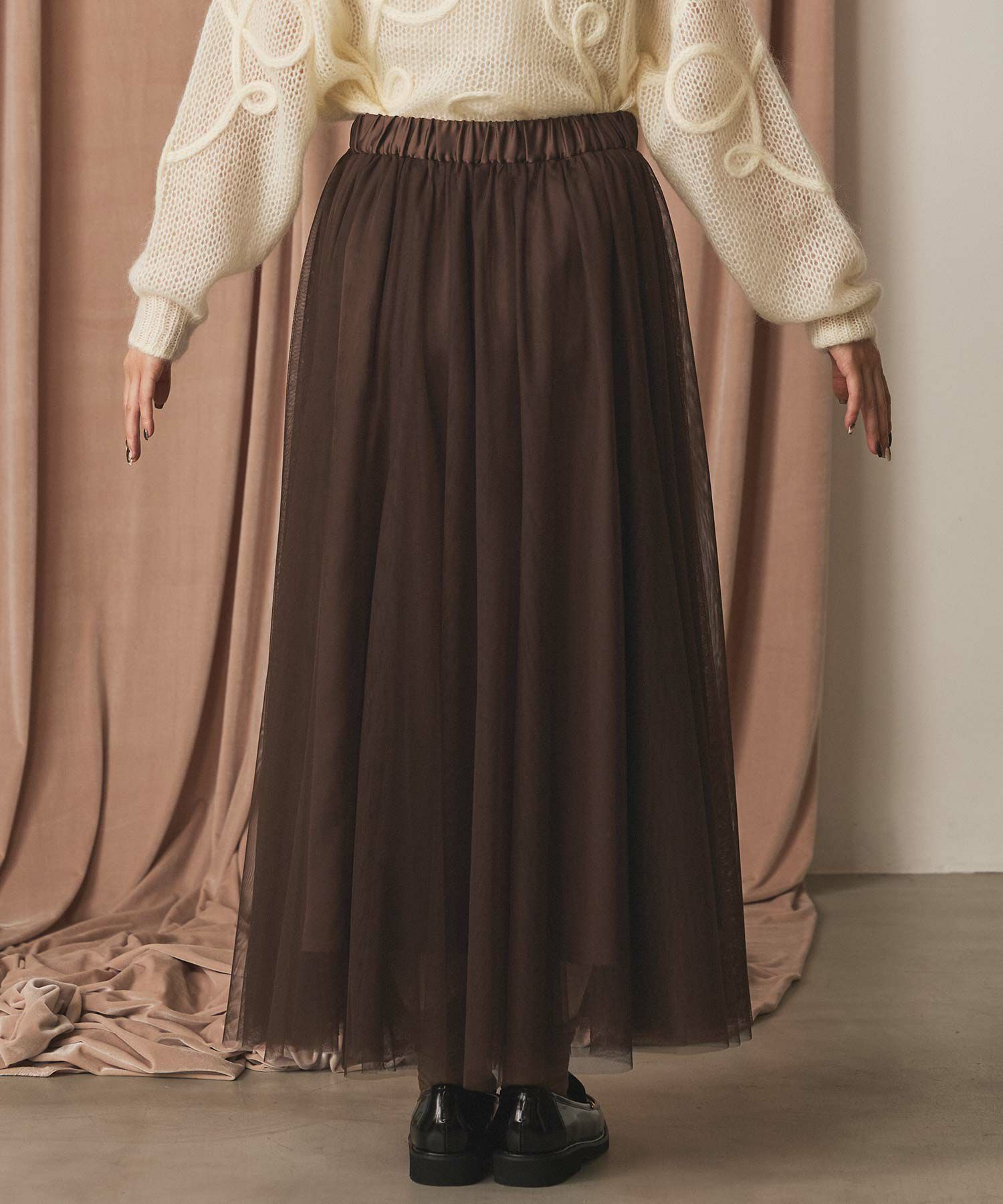 ふうわりと程よく広がるチュール素材を使用したボリュームのあるスカート。