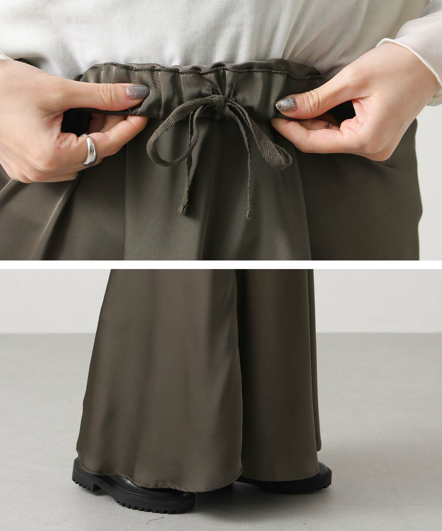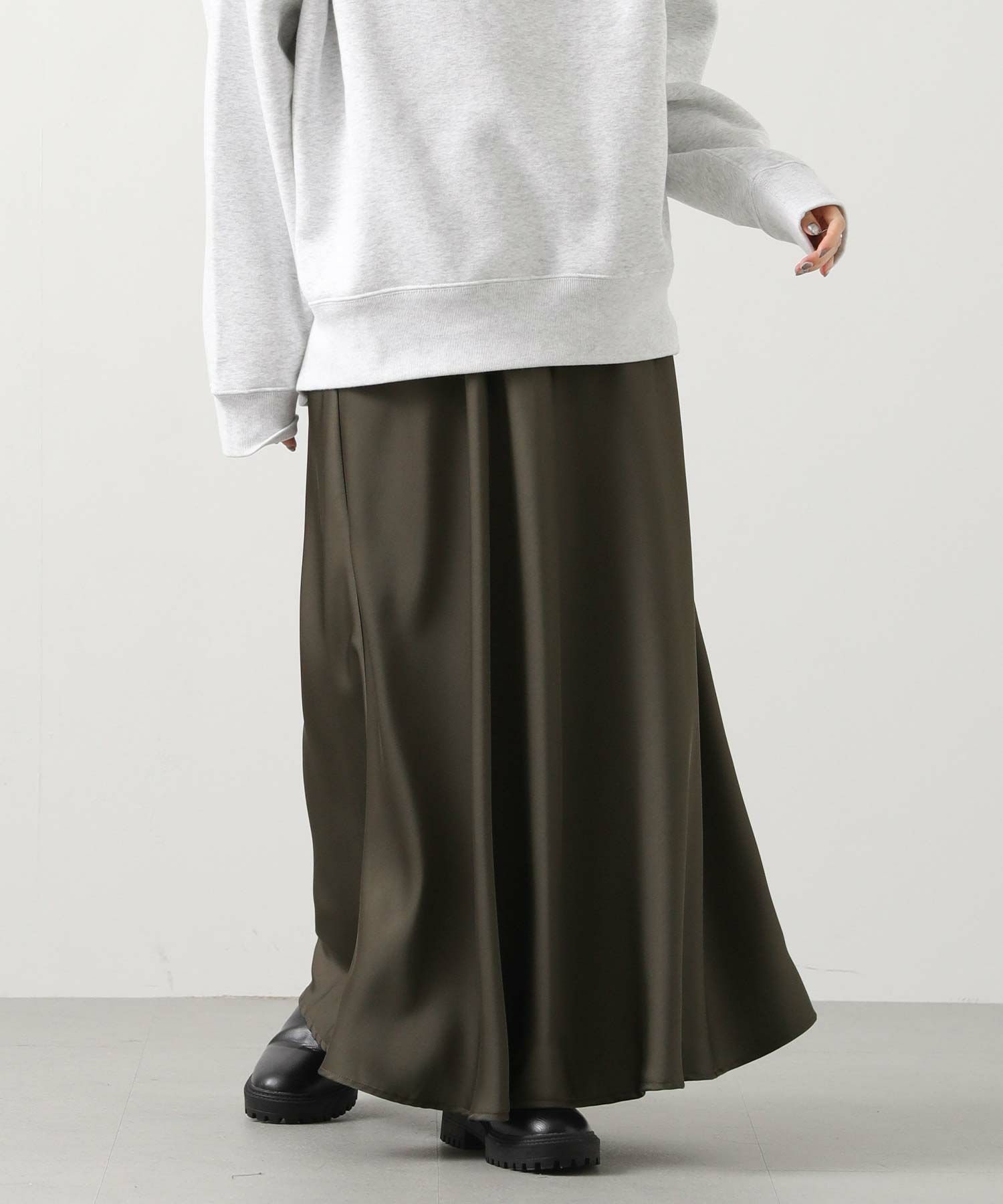 きれいなフレアシルエットの出るサテン生地スカート。