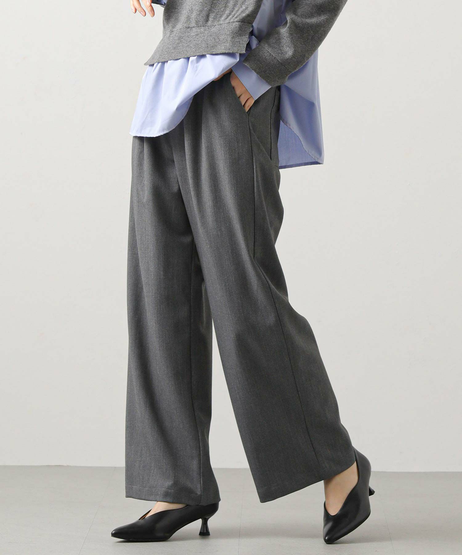 ウエスト総ゴムのイージーパンツながらきちんと見えする素材感なので、普段使いからオフィスでも着られるアイテム。