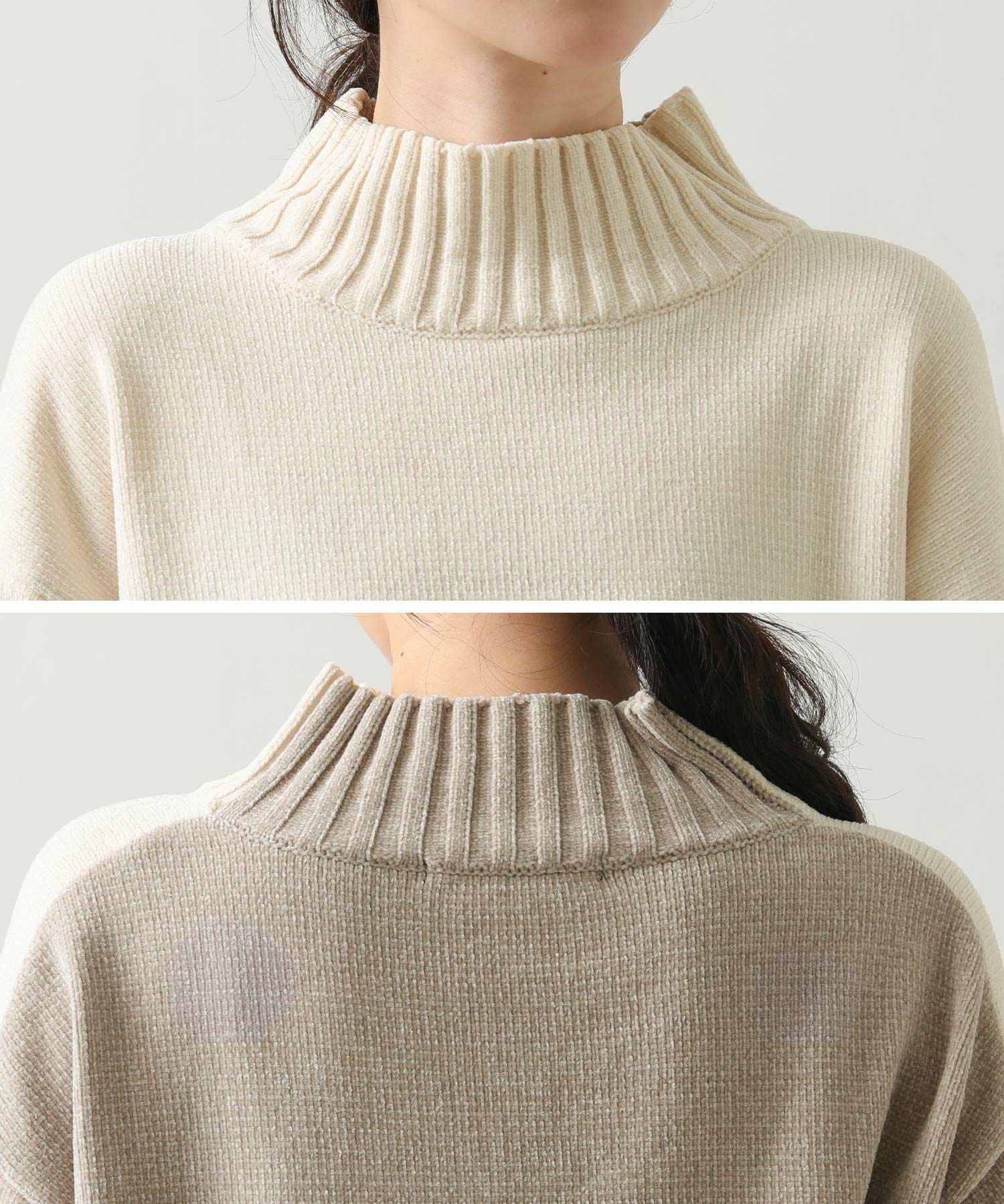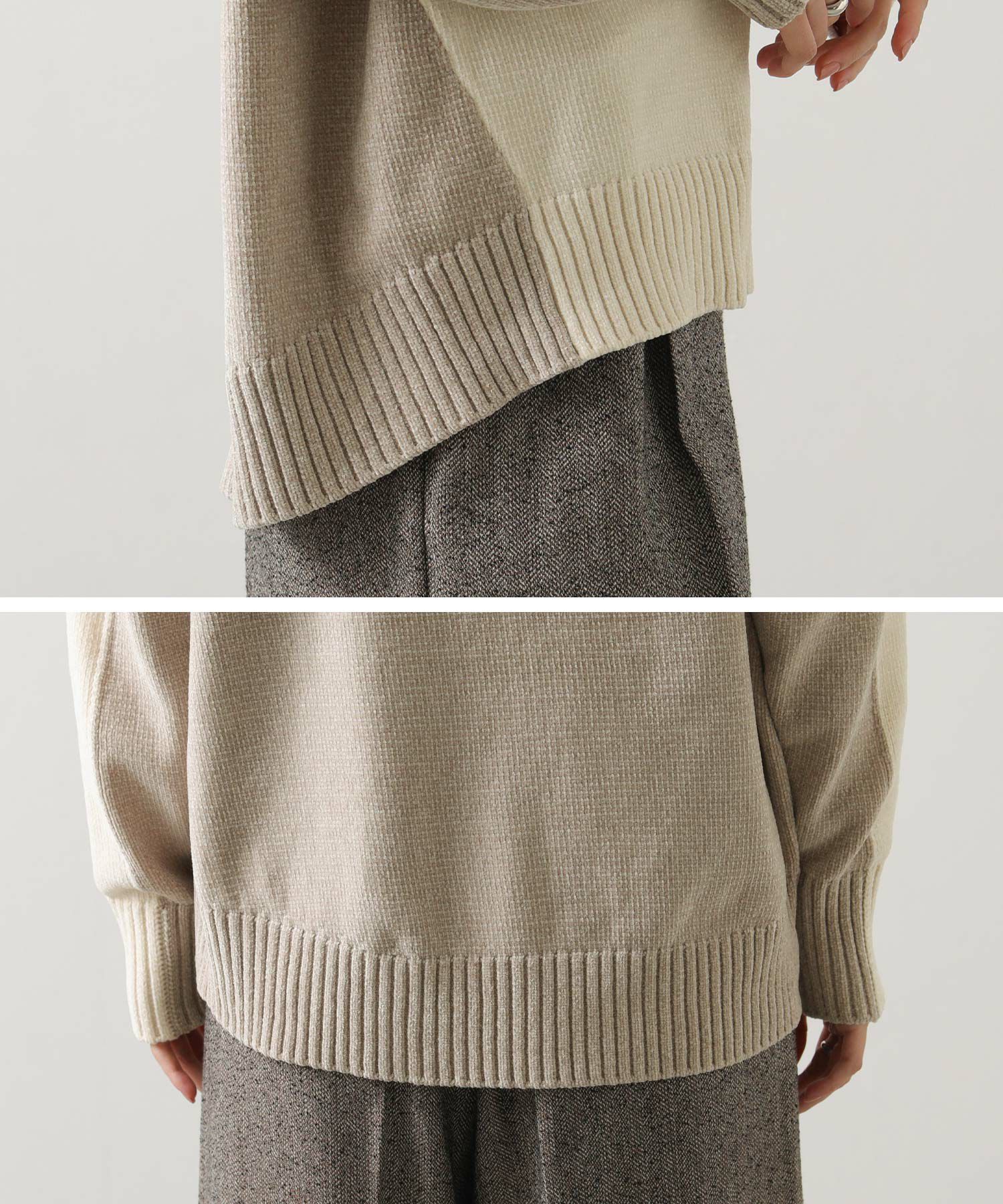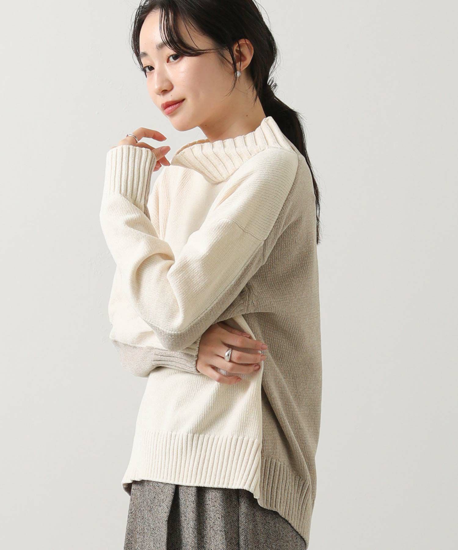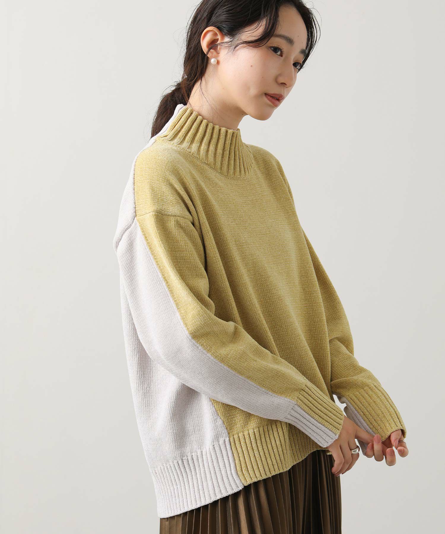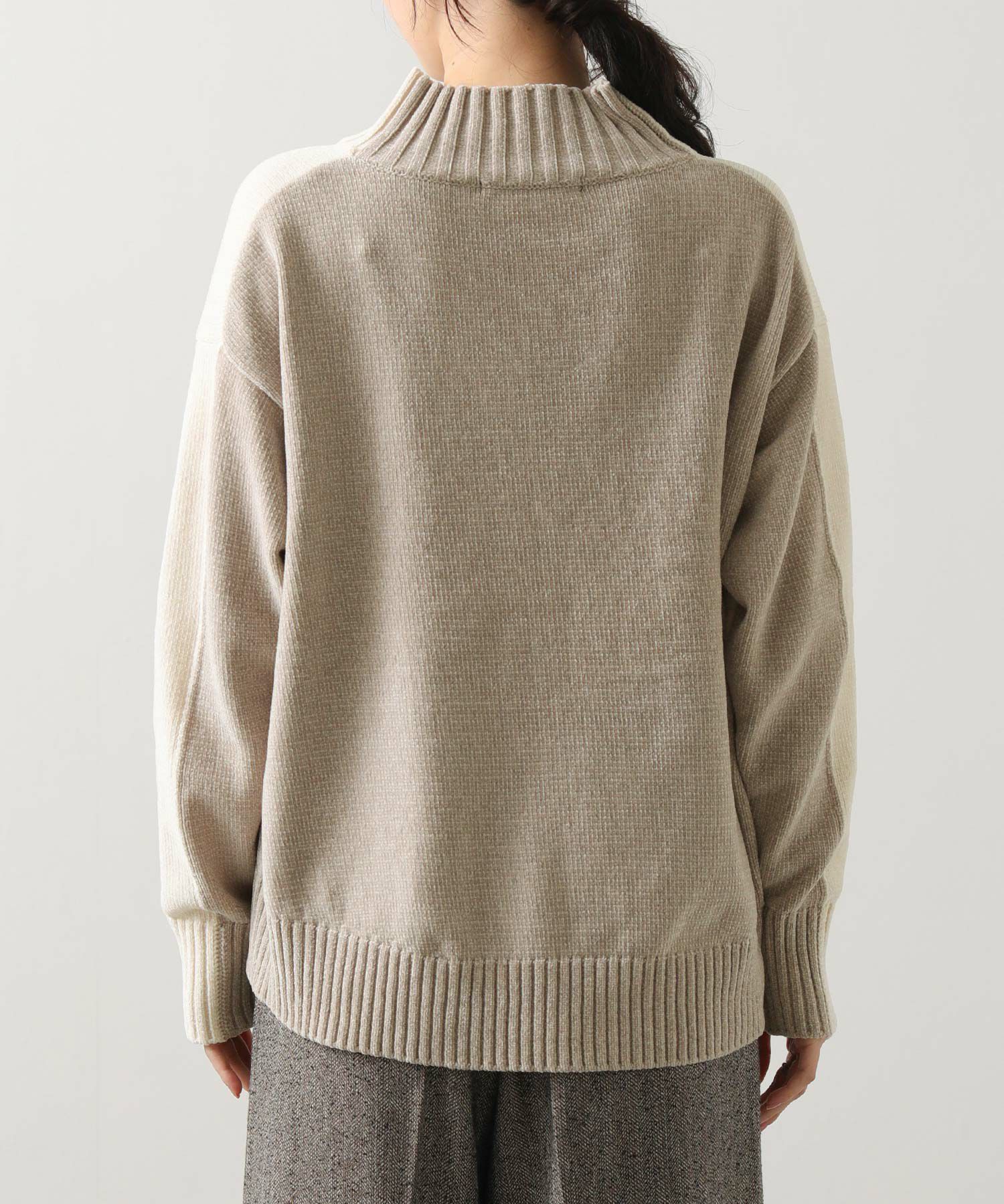 前後のバイカラーが目を惹くハイネックニット。