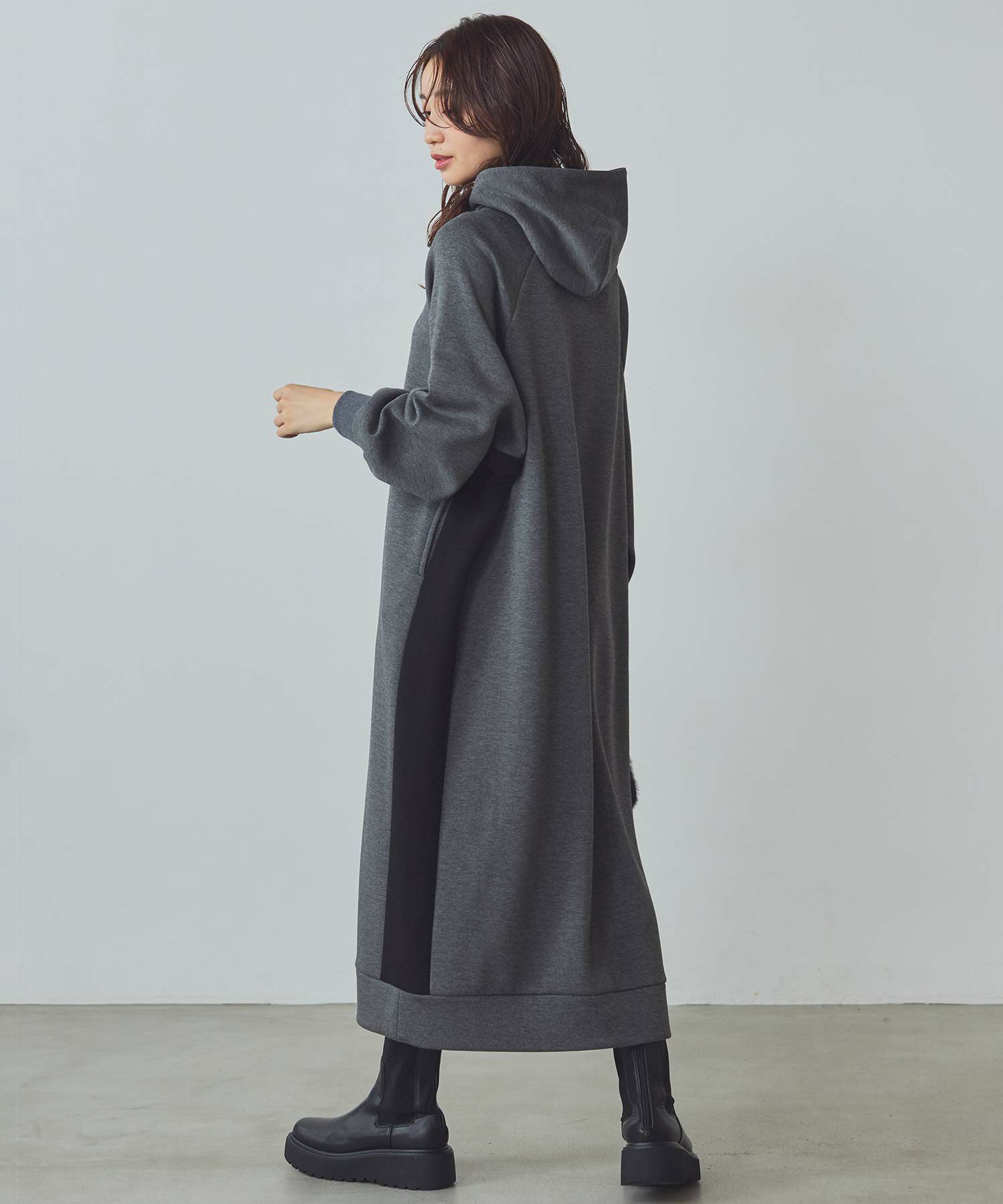 サイドラインから袖下のバイカラーがポイントのフーディワンピース。