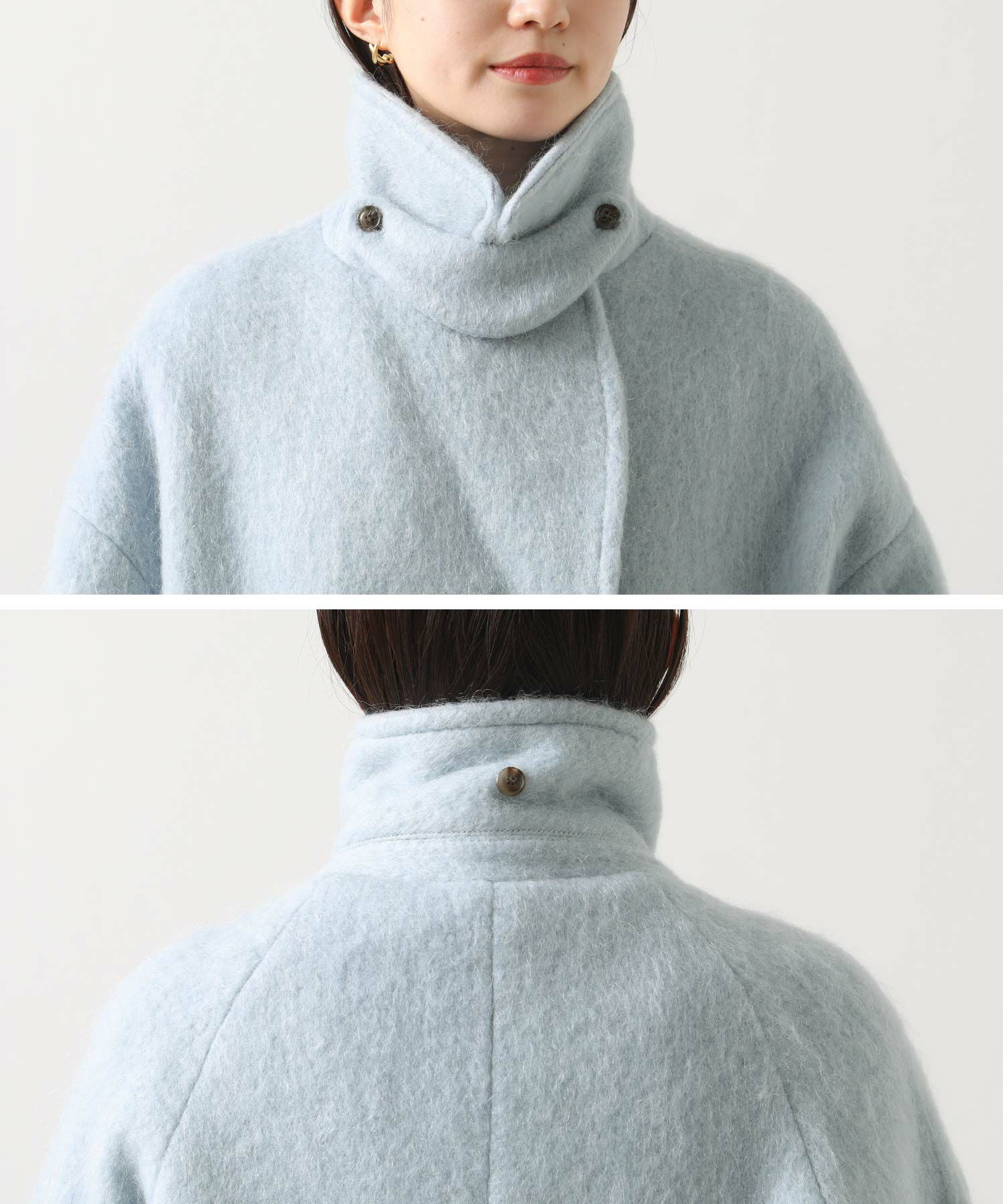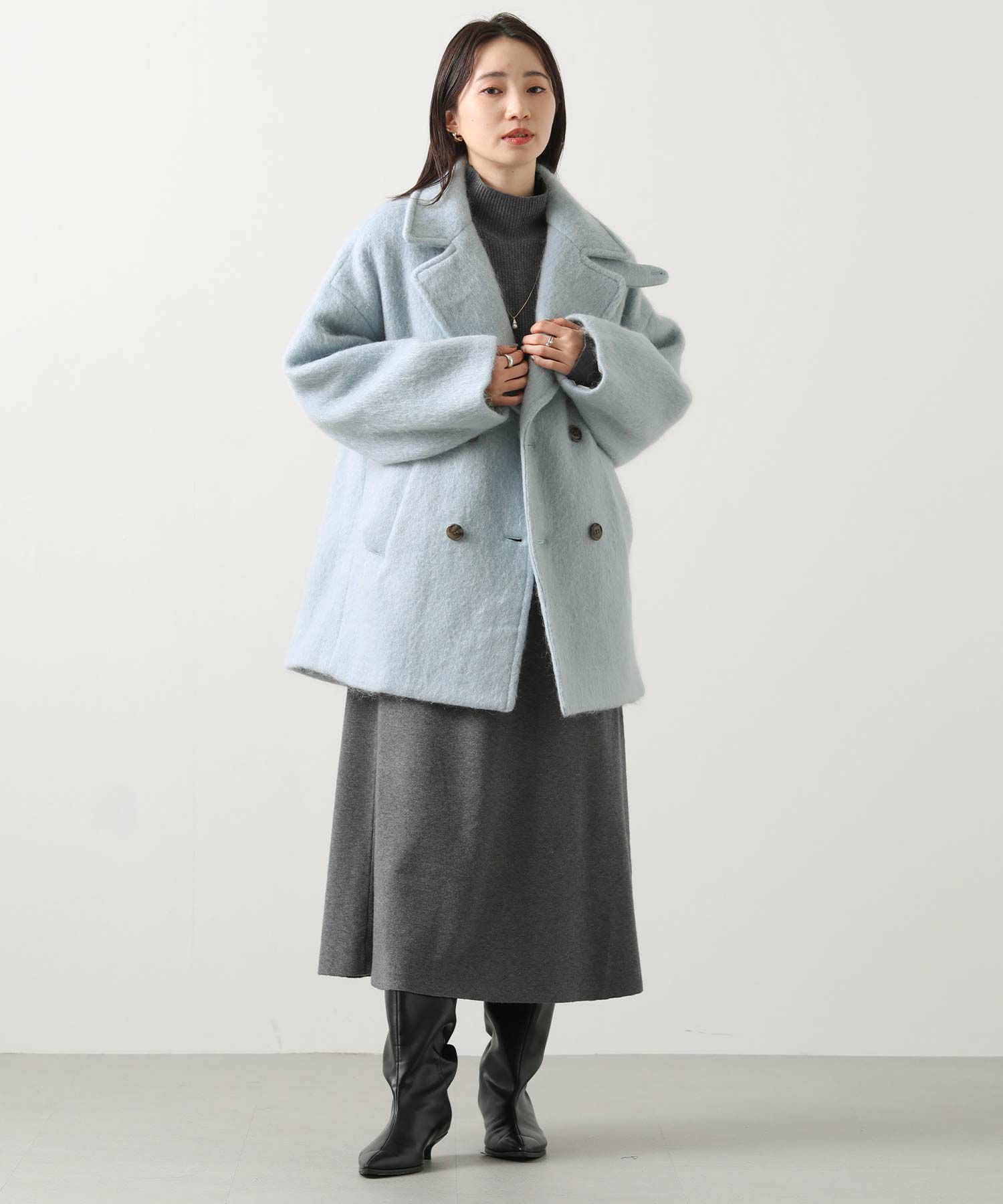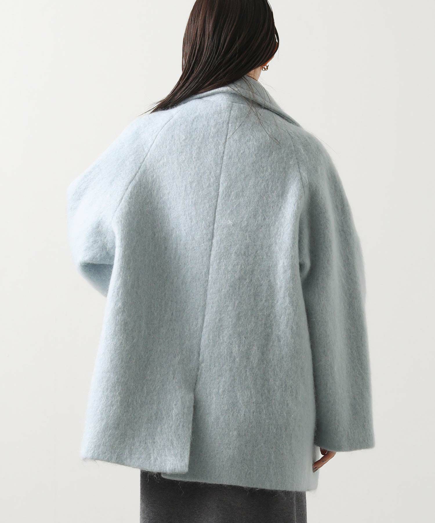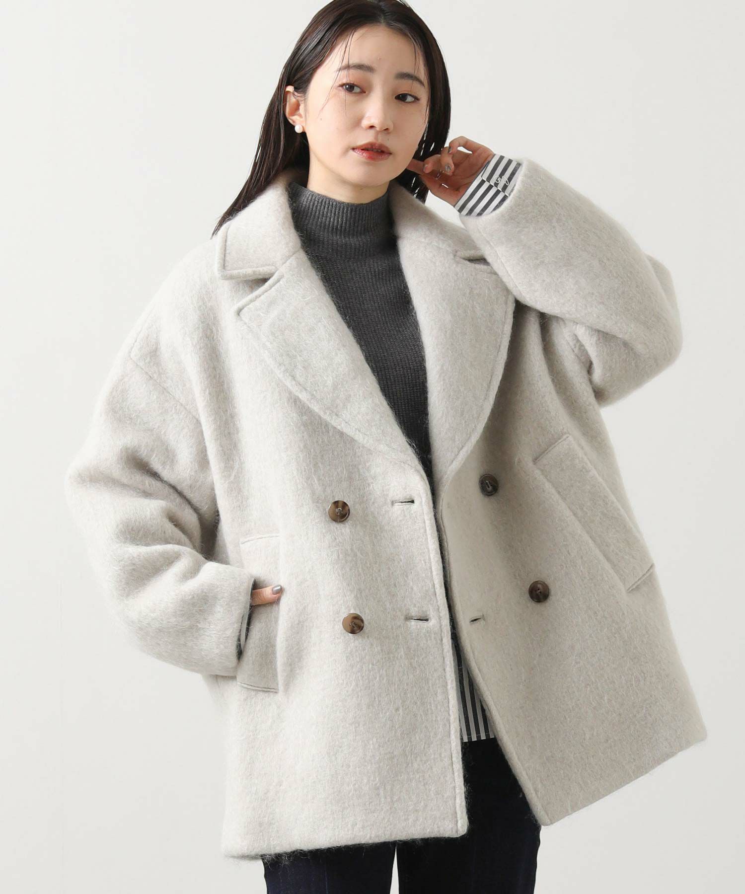 大きめの襟にミドル丈が絶妙なバランスのモヘヤシャギーPコート。