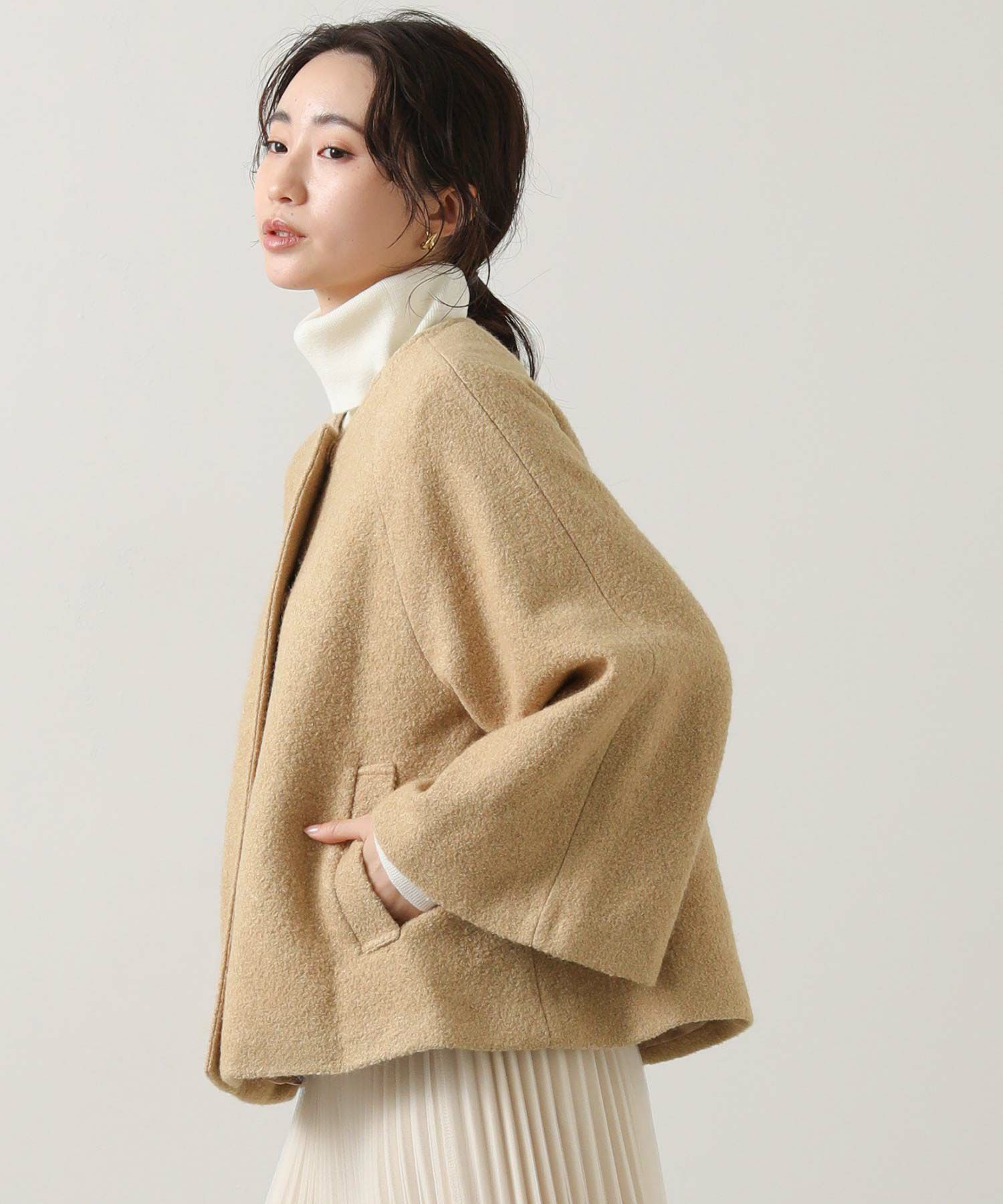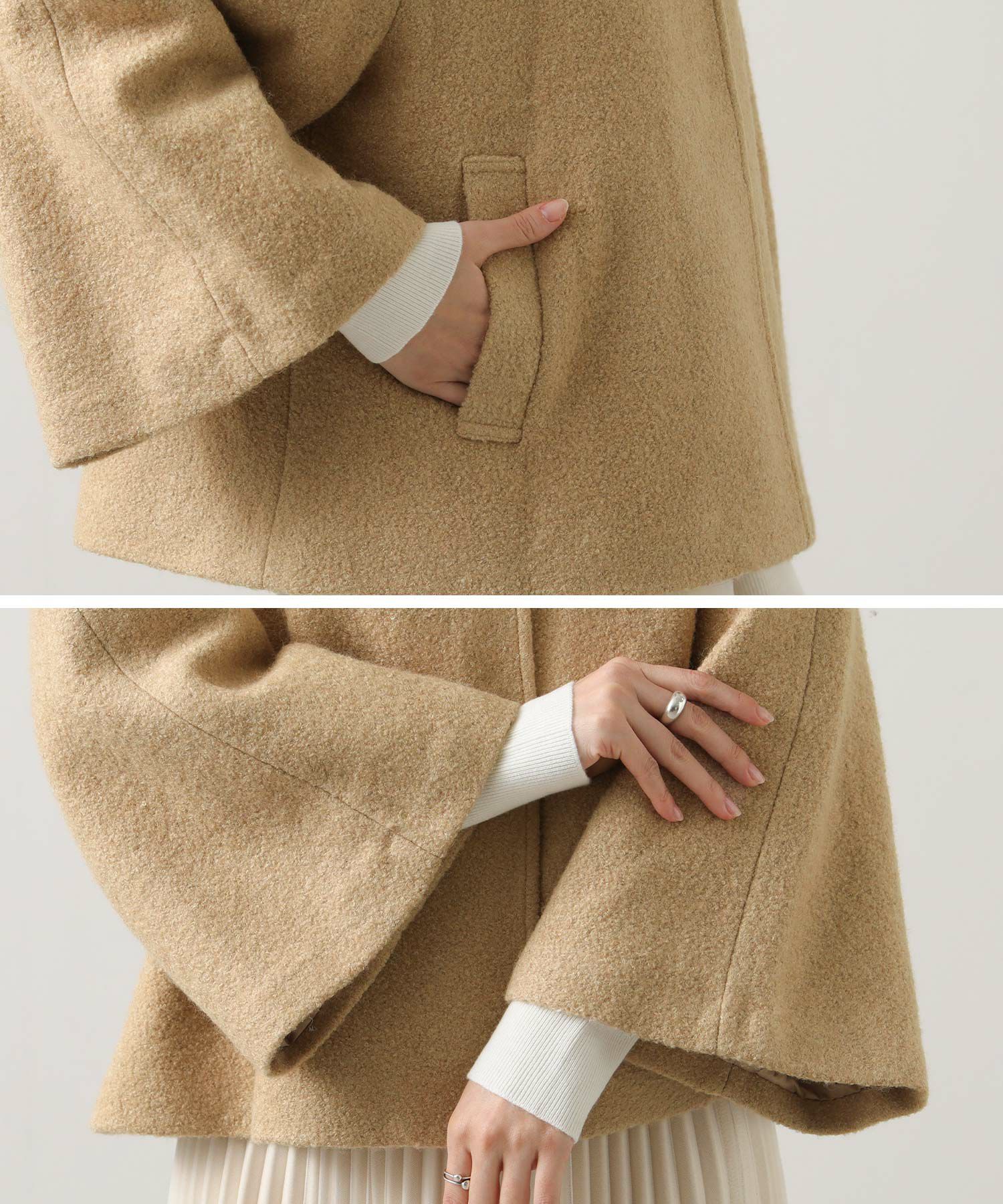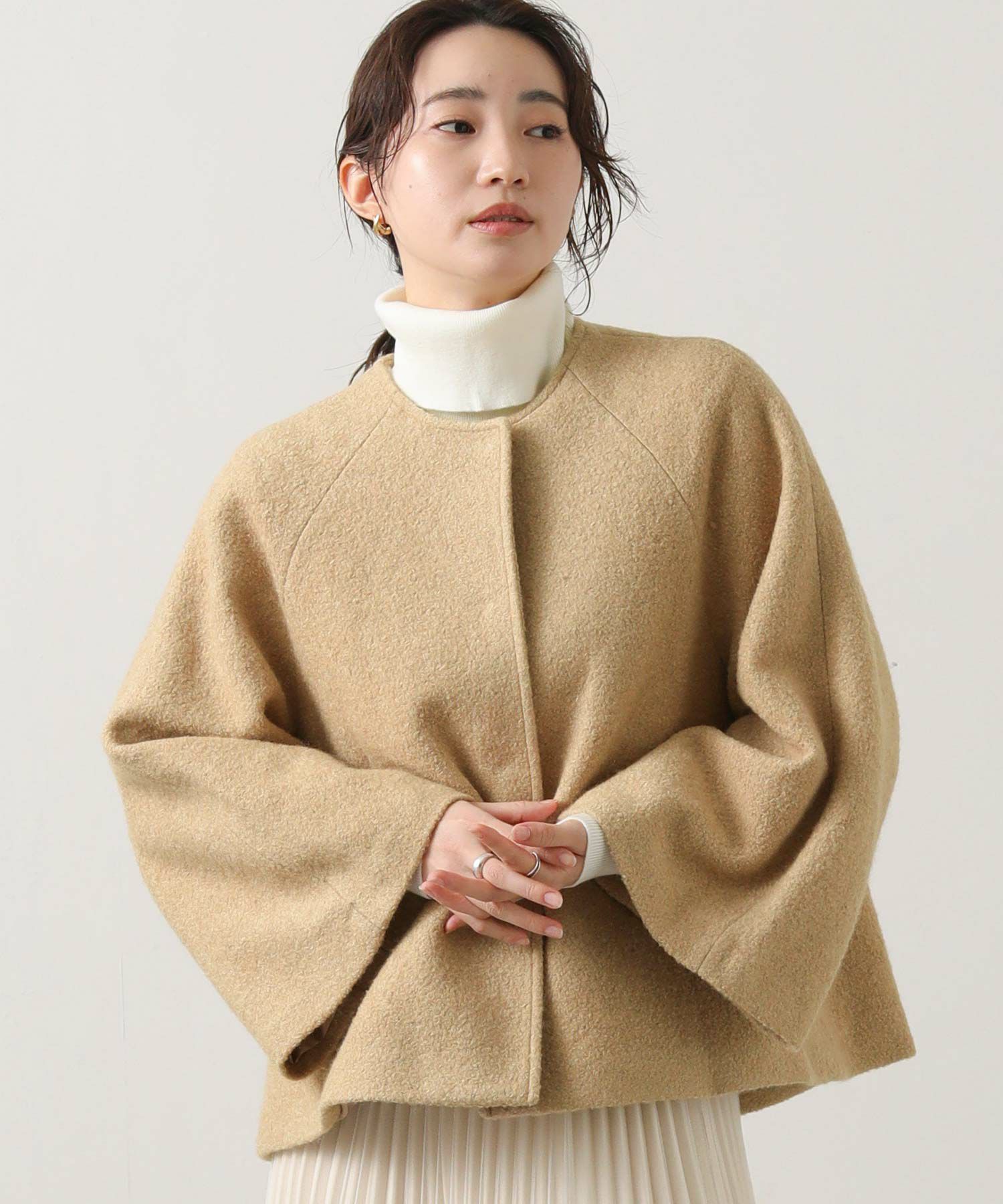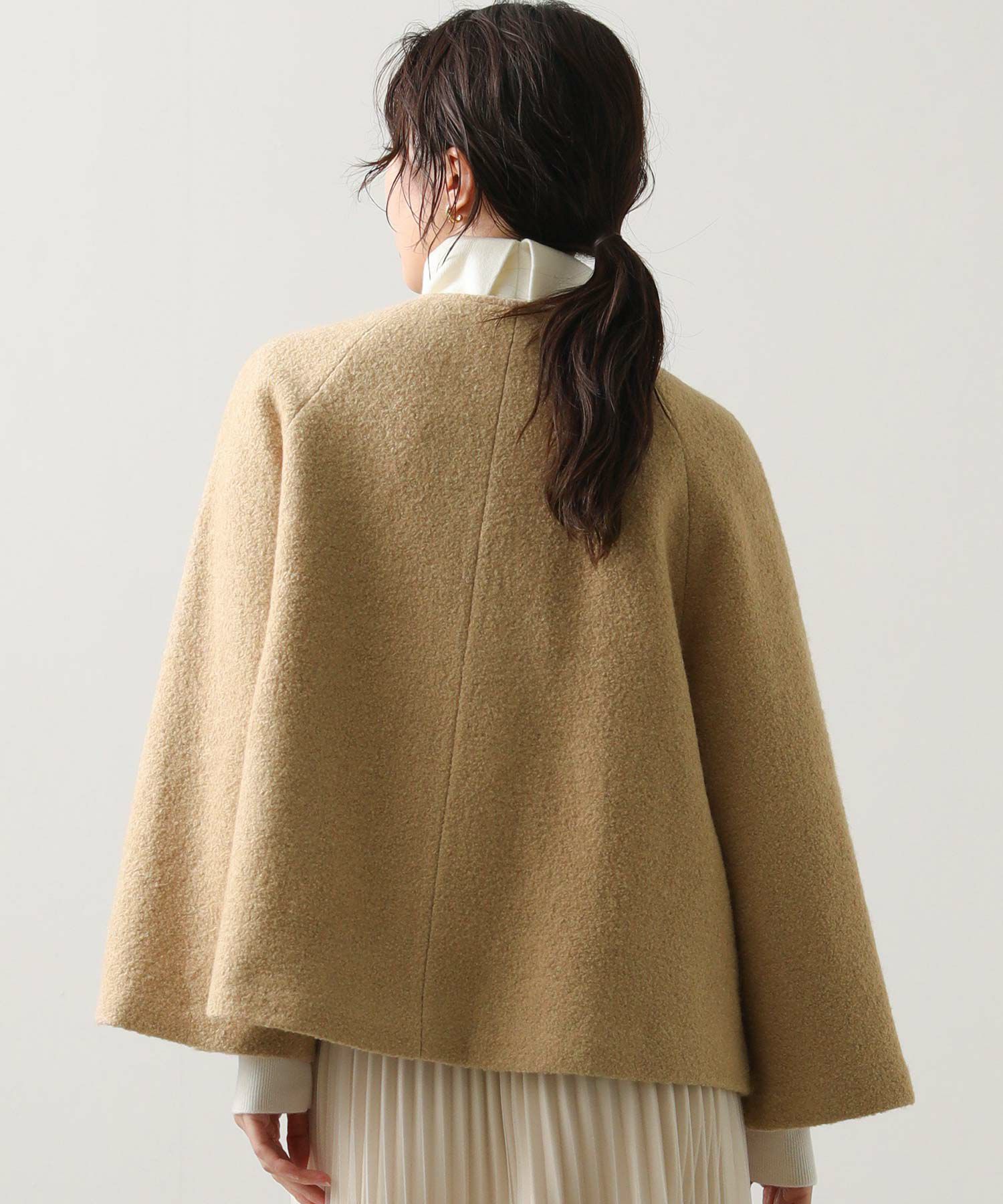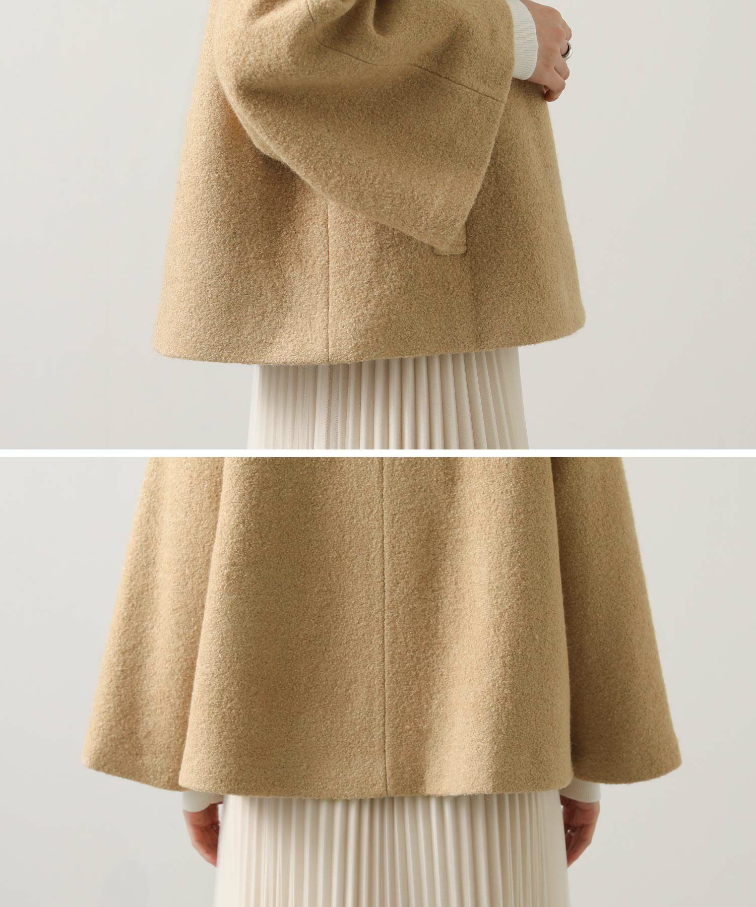 ブークレのふっくらした見た目がかわいい、大人フェミニンなケープコート。