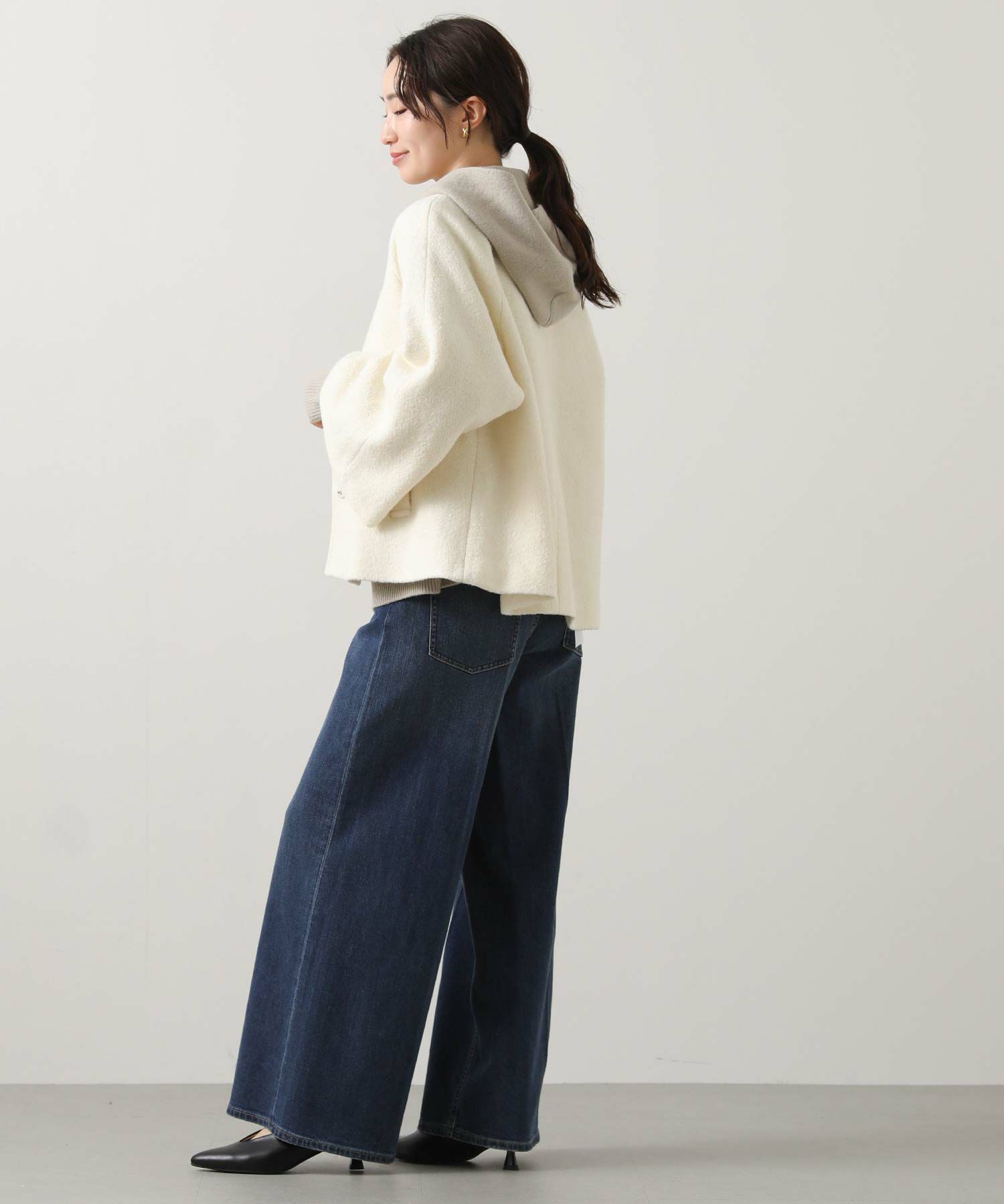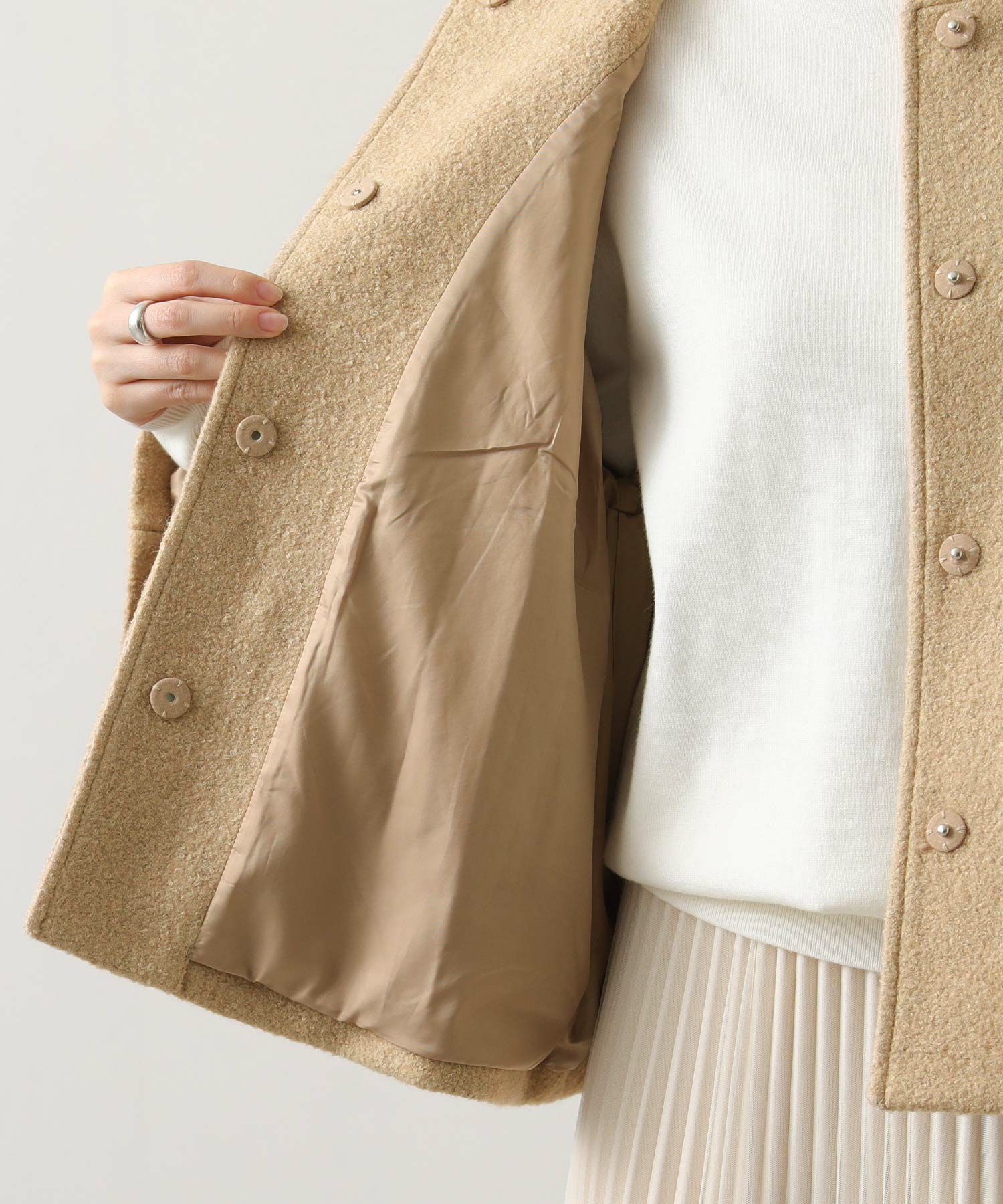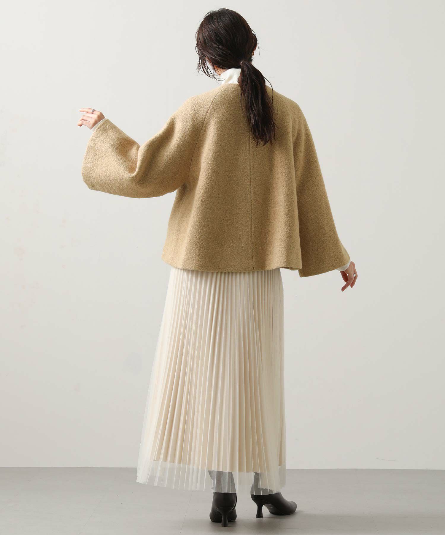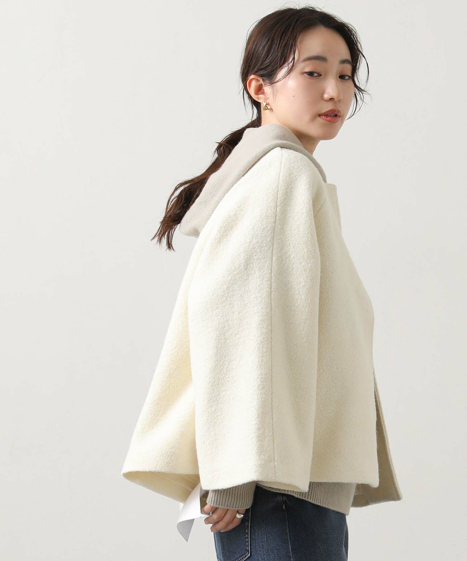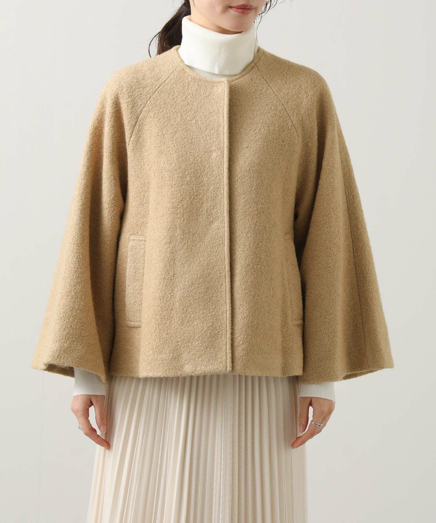 ブークレのふっくらした見た目がかわいい、大人フェミニンなケープコート。