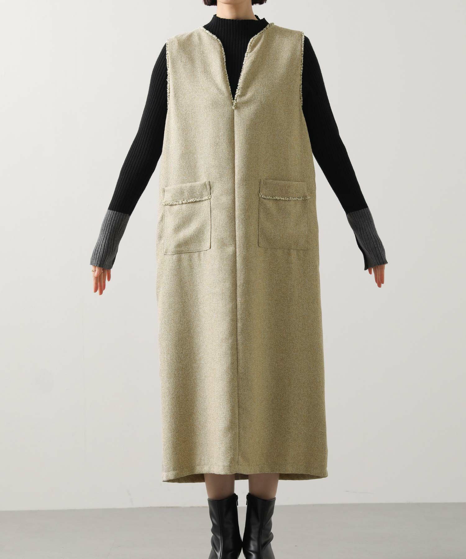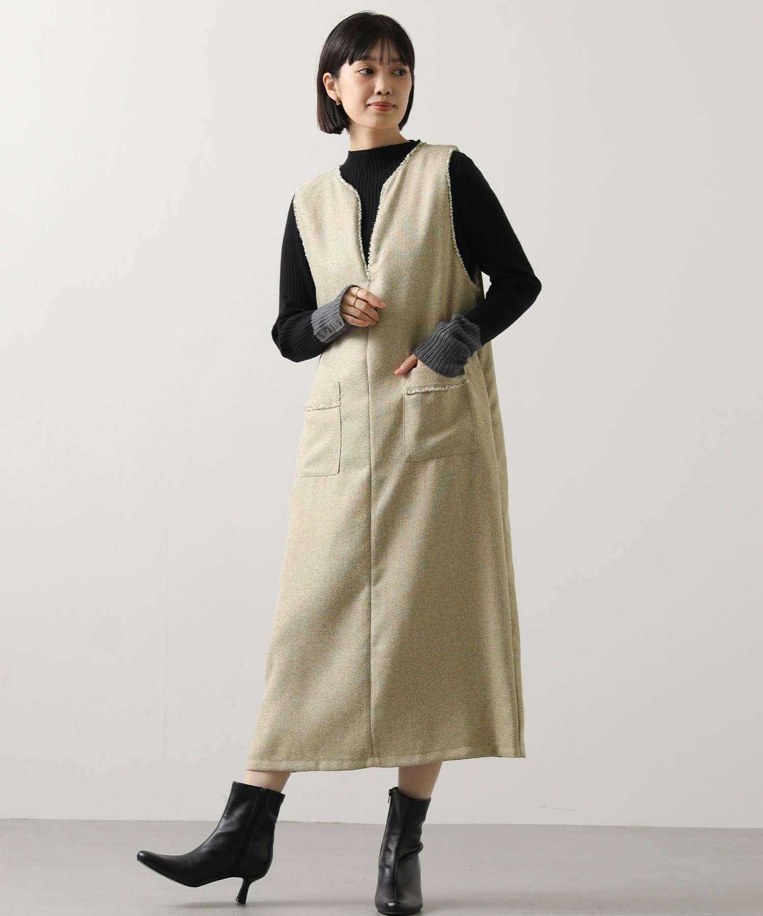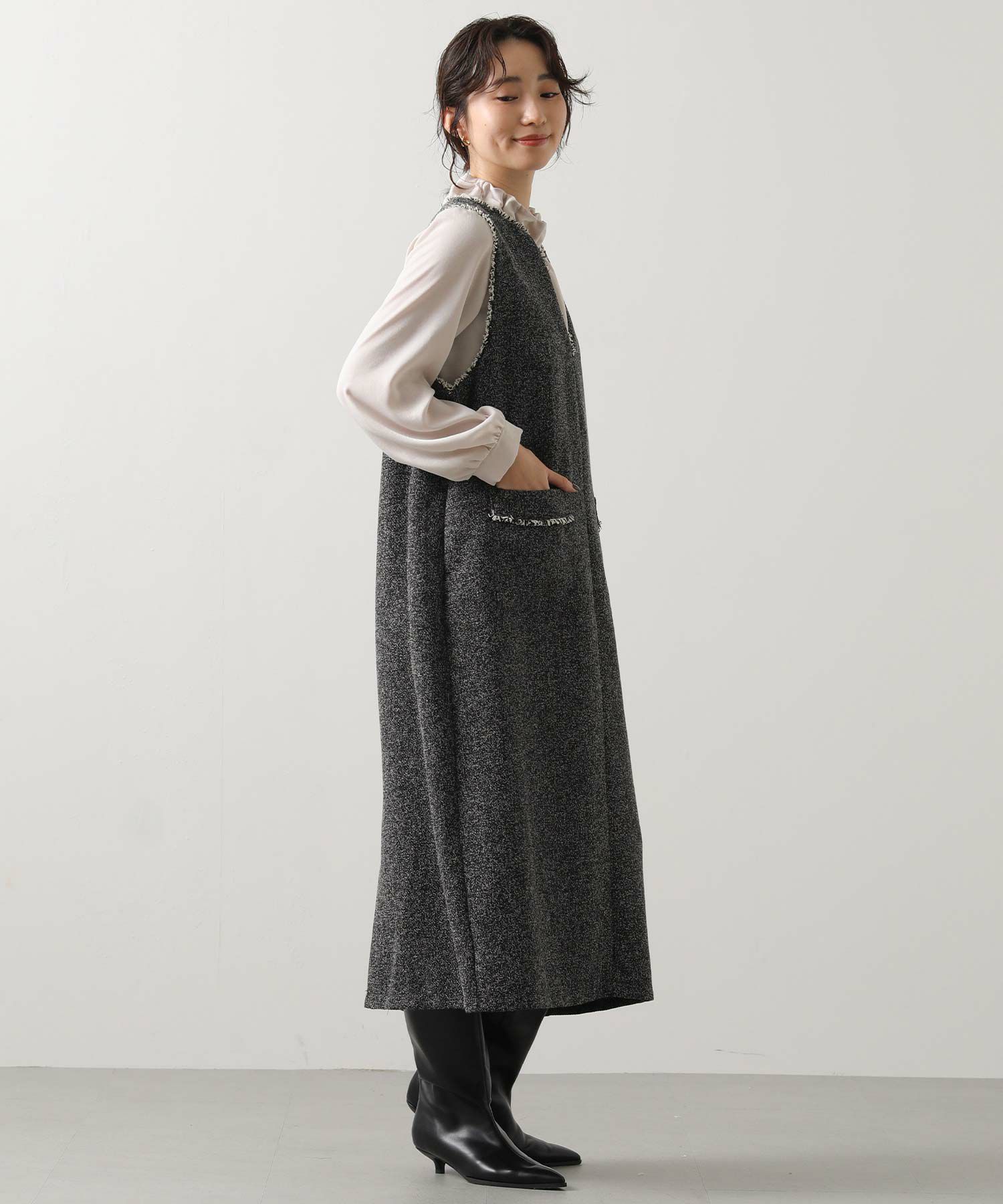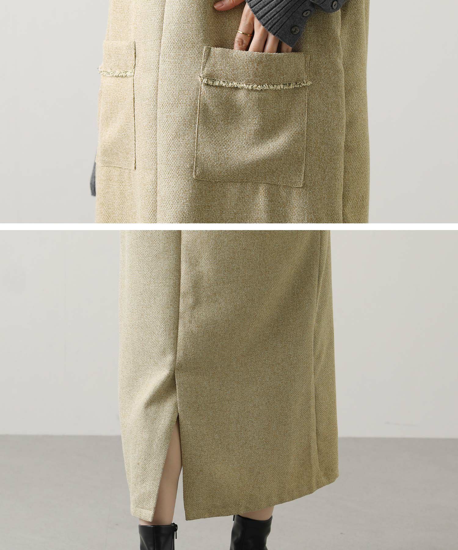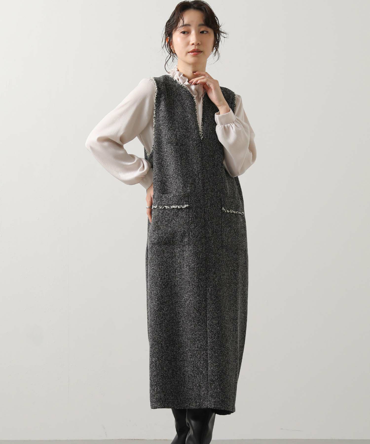 衿元とポケット口を彩る華やかなフリンジが目を惹く、ツィード調のジャンスカ。