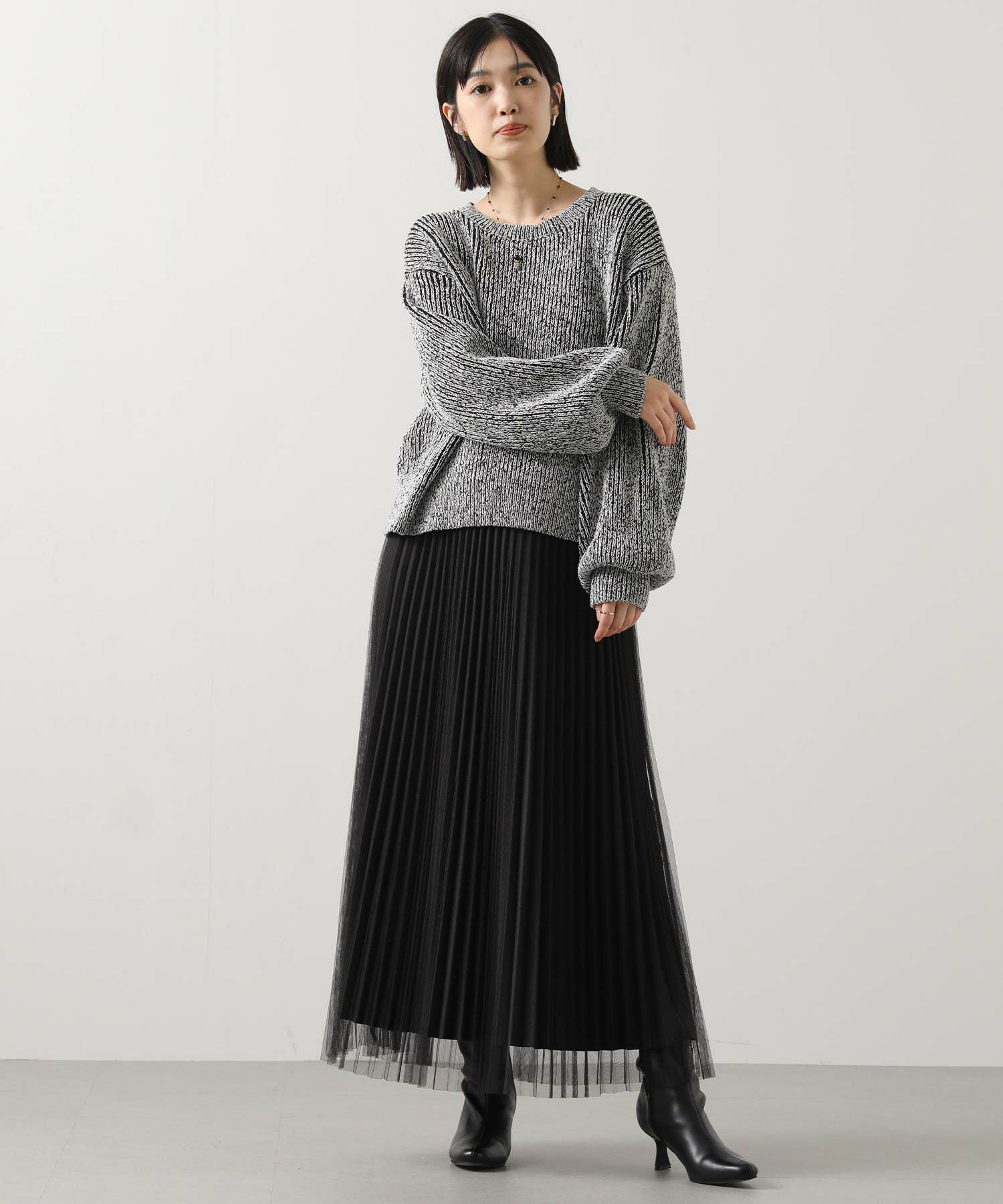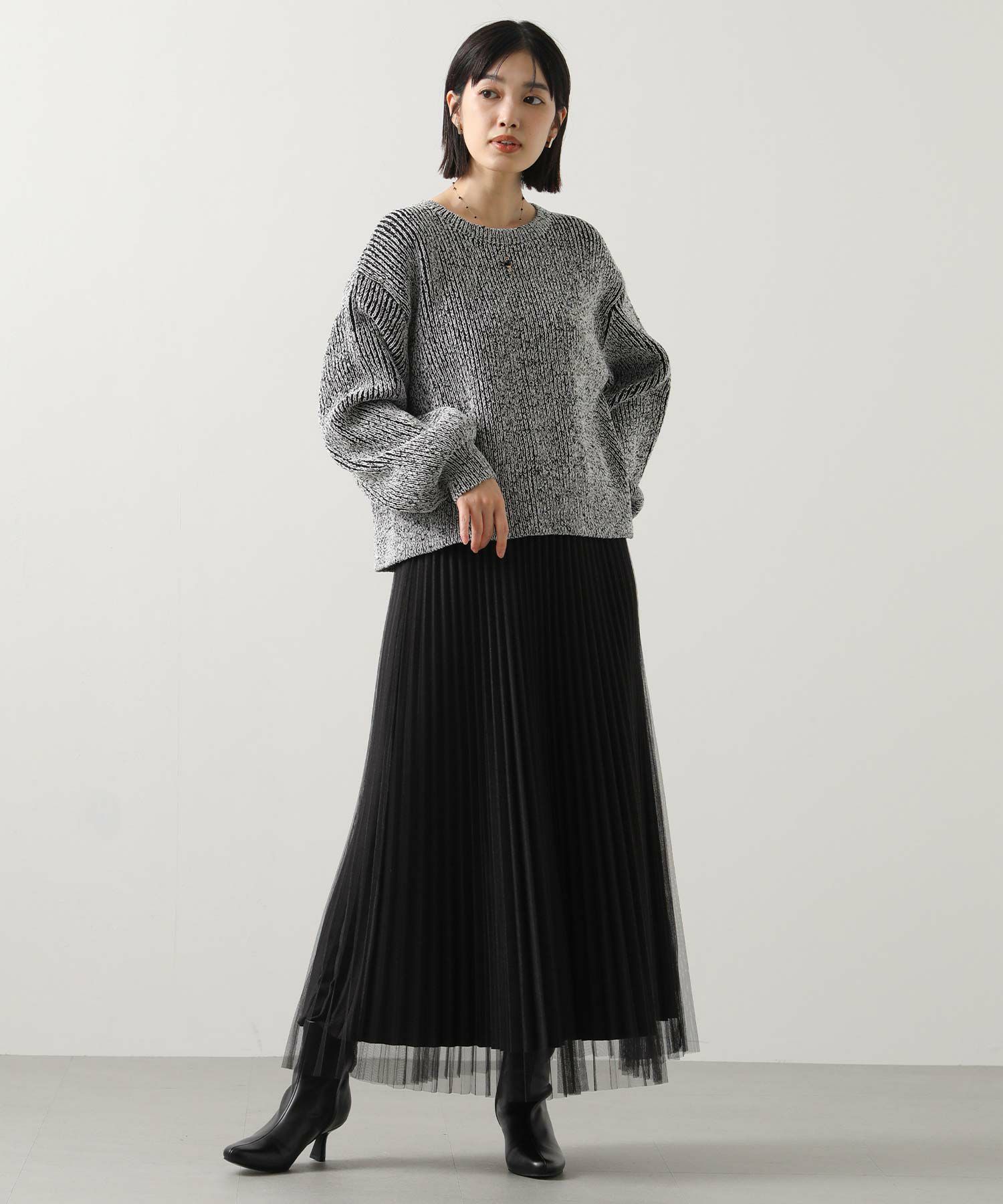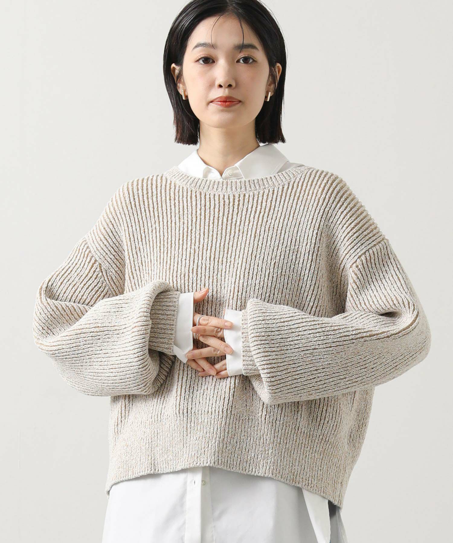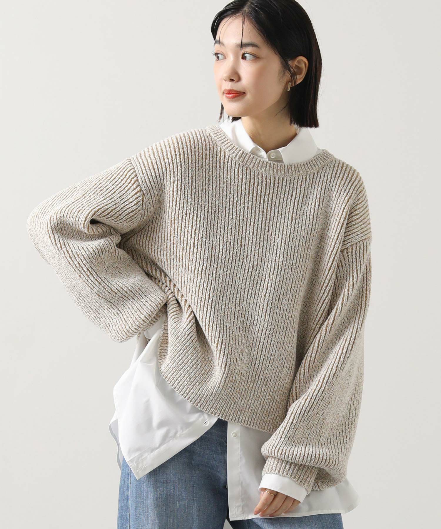 凹凸のある表面感の出るミックスカラーの糸を使用したニットプルオーバー。