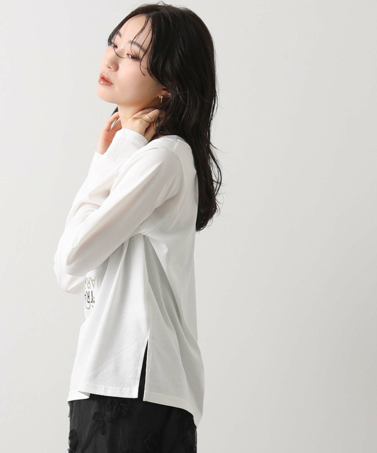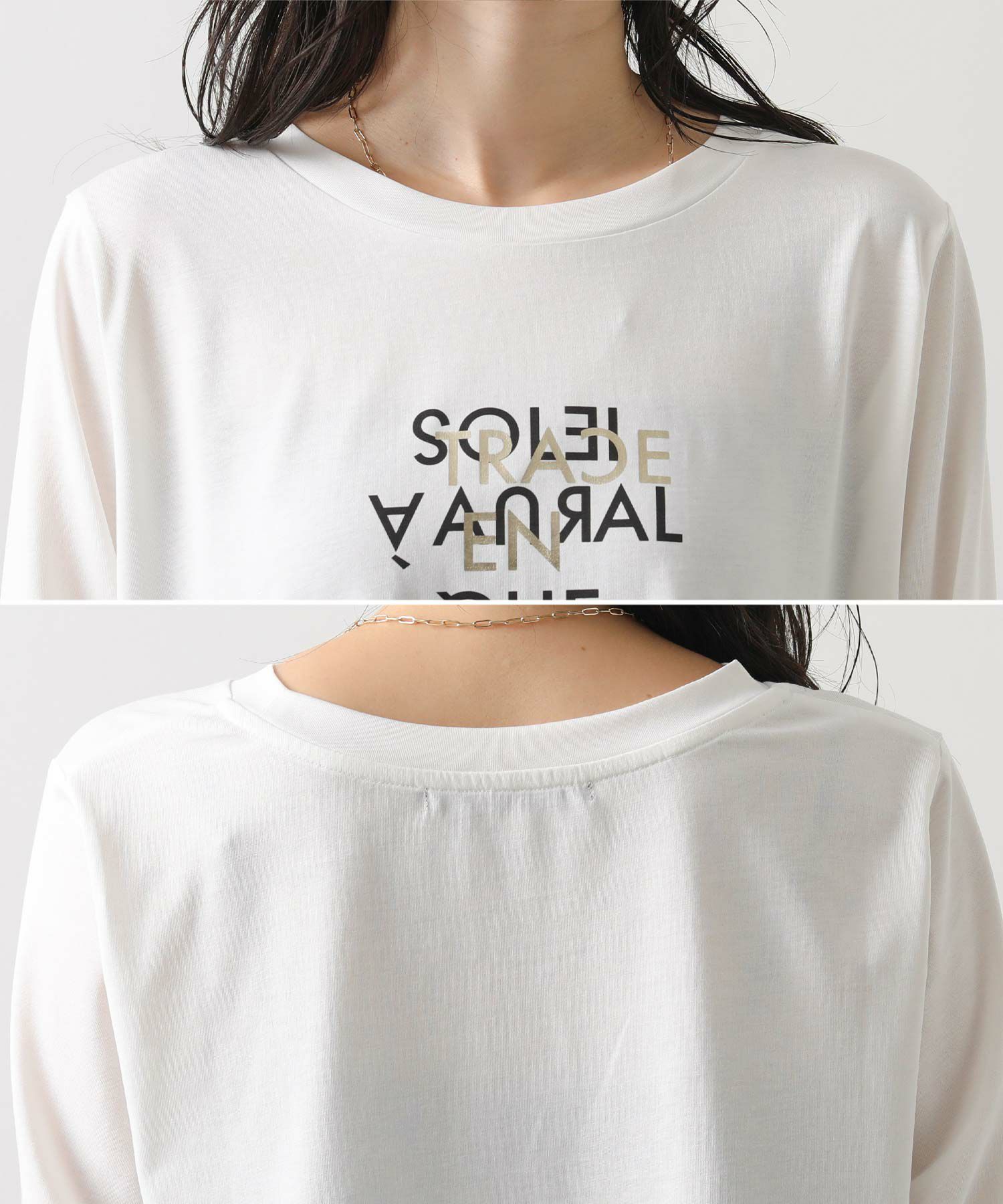 とても柔らかく心地よい生地感で、1枚でも美しく着こなせるのが魅力。プリントに箔を重ねた繊細なグラフィックは、さりげなく華やかさを添えシンプルな中に上質感をプラス。
