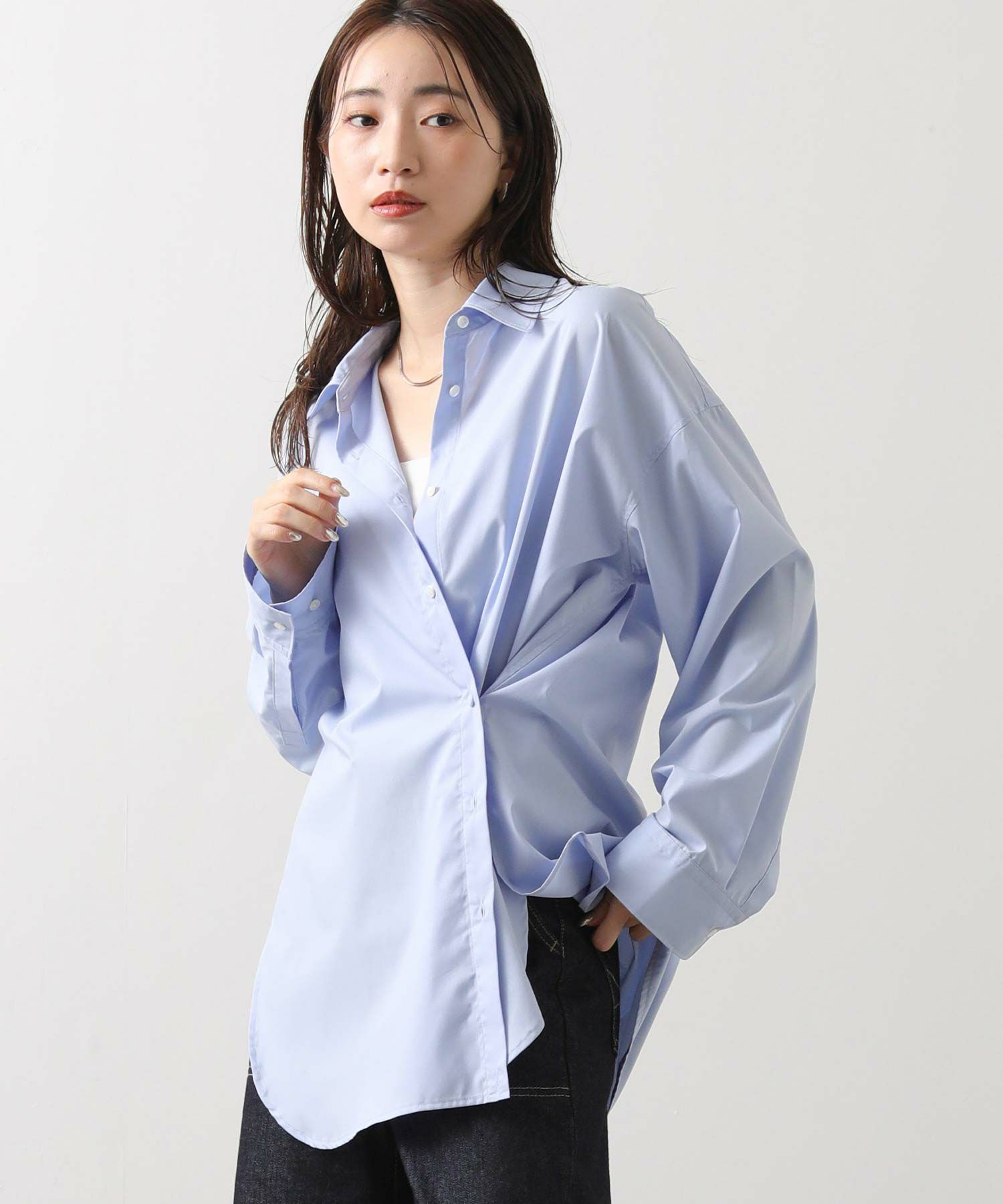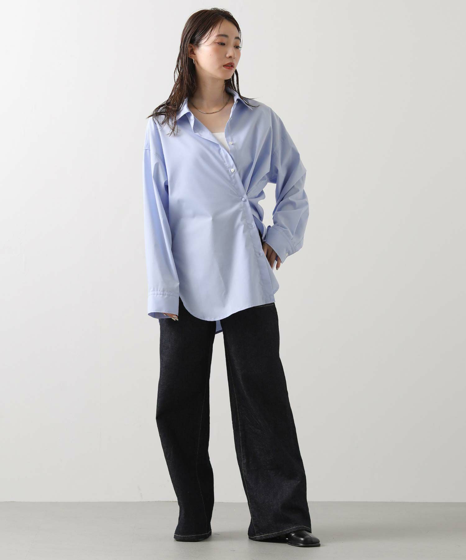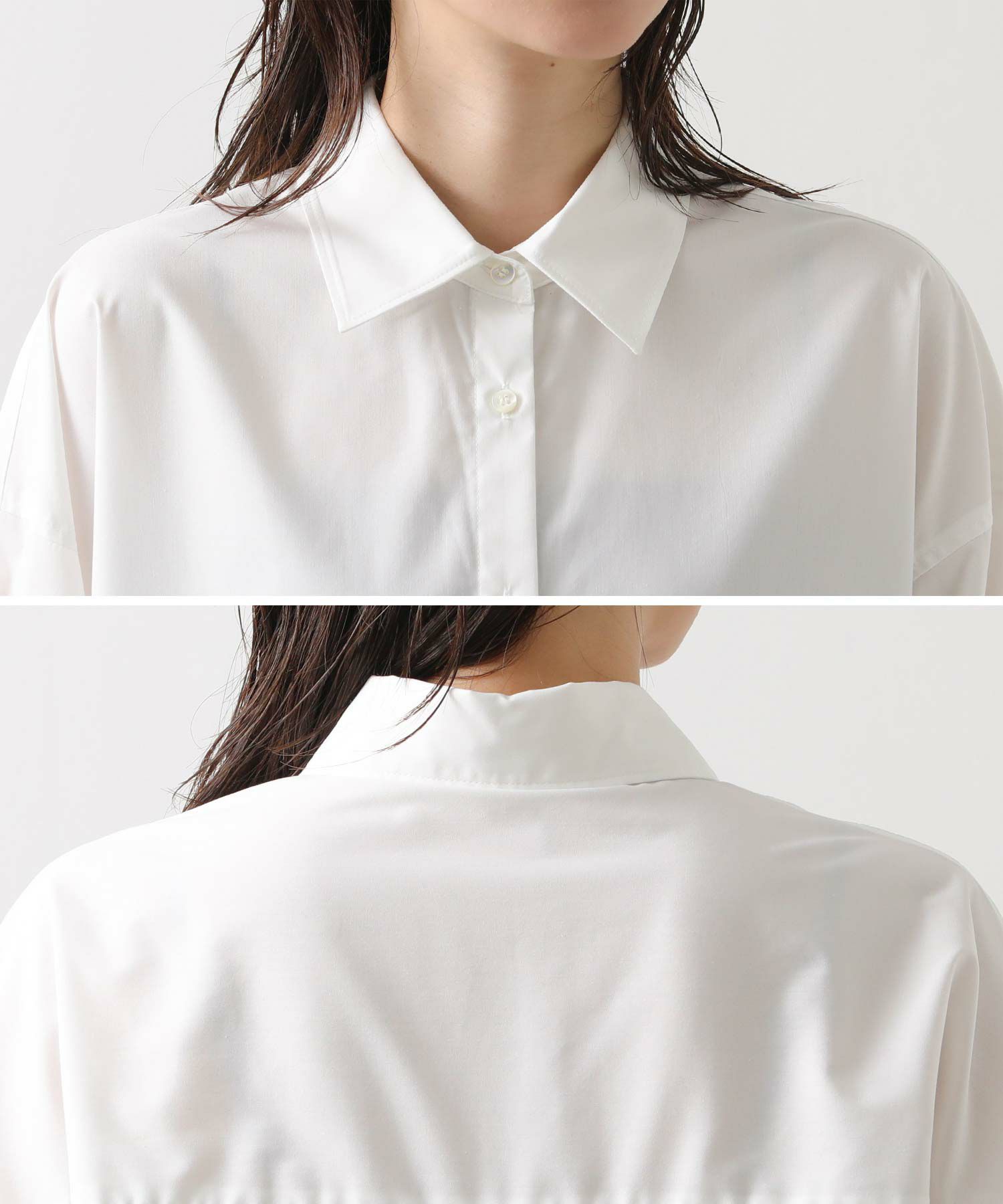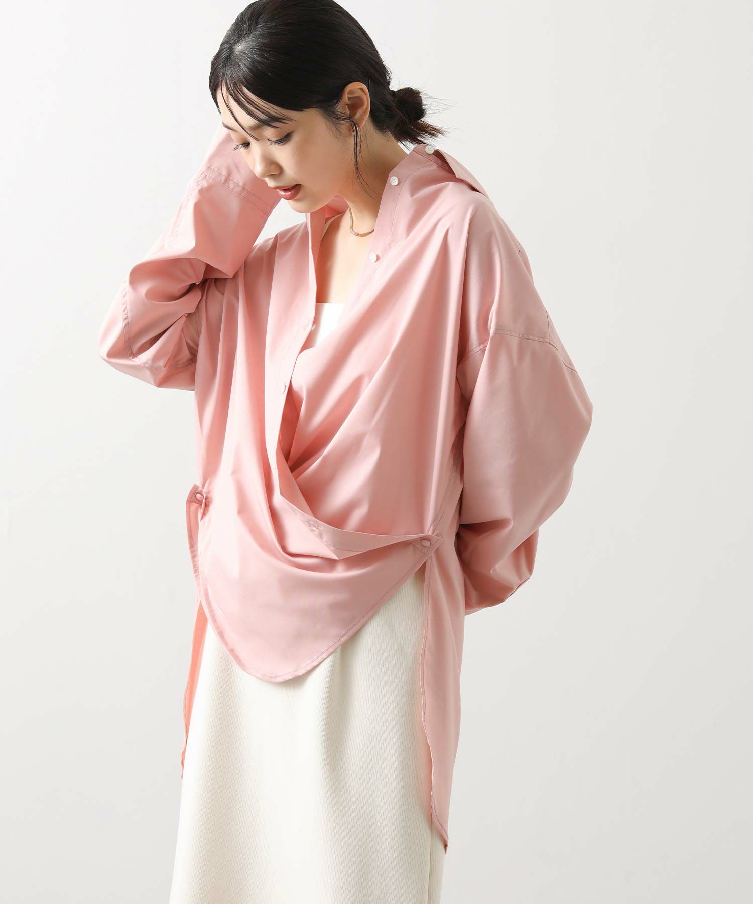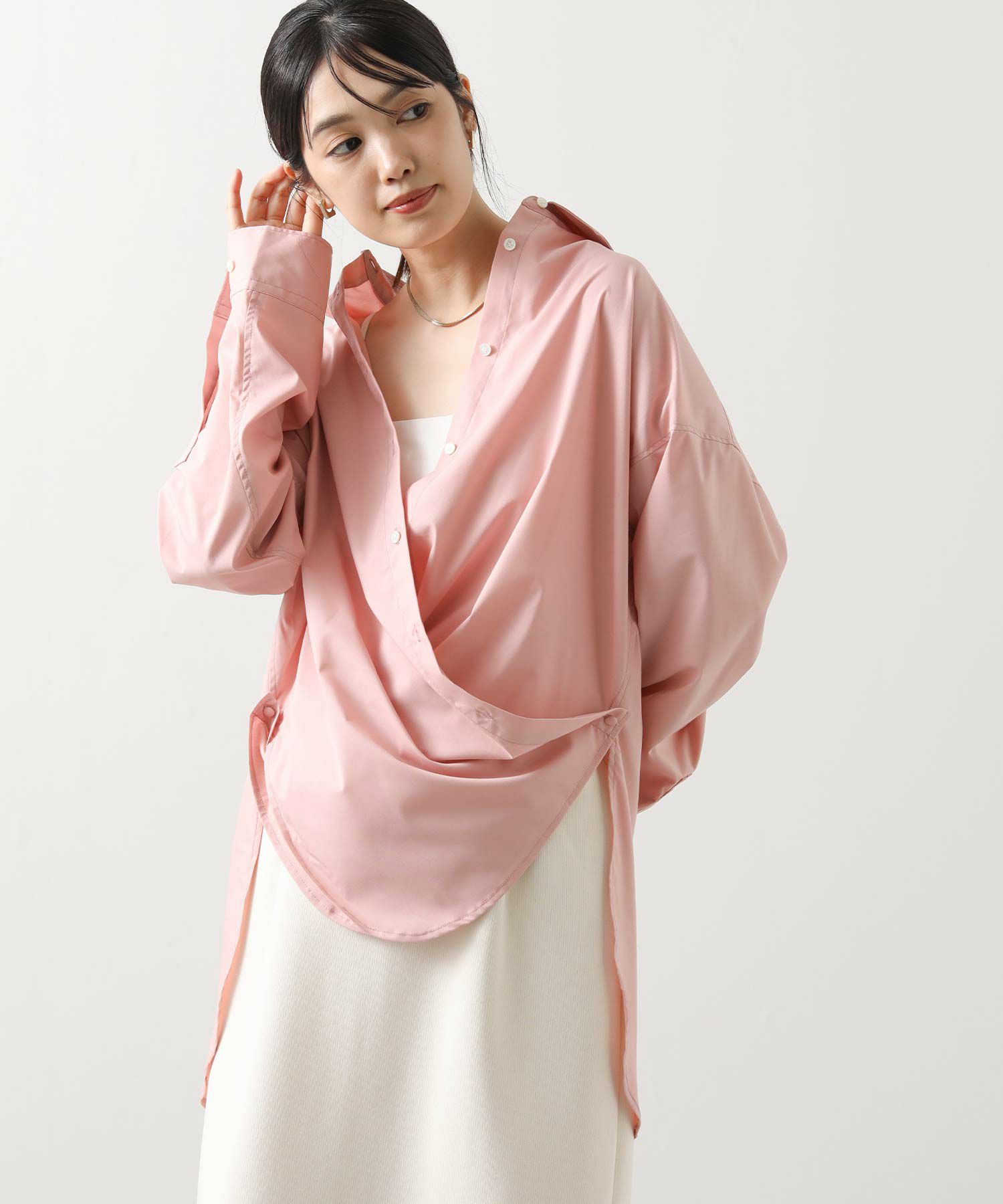 両脇下の釦をフロントの一番下のホールに左右クロスさせて通すと、カシュクールでインしたような着こなしに。