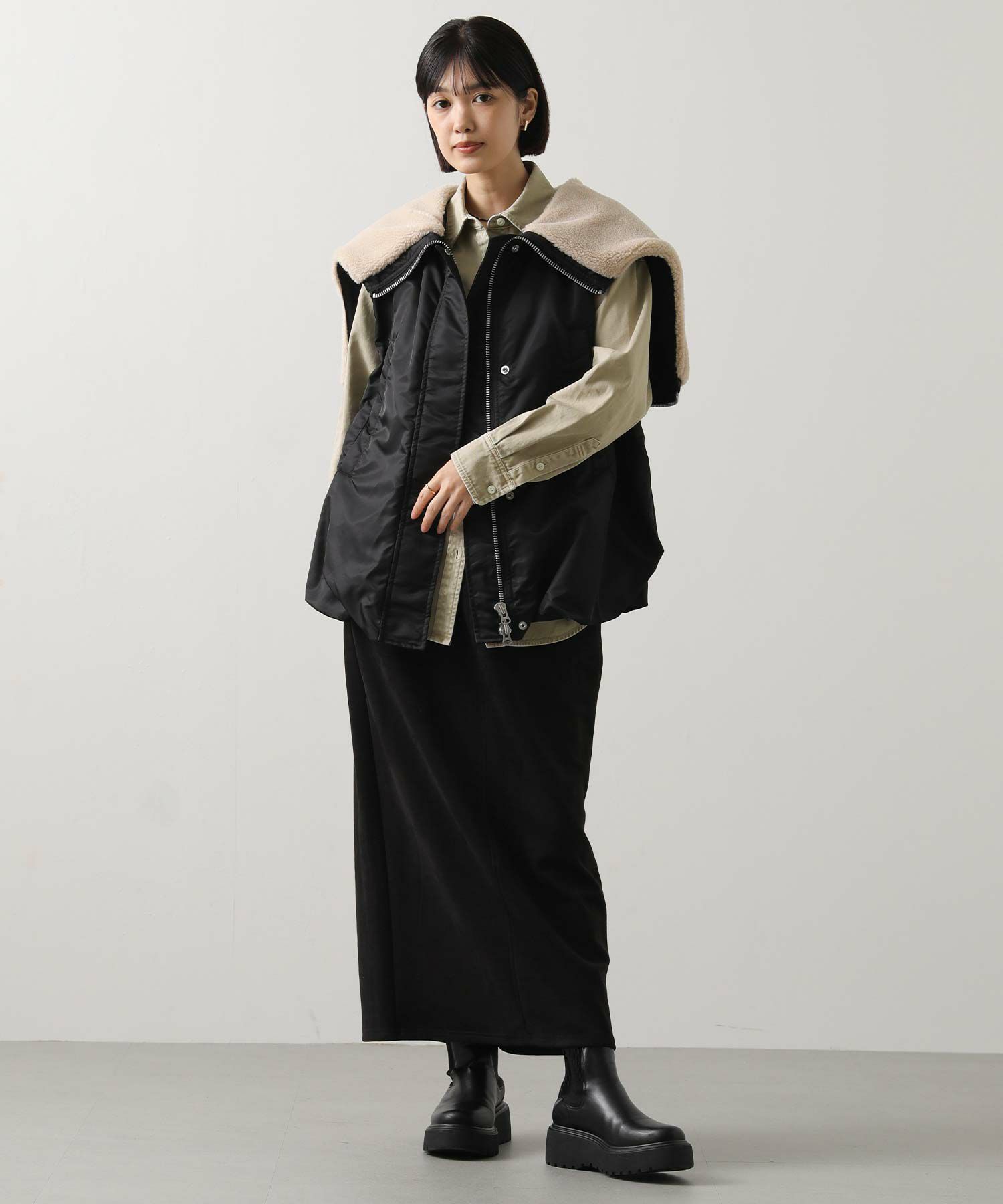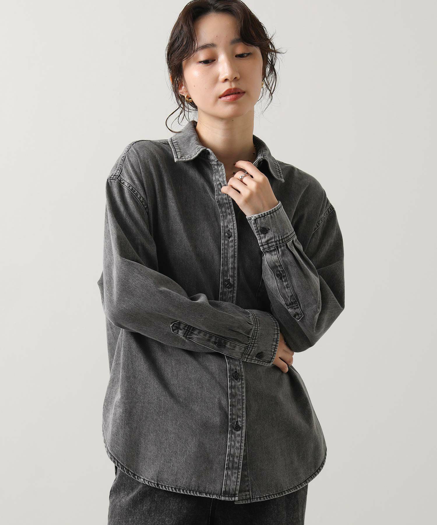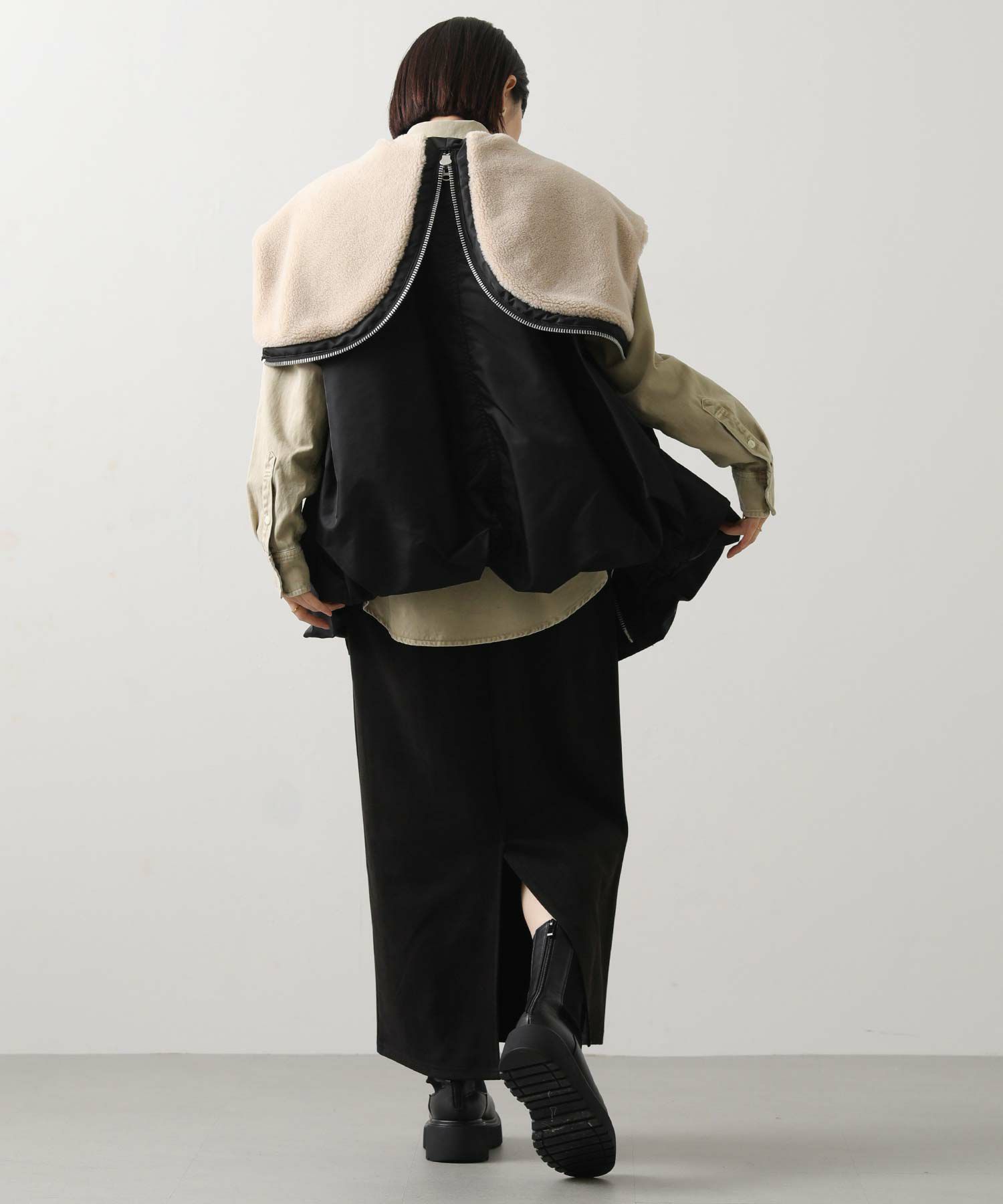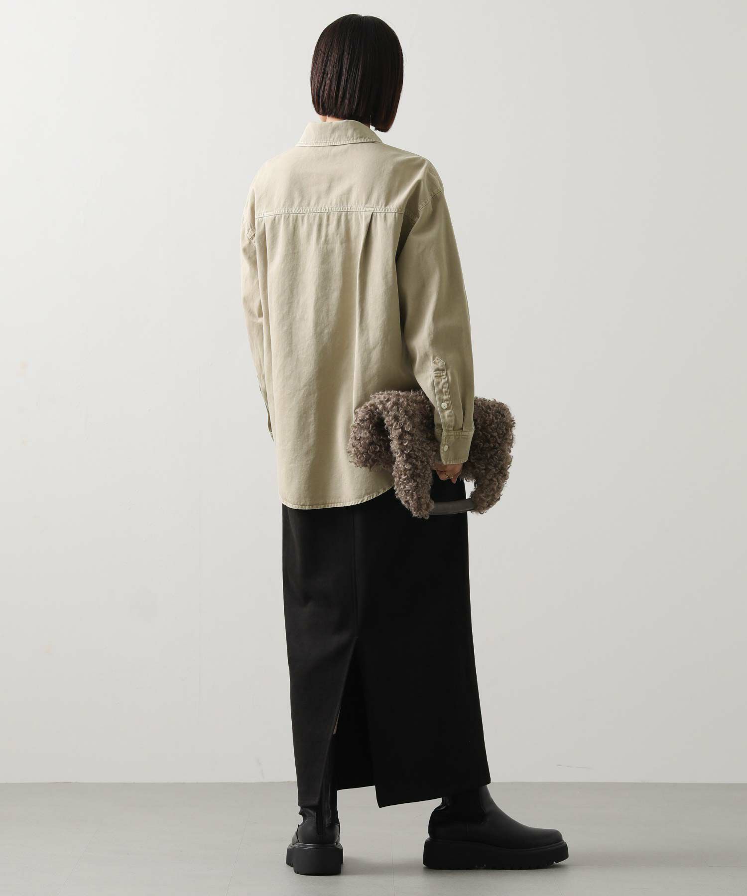 1枚でももちろん、腰に巻いたりジャケットとしてさらっと羽織ったりと、ユーティリティーな着回しの効く1着。