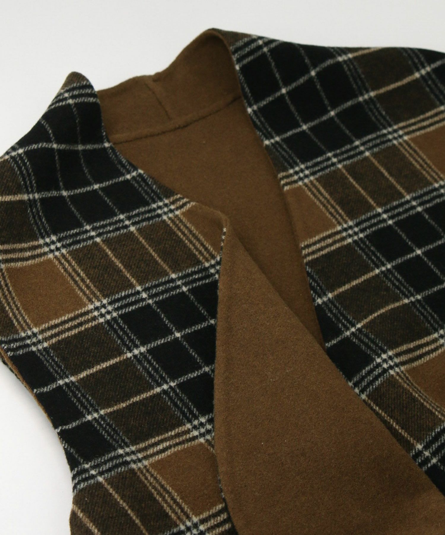 リバーシブルで着用でき、スタイリングに合わせて無地のジレで上品に、チェックのジレで華やかに着用できます。