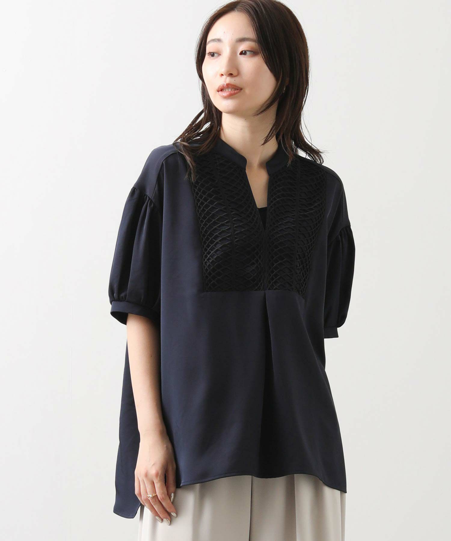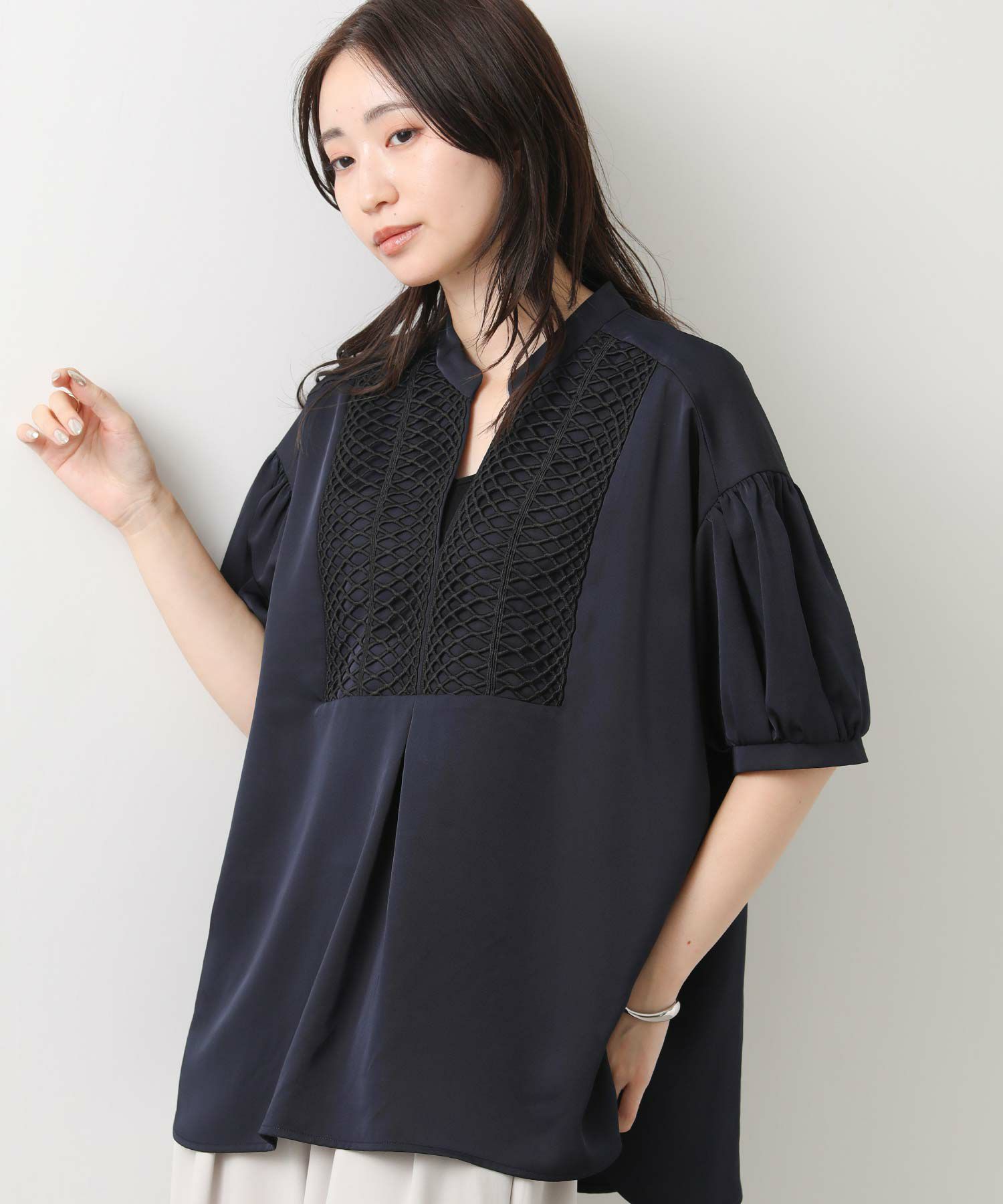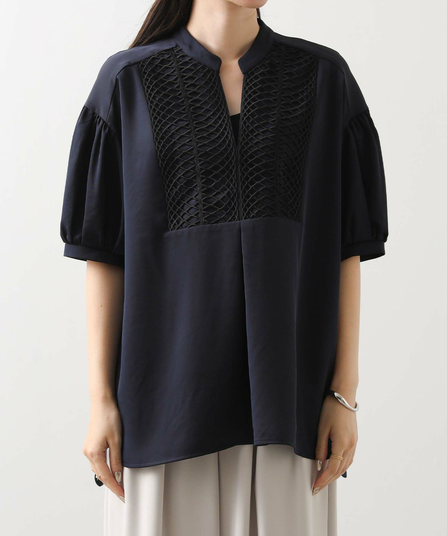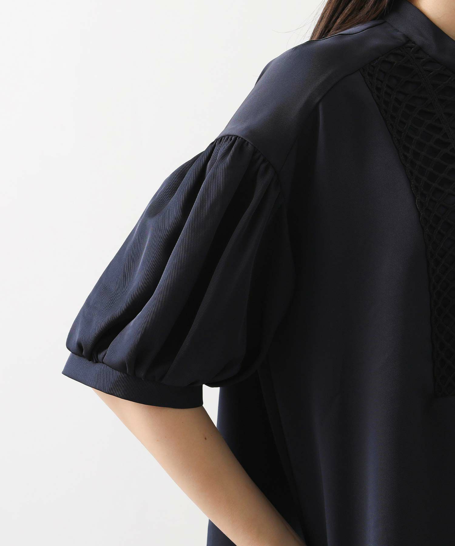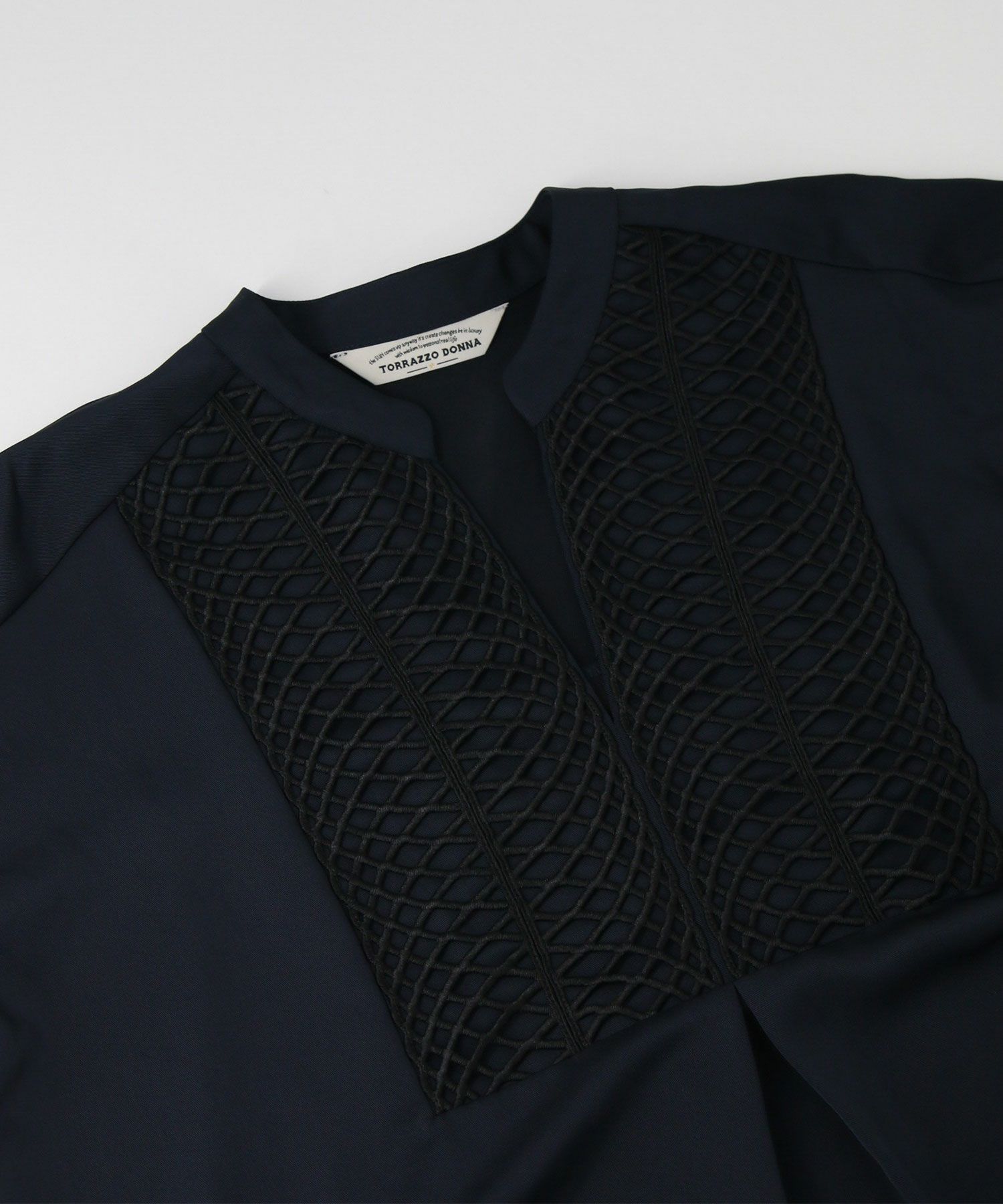 胸元のヨーク切り替えにあしらった立体コードレースがポイント。