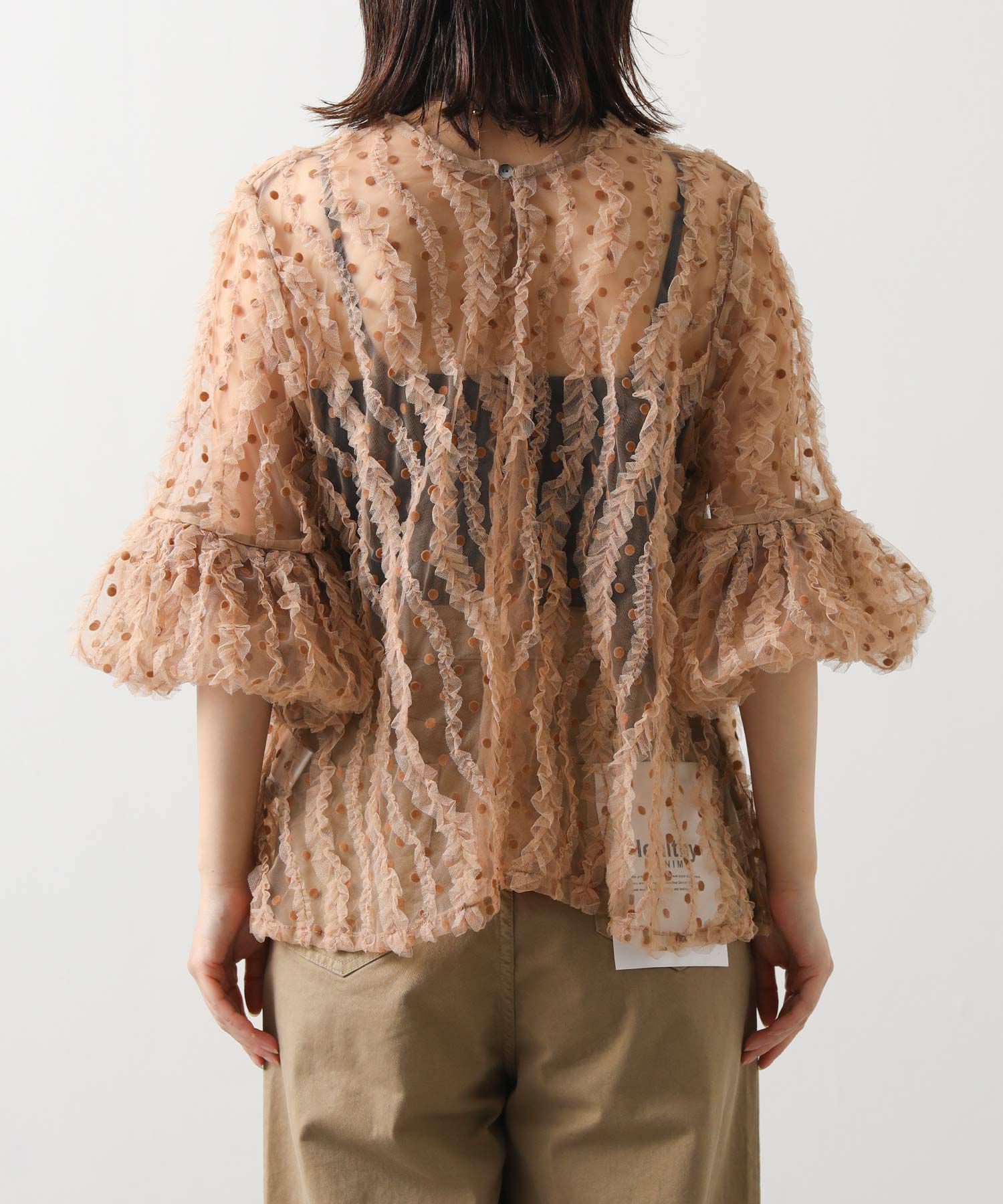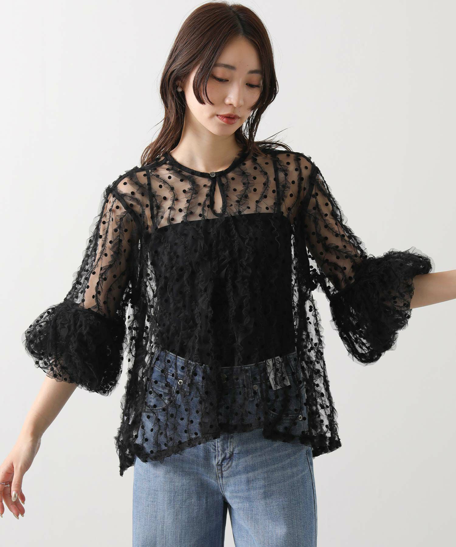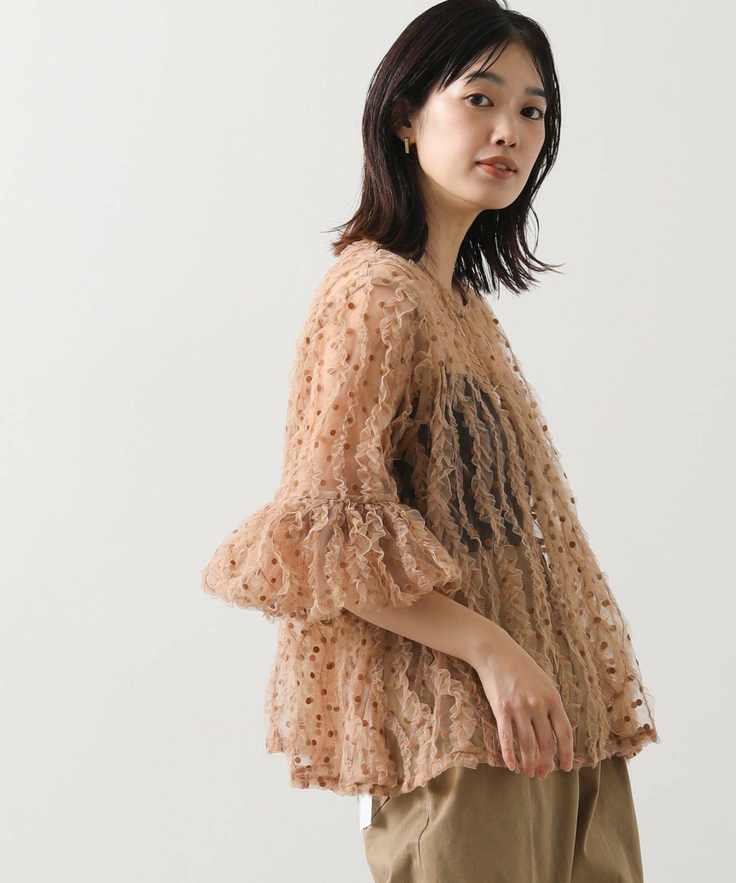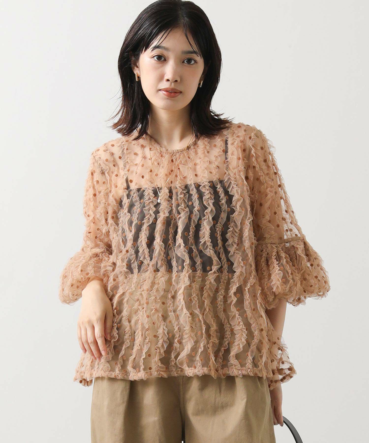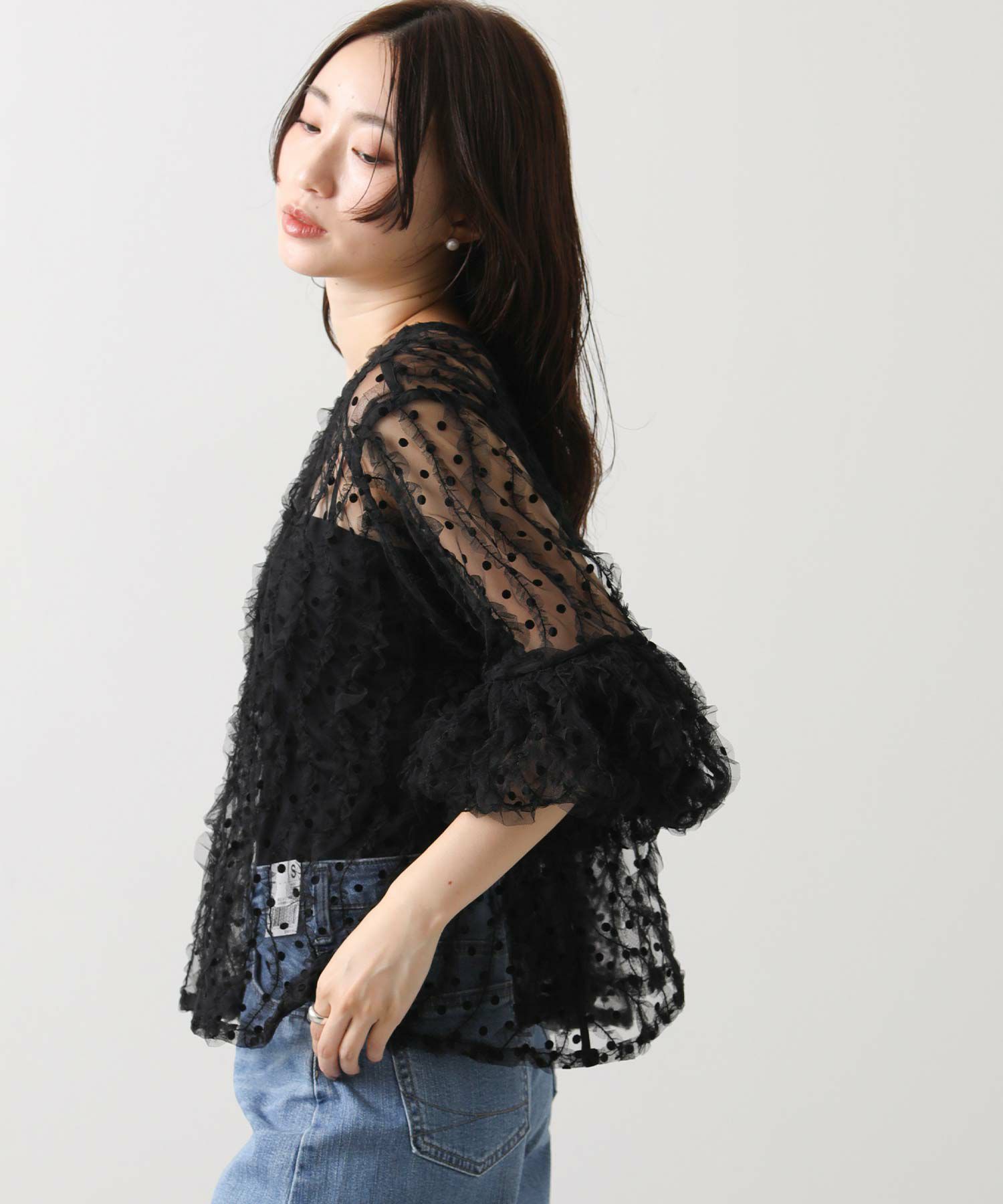 【TorrazzoDonna(トラッツォドンナ】から、チュールにベロアドットがプリントされた生地に、プラスでチュールフリルが波形に縫製されたファンシー生地のブラウスをセレクト。