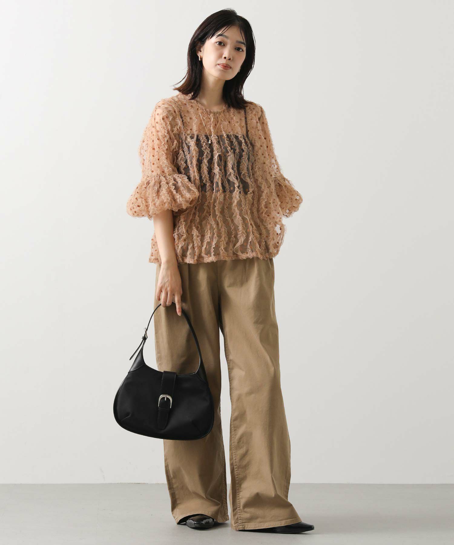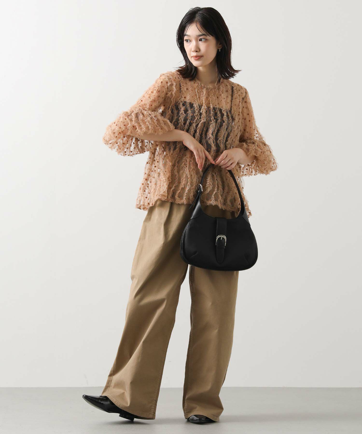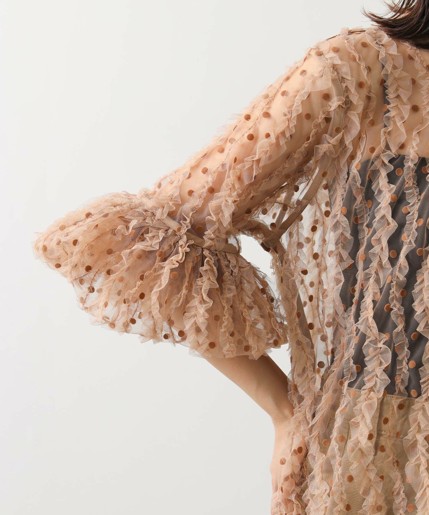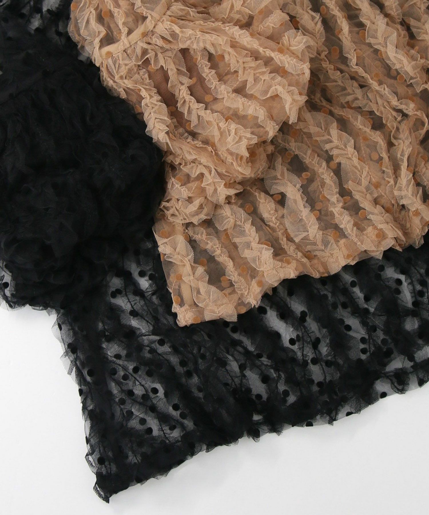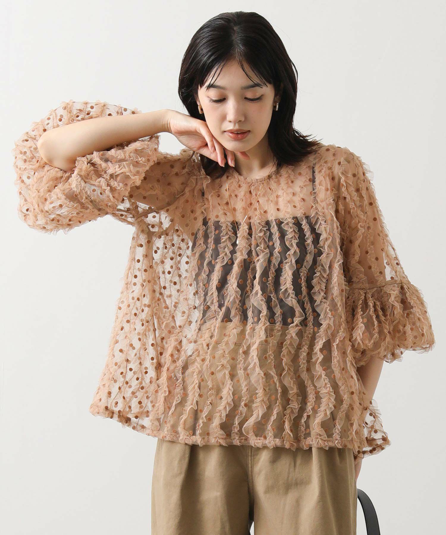 【TorrazzoDonna(トラッツォドンナ】から、チュールにベロアドットがプリントされた生地に、プラスでチュールフリルが波形に縫製されたファンシー生地のブラウスをセレクト。