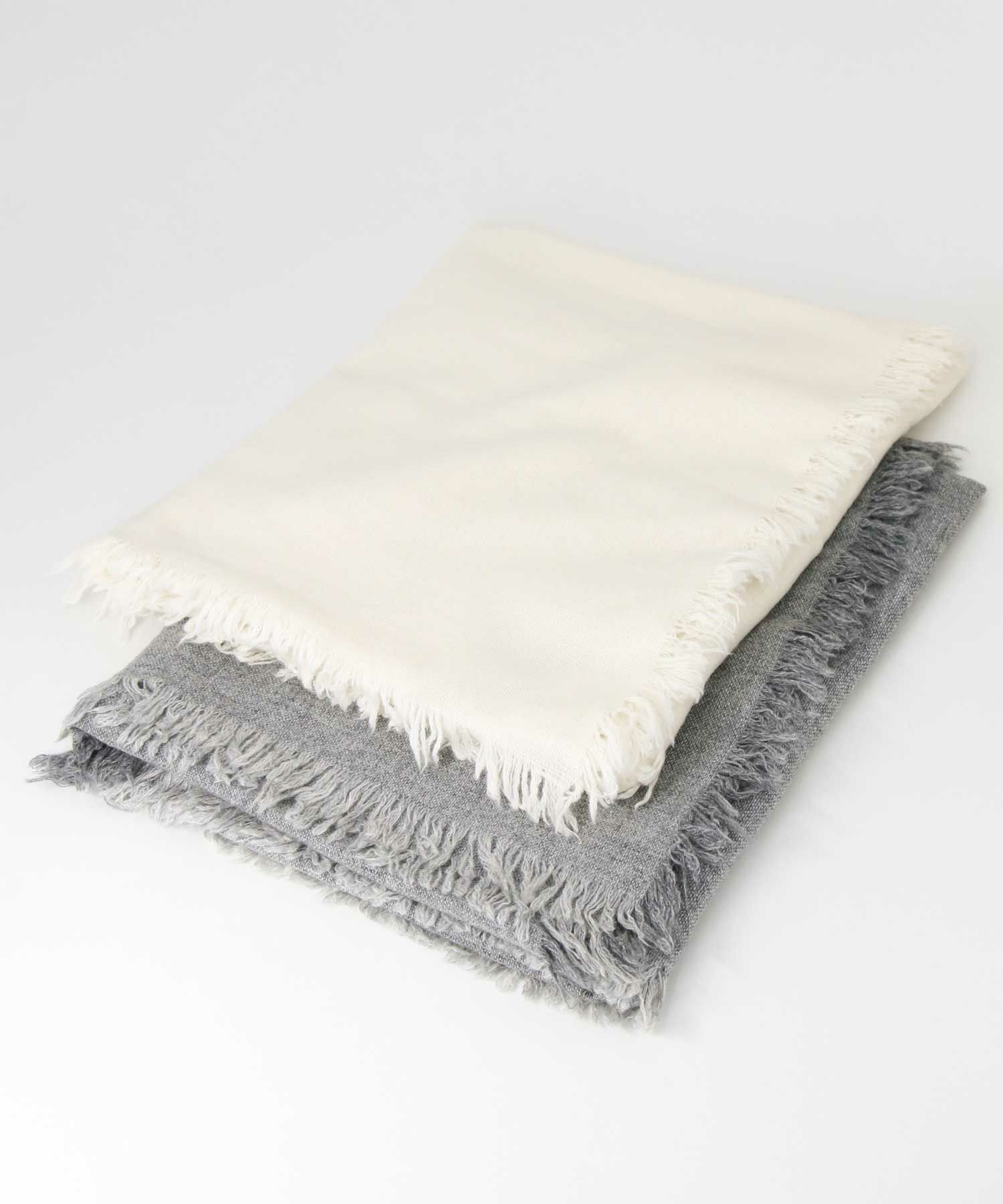 幅広のストールは肩掛け用としても首に巻いてもサマになる万能アイテム。