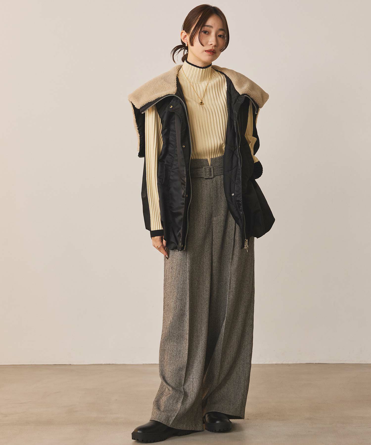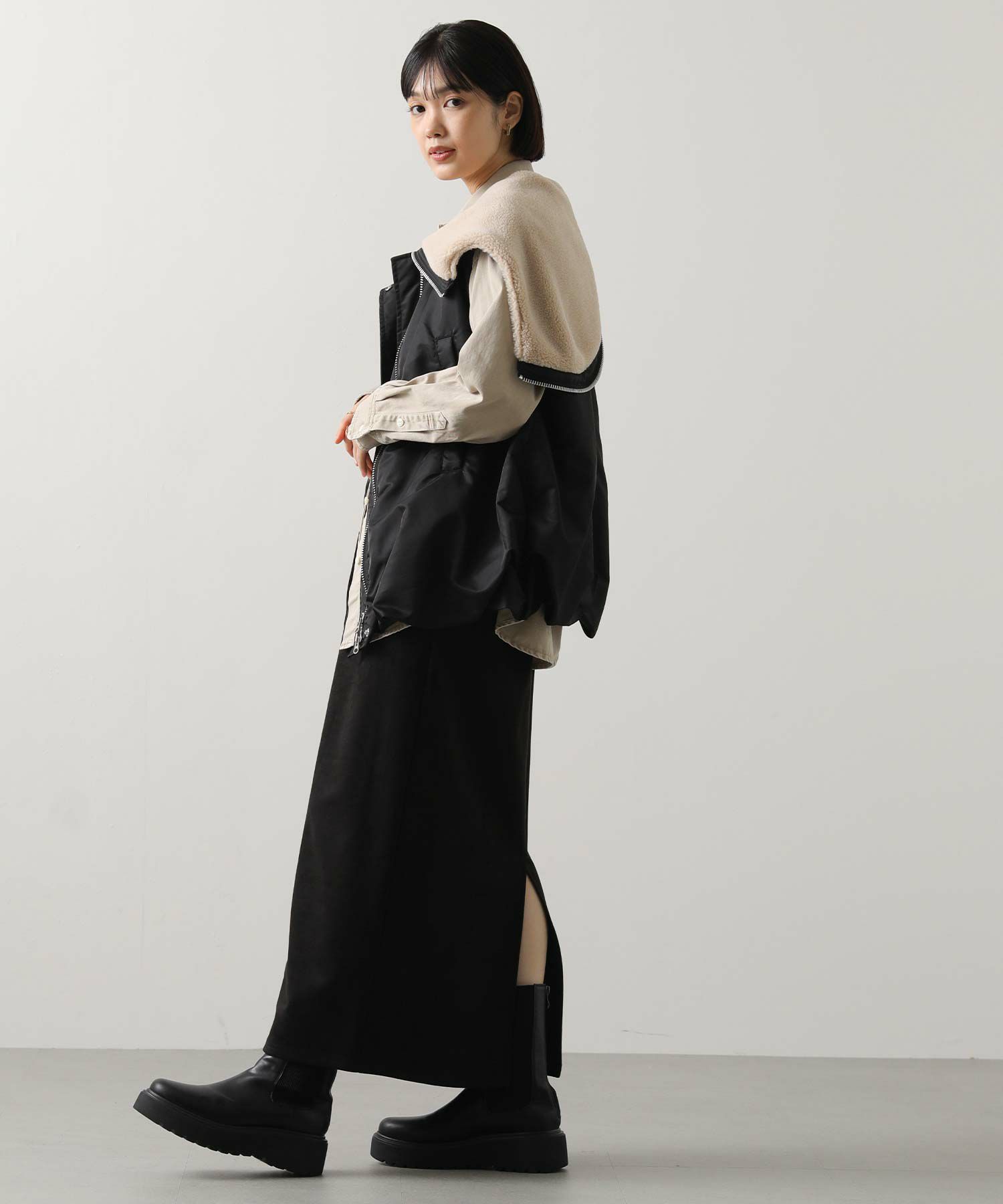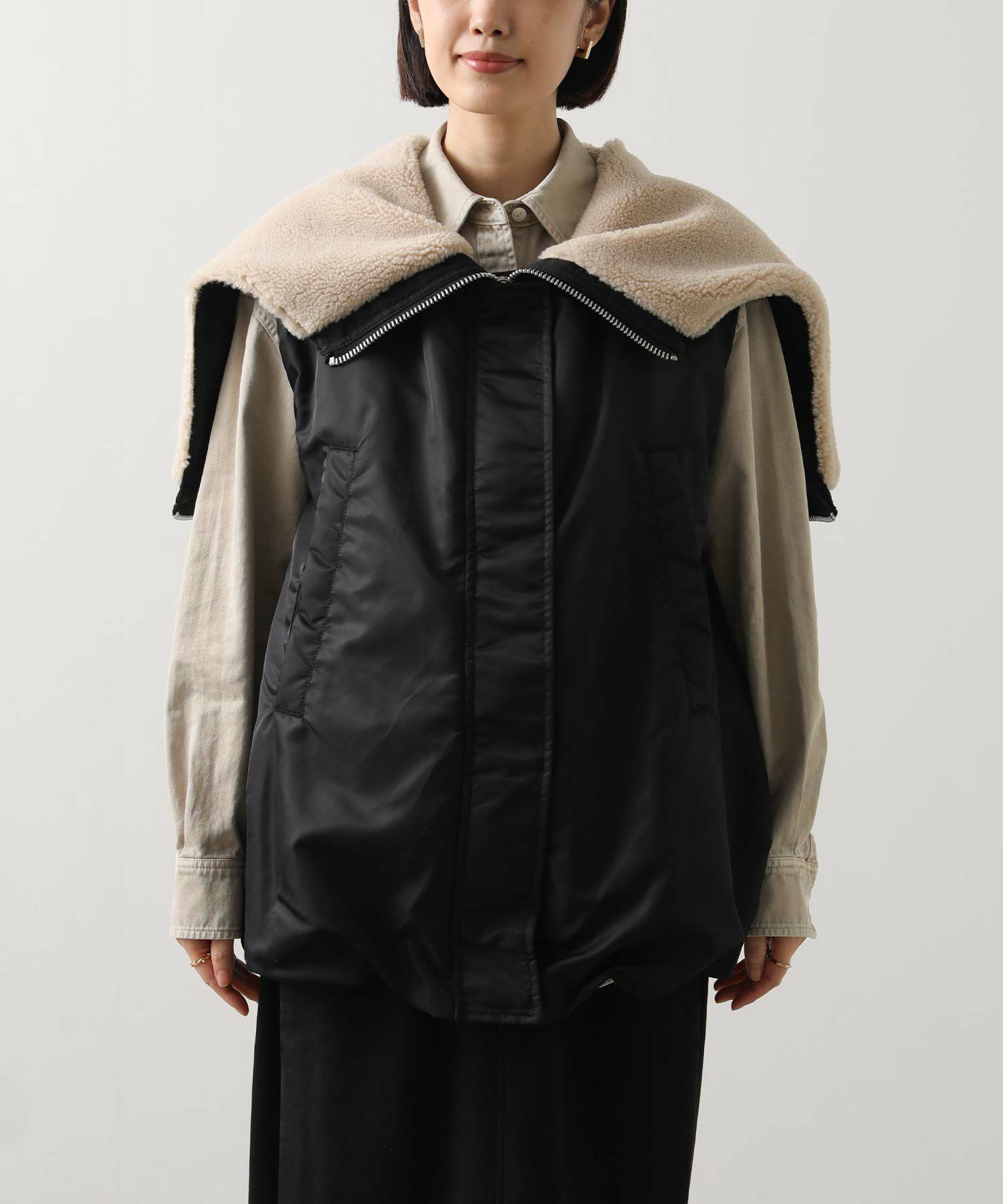 【Munich(ミューニック】から、ミリタリーなデザインを施したナイロン×ボア×中綿のコンビの、丸みあるフォルムで女性らしさを感じられるベストをセレクト。