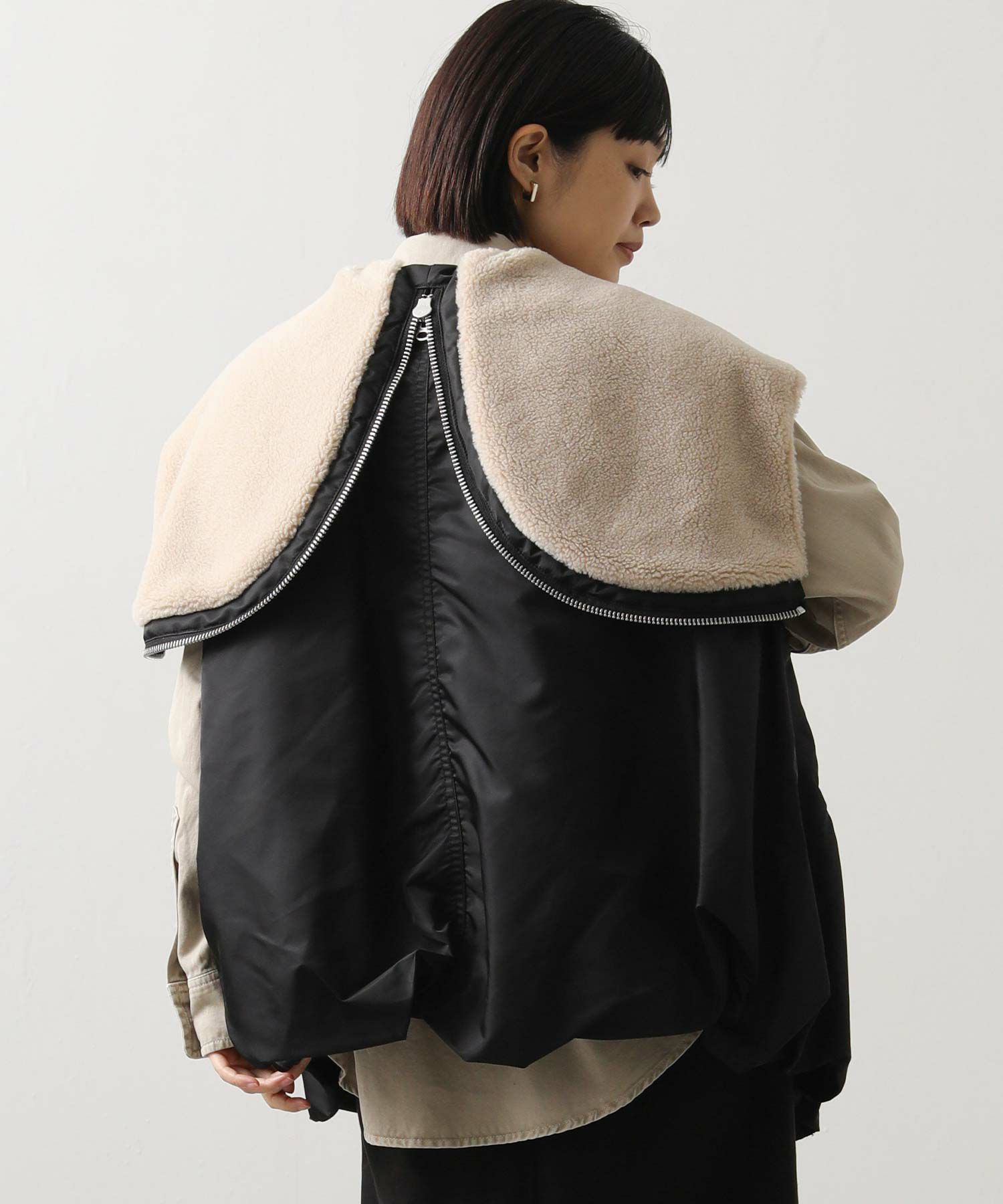 ファスナー付きのスタンドフードはファスナーを大きく開けることでセーラーカラーのように背中側で大きく垂らす着方ができたり、フロントは大型の逆開ファスナー使いなのでスタンドフードは高めに閉じてヘム側は開いたり、着方のアレンジが豊富なアイテムになってます。