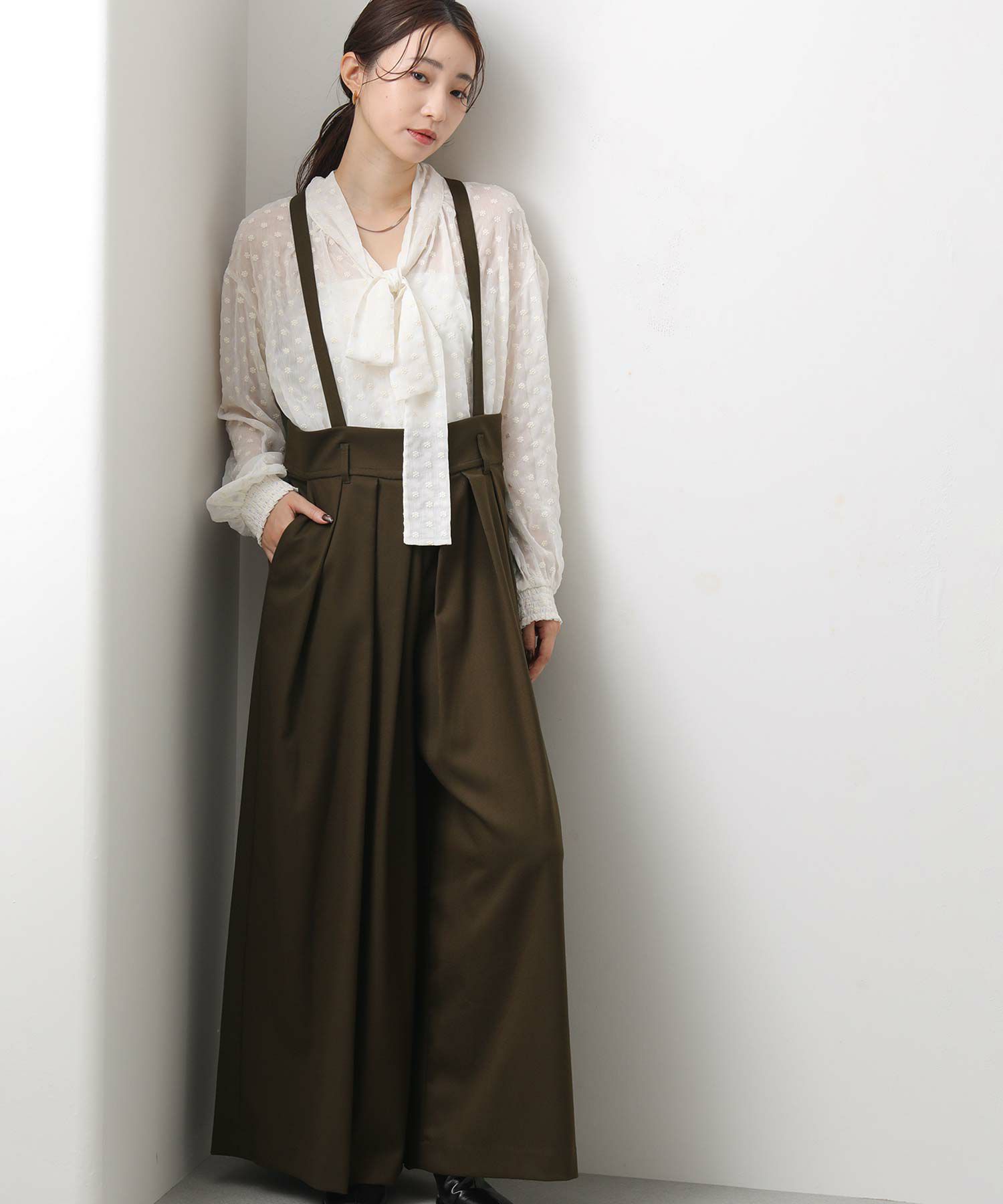 ウエストは大きめでベルト仕様になっており、フロントのたっぷり入ったタックがハの字に広がり、共布の肩ひもベルトで吊って着用するアイテムです。
