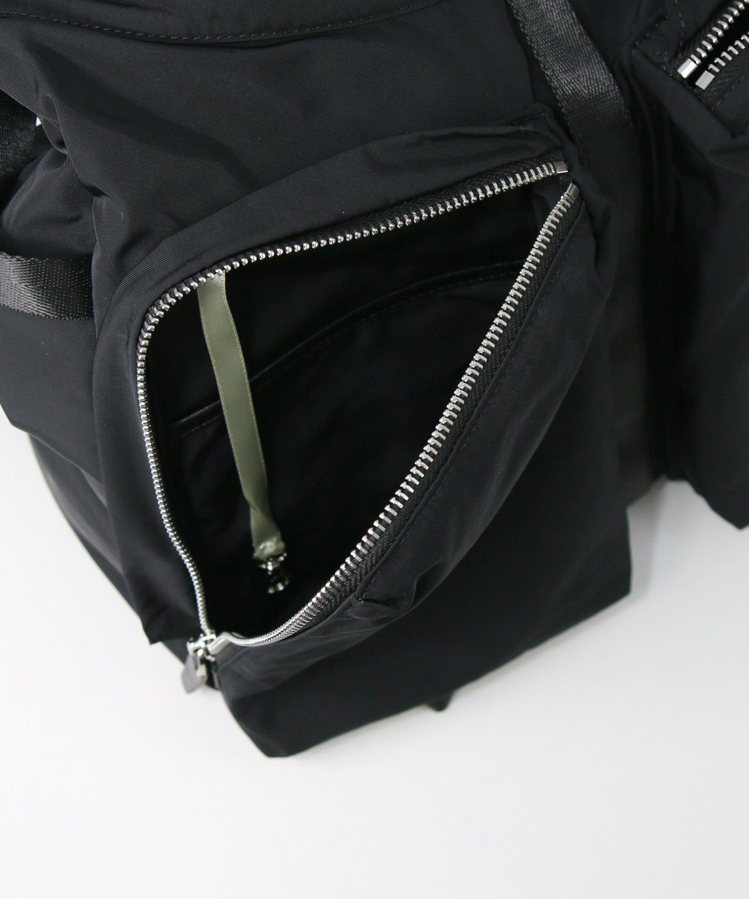 ファスナー仕様の大きなフロントポケットは500mlのペットボトが収まるサイズ。