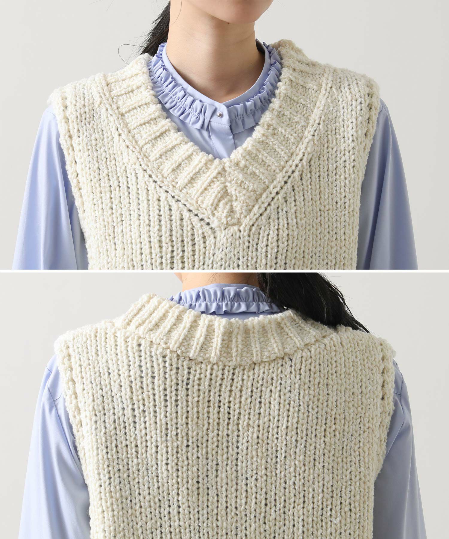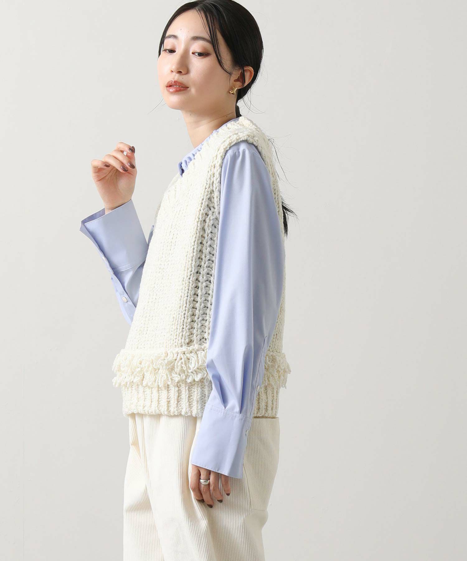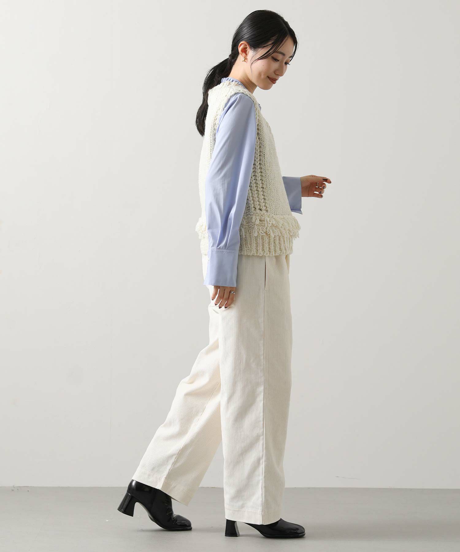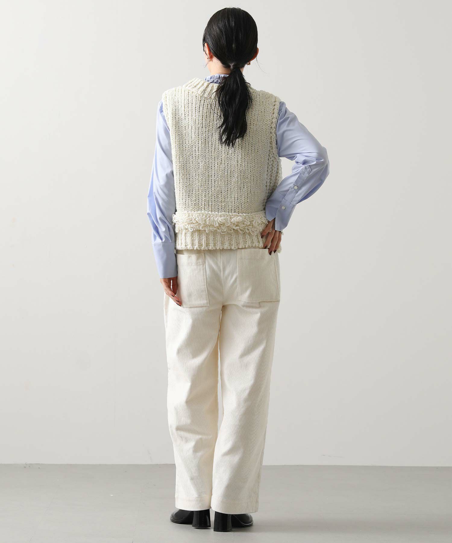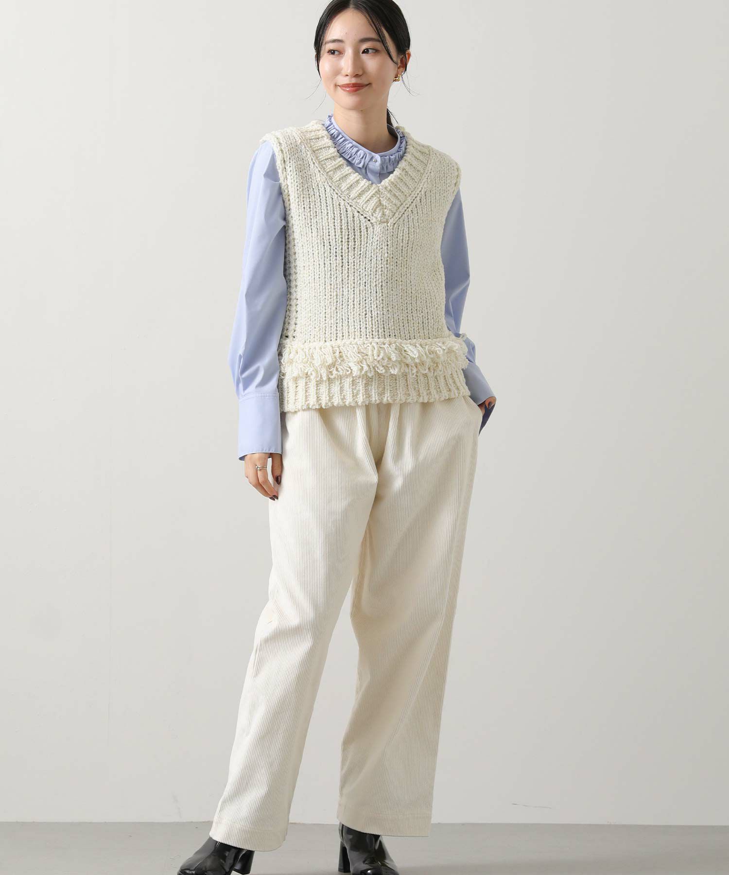 手編みのような立体感あるニットべストと畝の大きいコーデュロイパンツとを組み合わせた、唯一無二のデザイン。