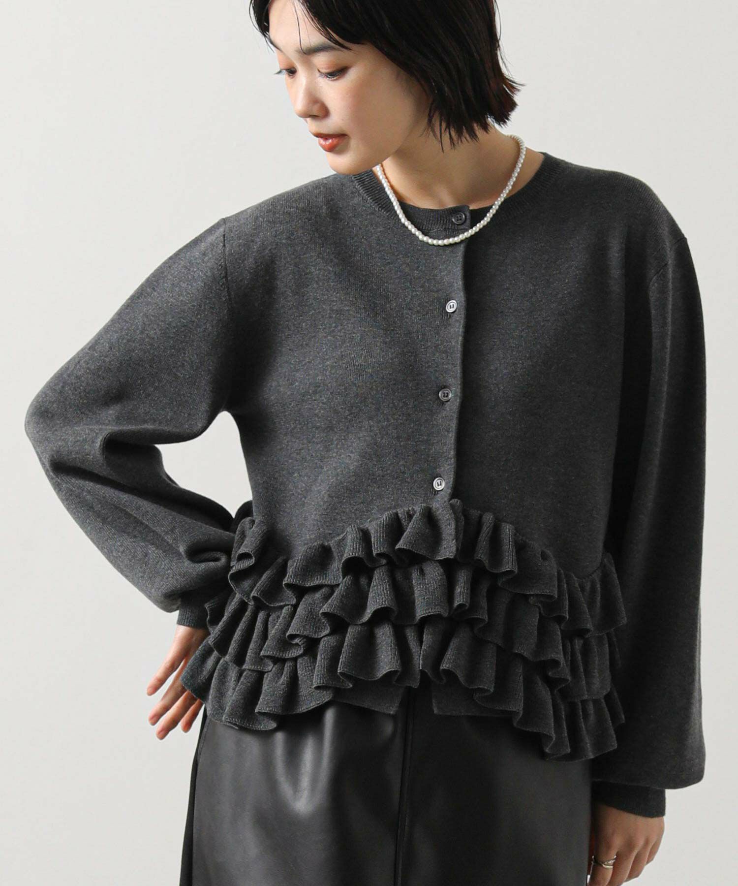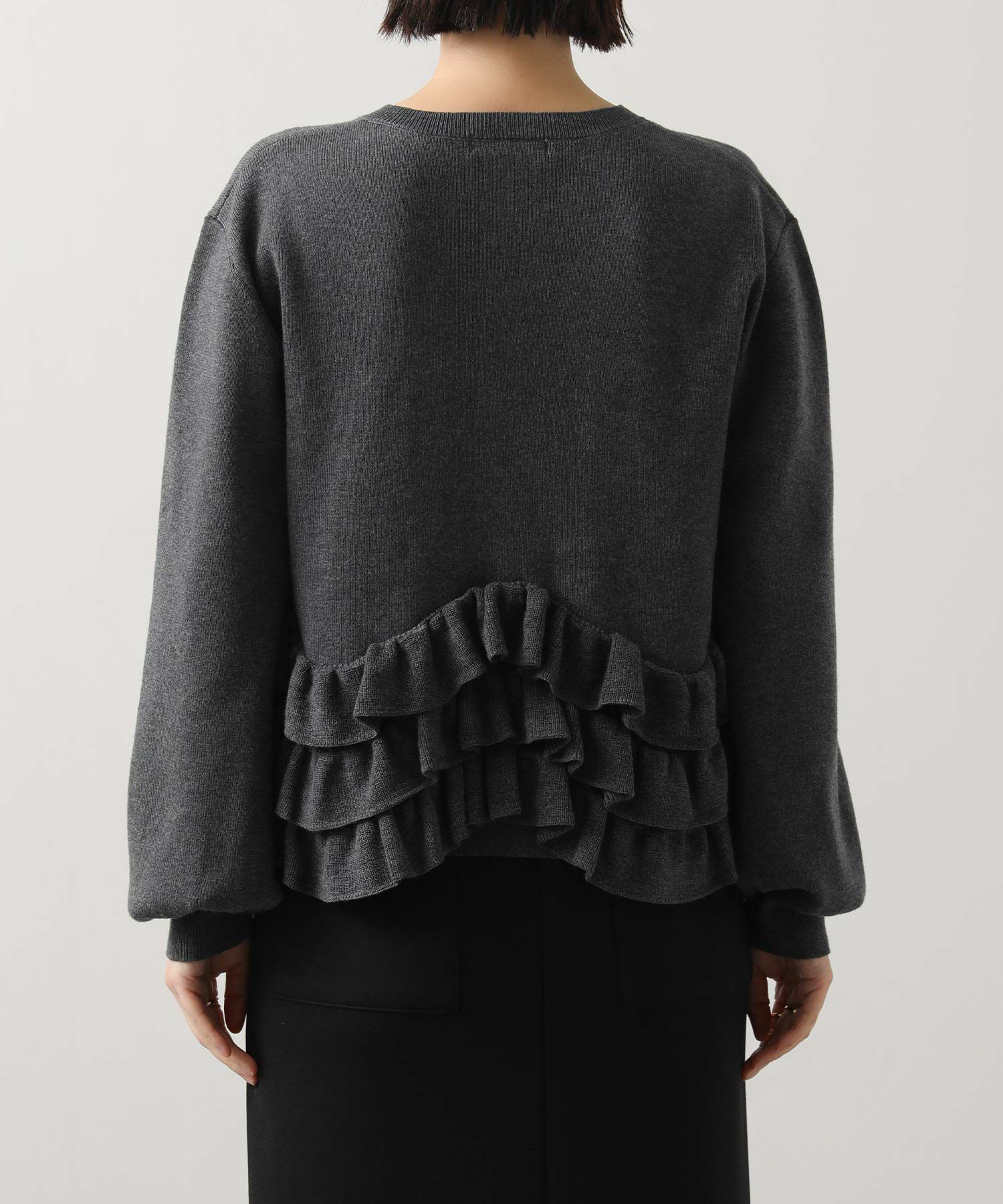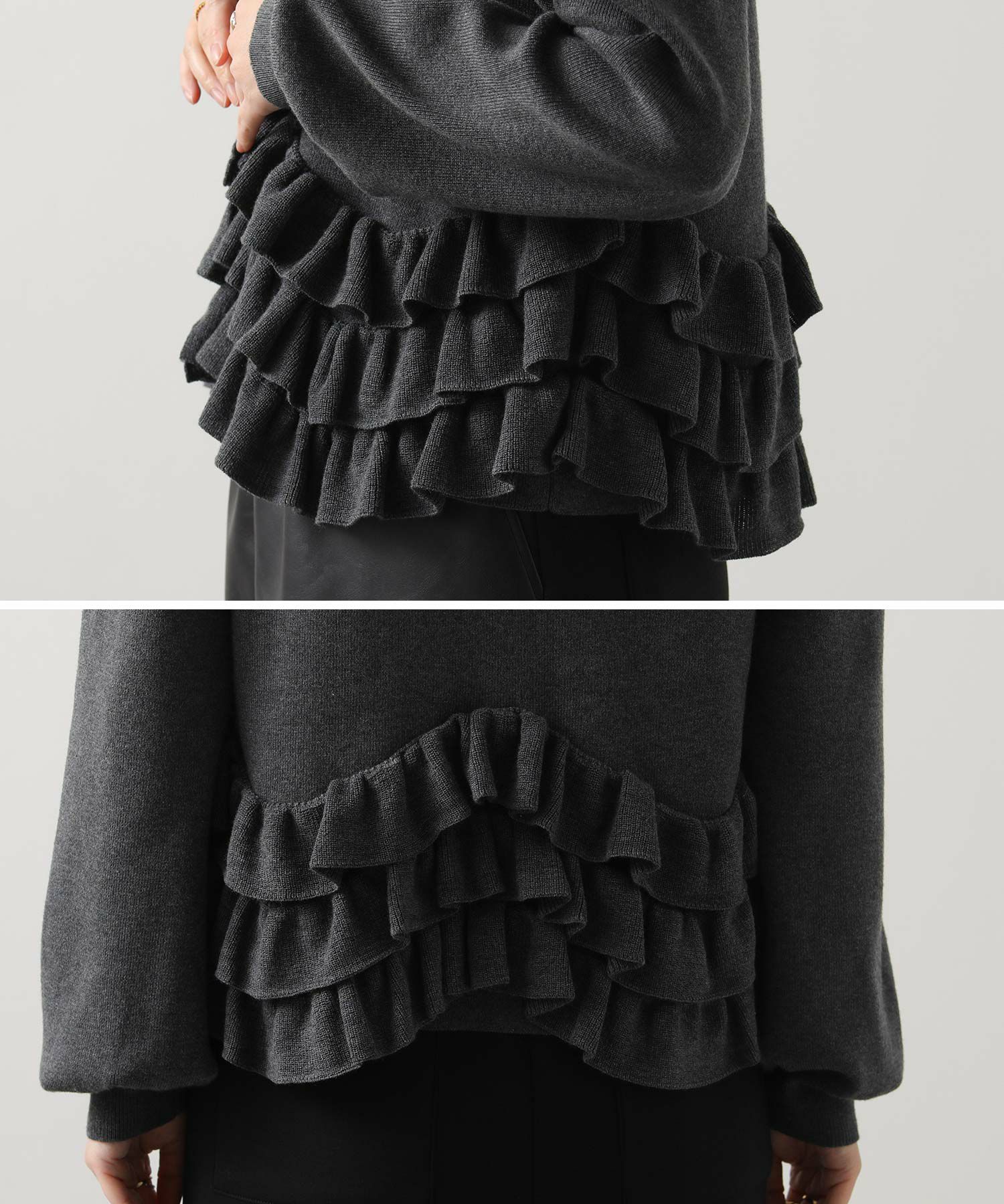 ニットの編みで作るフリルをティアードにして付けることによって、新しいフリルの見え方を表現。