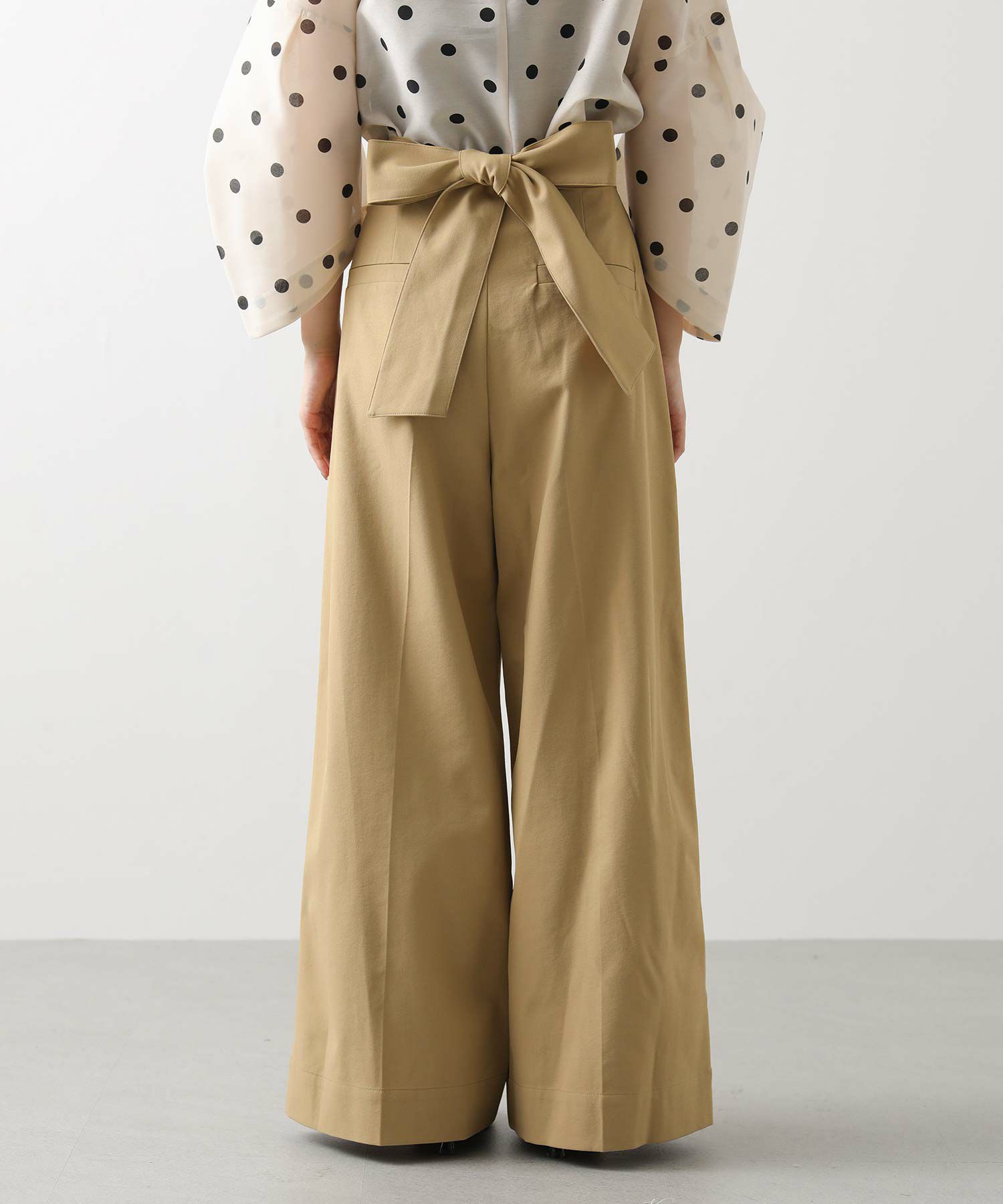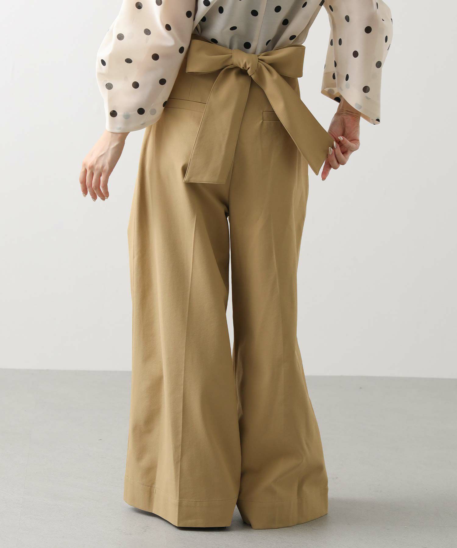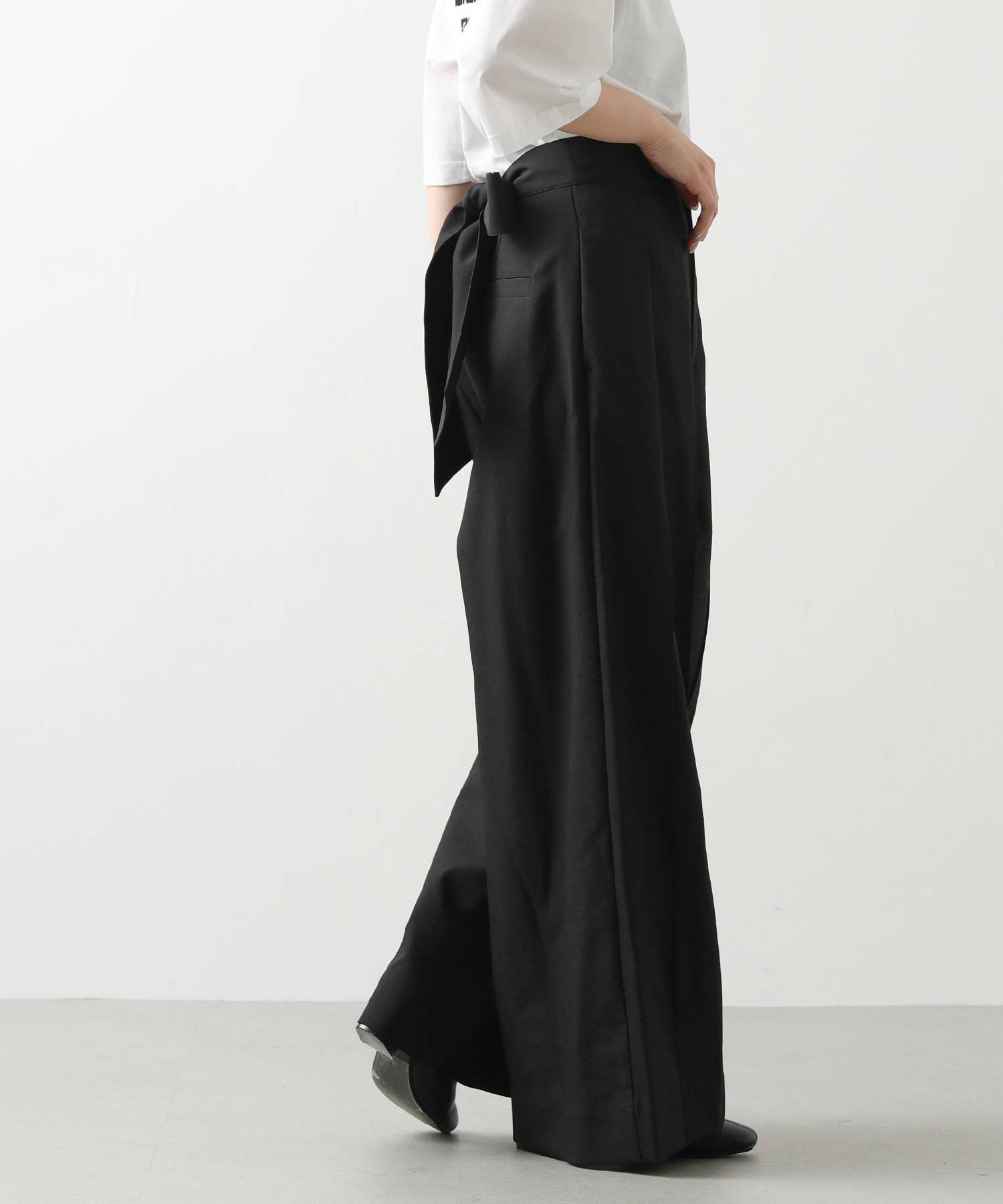 【Mewl(ミュール】から、バックスタイルの大きめリボンがポイントになったピンタックワイドパンツをセレクト。