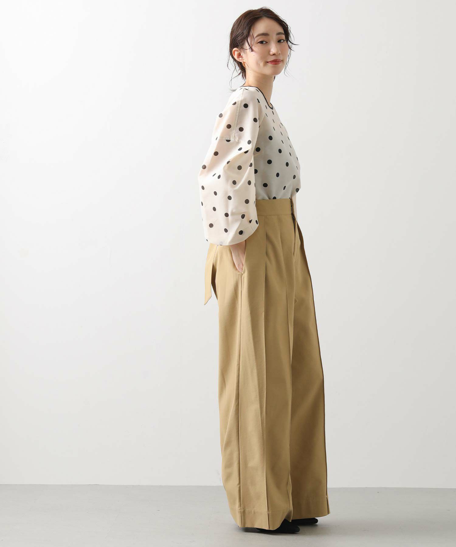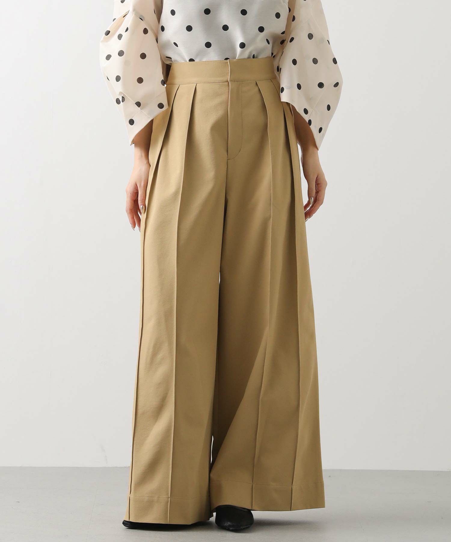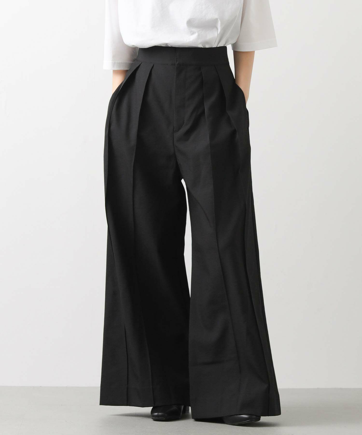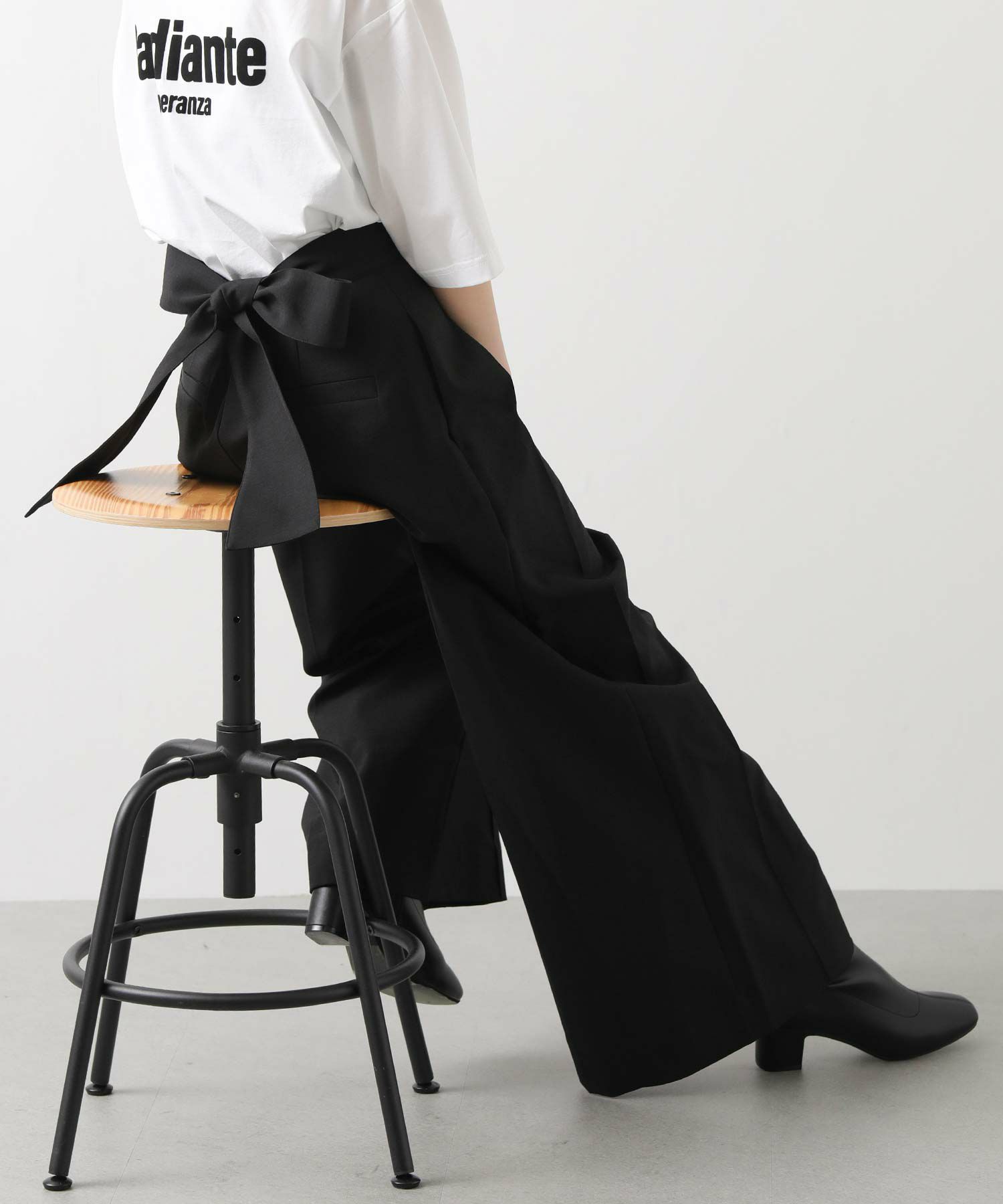 【Mewl(ミュール】から、バックスタイルの大きめリボンがポイントになったピンタックワイドパンツをセレクト。