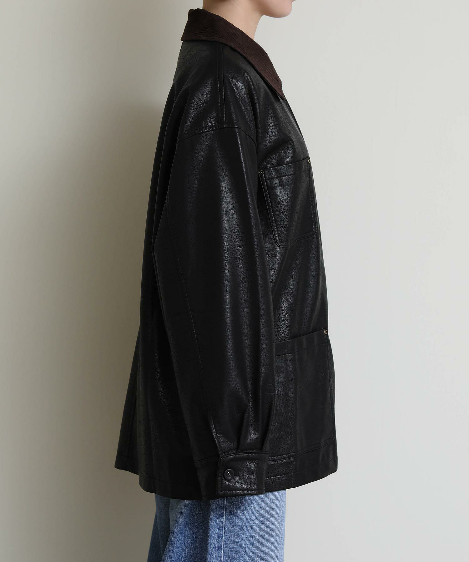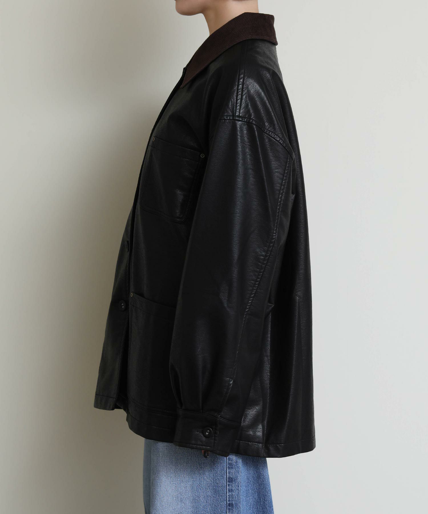 カジュアルなデザインが魅力のカバーオールを、秋らしくフェイクレザーで仕上げました。