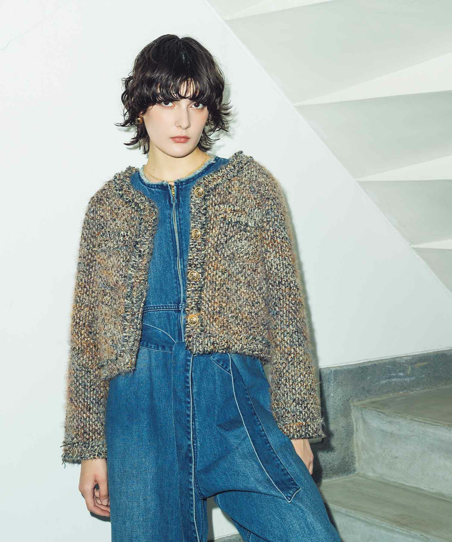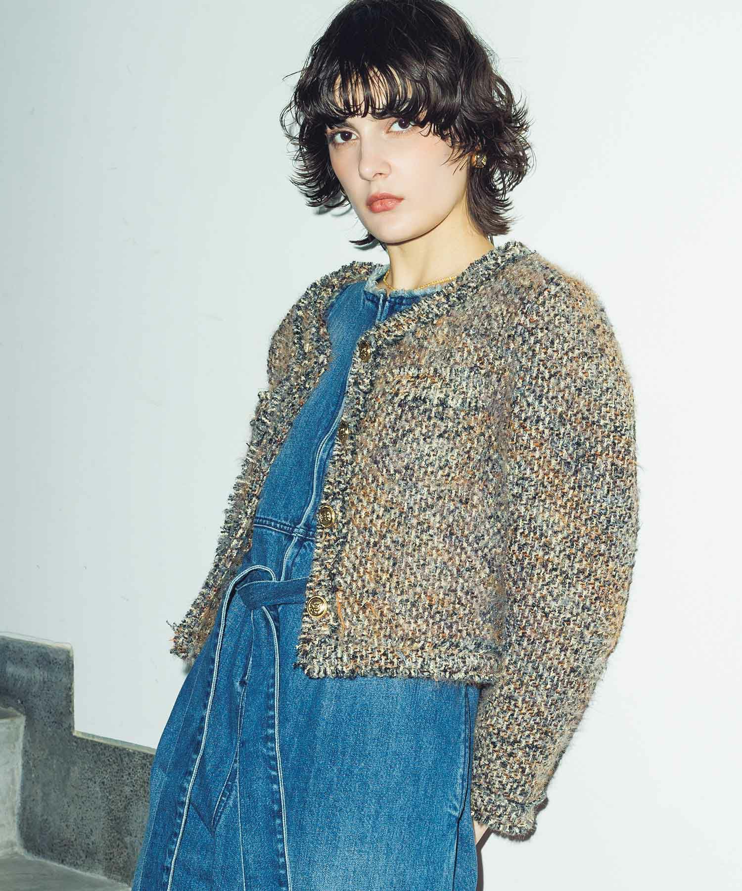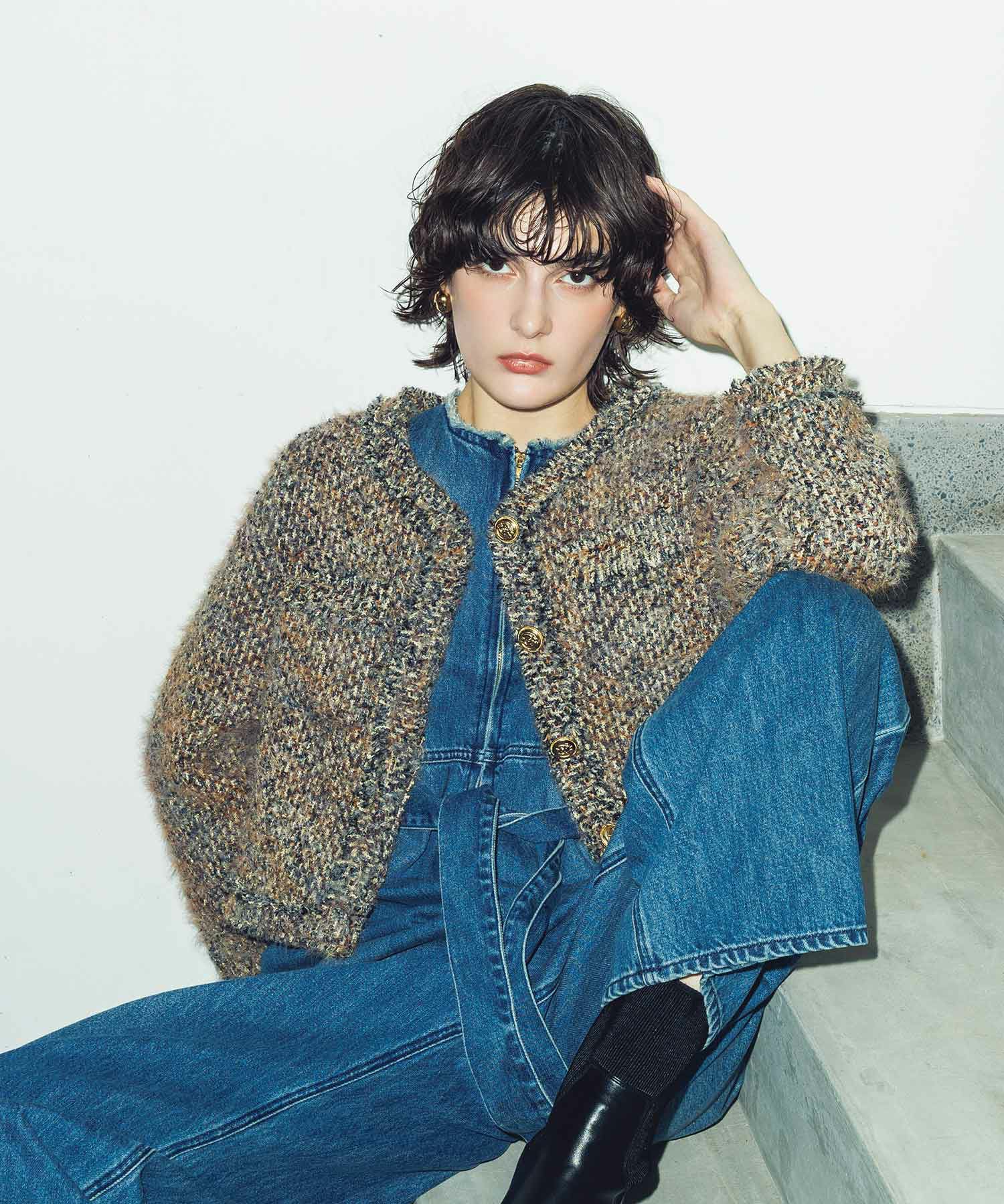シルエットはコンパクトでバランスの取りやすいボクシータイプ。きちんと感はありながら、フリンジやヘアリーな表情を取り入れることで、程よく力の抜けた“大人のカジュアル感”を演出。デニムと合わせてカジュアルダウンしたり、ワンピースやスカートと合わせて、ドレッシーに着こなしたりと、幅広いスタイリングが楽しめます。