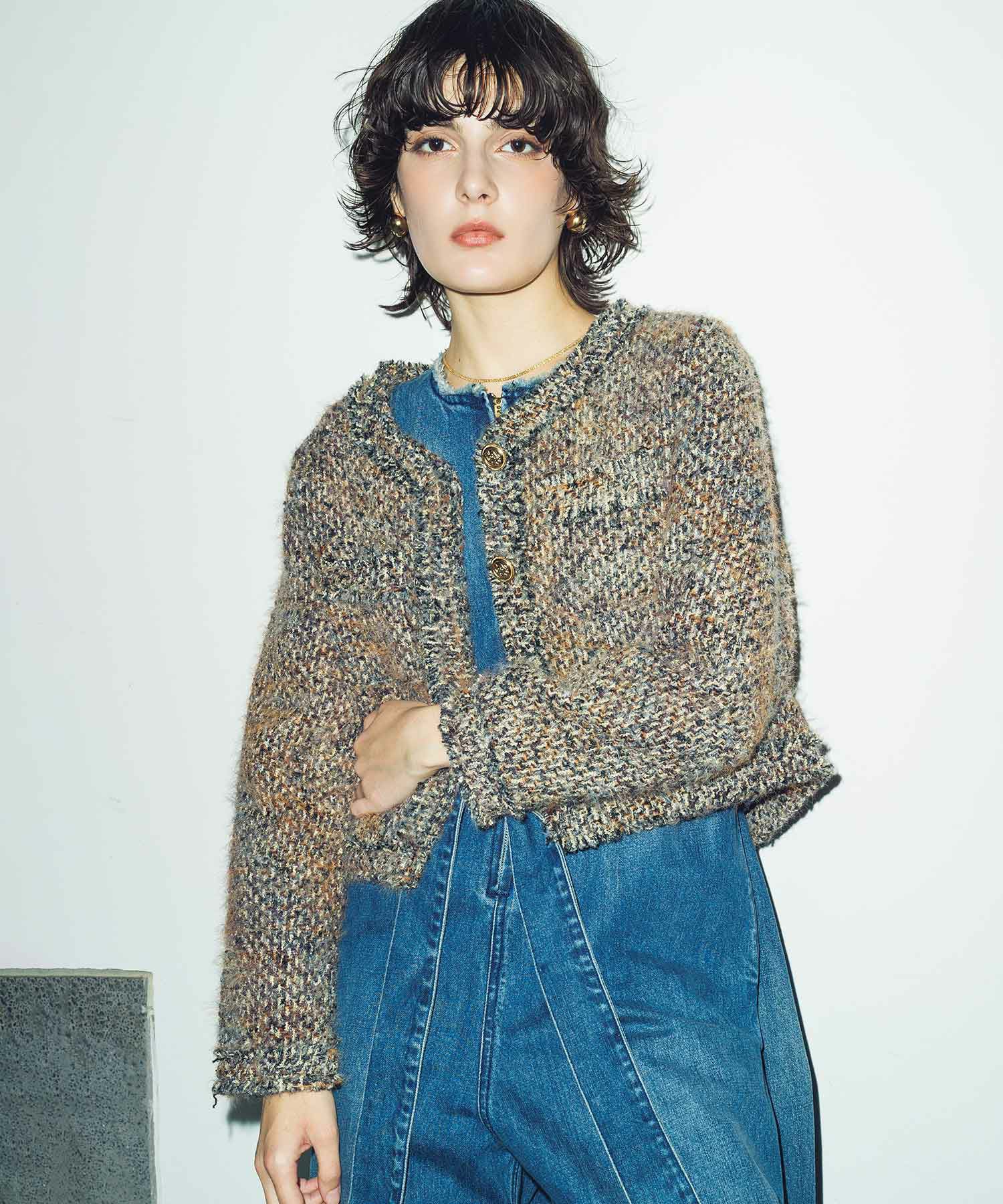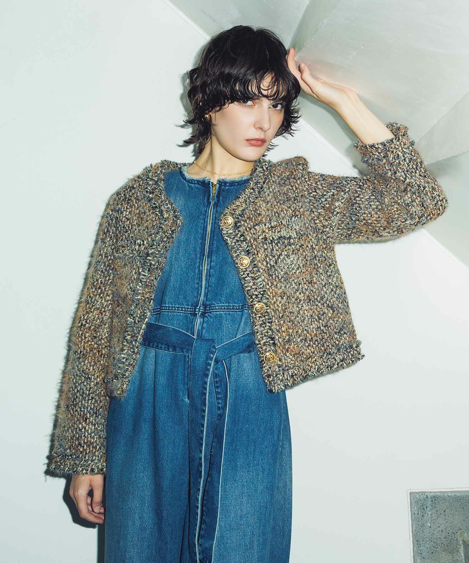 ミックスカラーの色合いにファーのようなふわふわとした起毛感が魅力のツイードジャケット。
