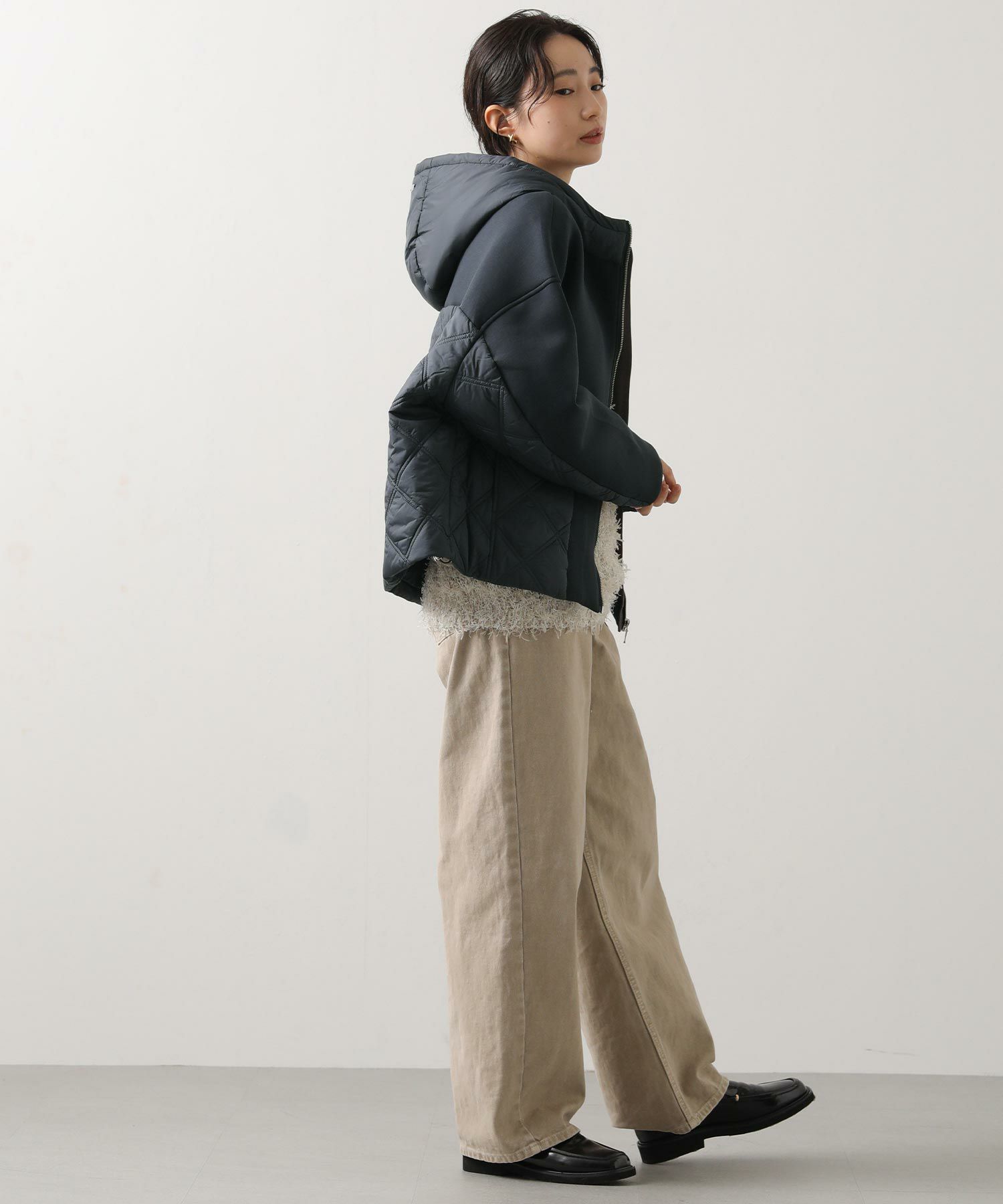 サイドや後身頃、フードのキルティング切替がアクセントに。