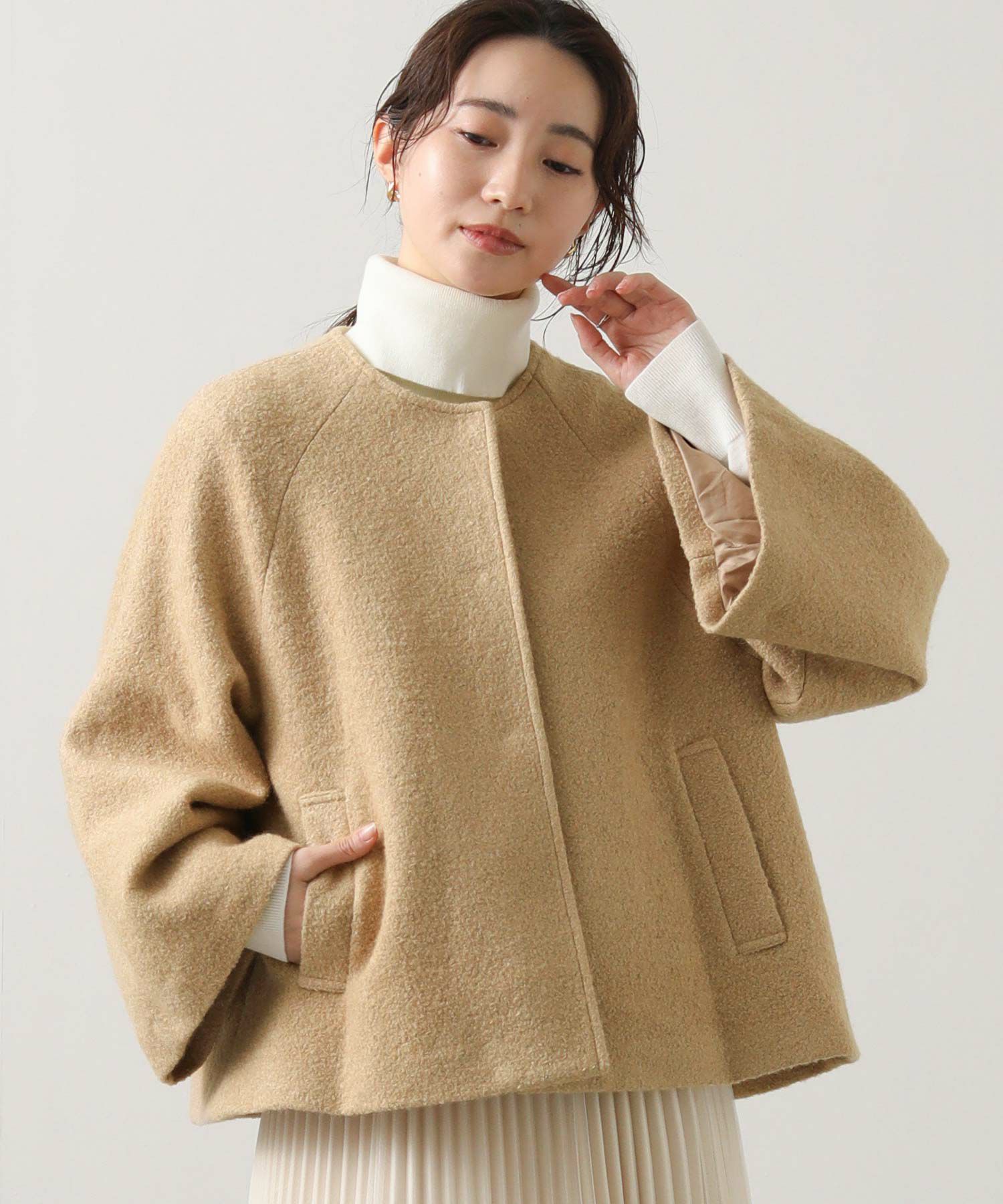 ブークレのふっくらした見た目がかわいい、大人フェミニンなケープコート。