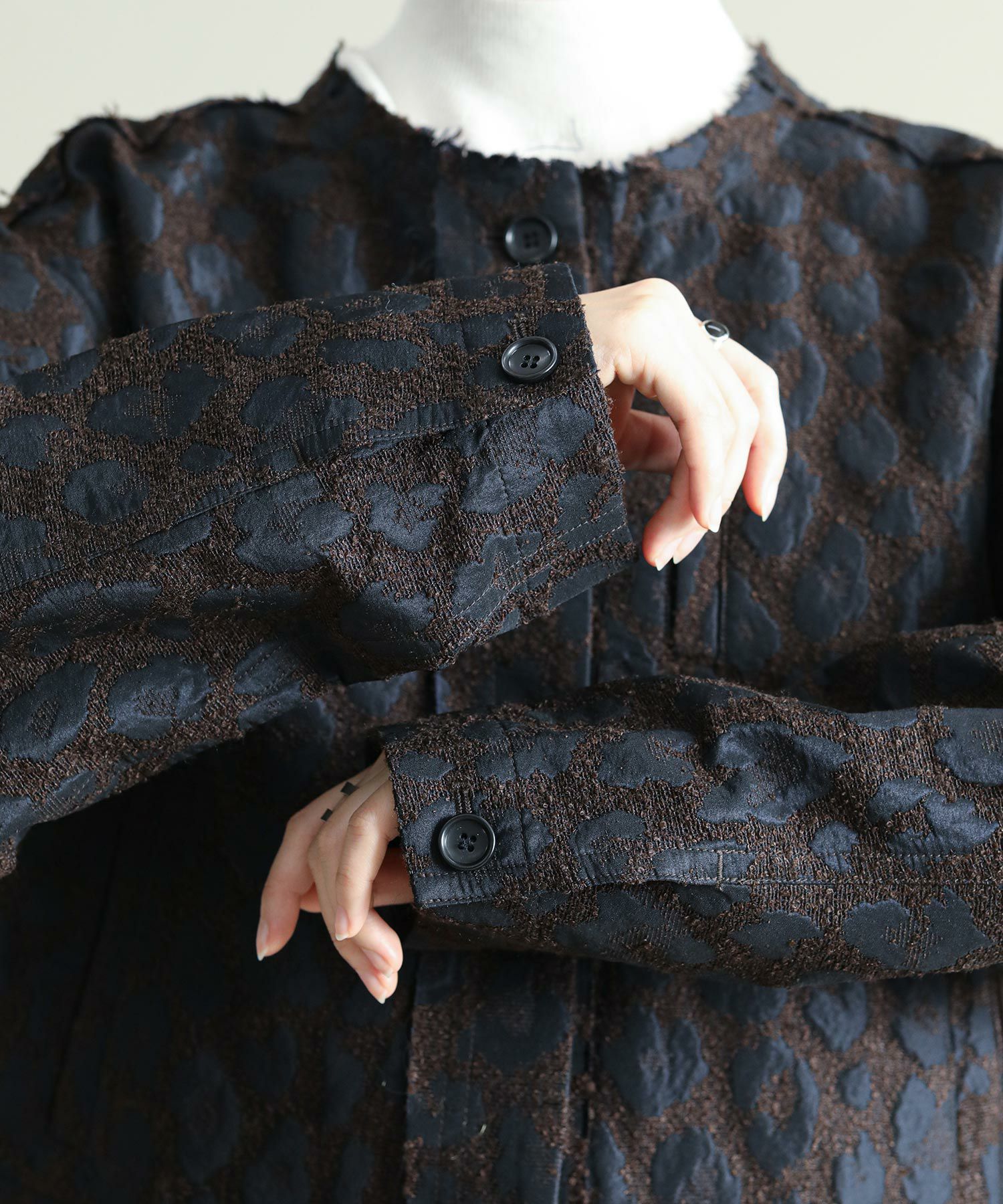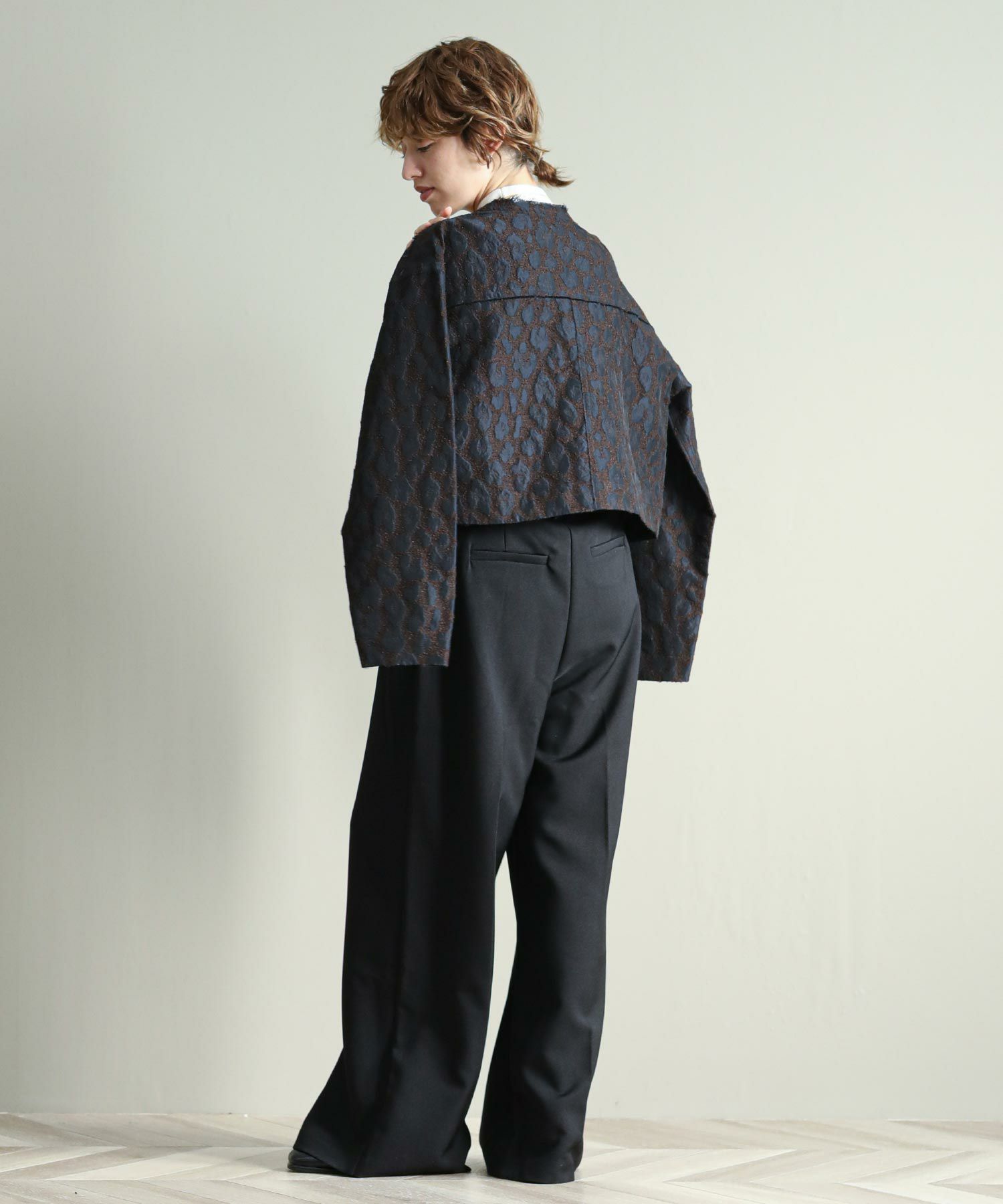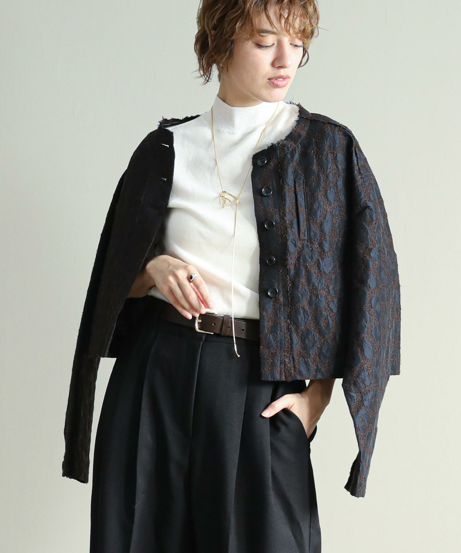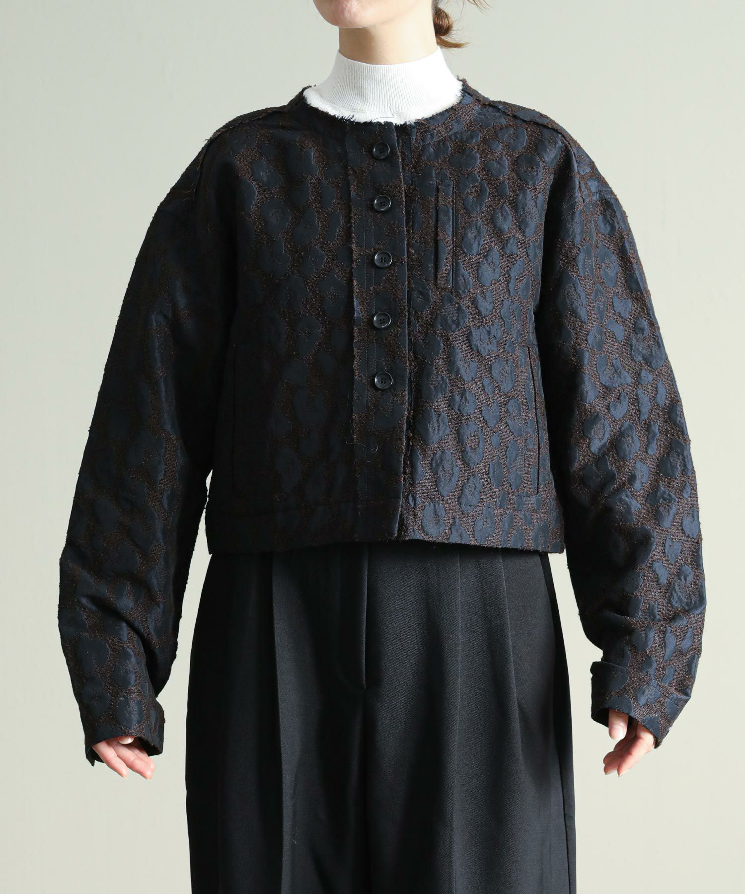 桐生で織り上げたオリジナルの国内素材が使用されています。細いループ糸と微光沢糸を使い、立体感あるジャガード生地です。派手過ぎないレオパード柄で、上品に着ていただけます。襟ぐりや前立て、ヨーク切り替えはカットオフで抜け感をプラス。さりげないベロアテープアクセントもポイント。脇ポケット口にはパイピングを挟み込み、襟ぐりの体側にはテープを叩きつけています。ワイド目の身幅とコンパクトな丈のバランスで、ボリュームのあるワイドパンツやスカートとも相性の良い一枚。