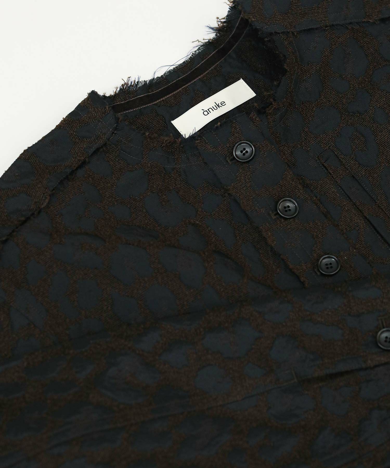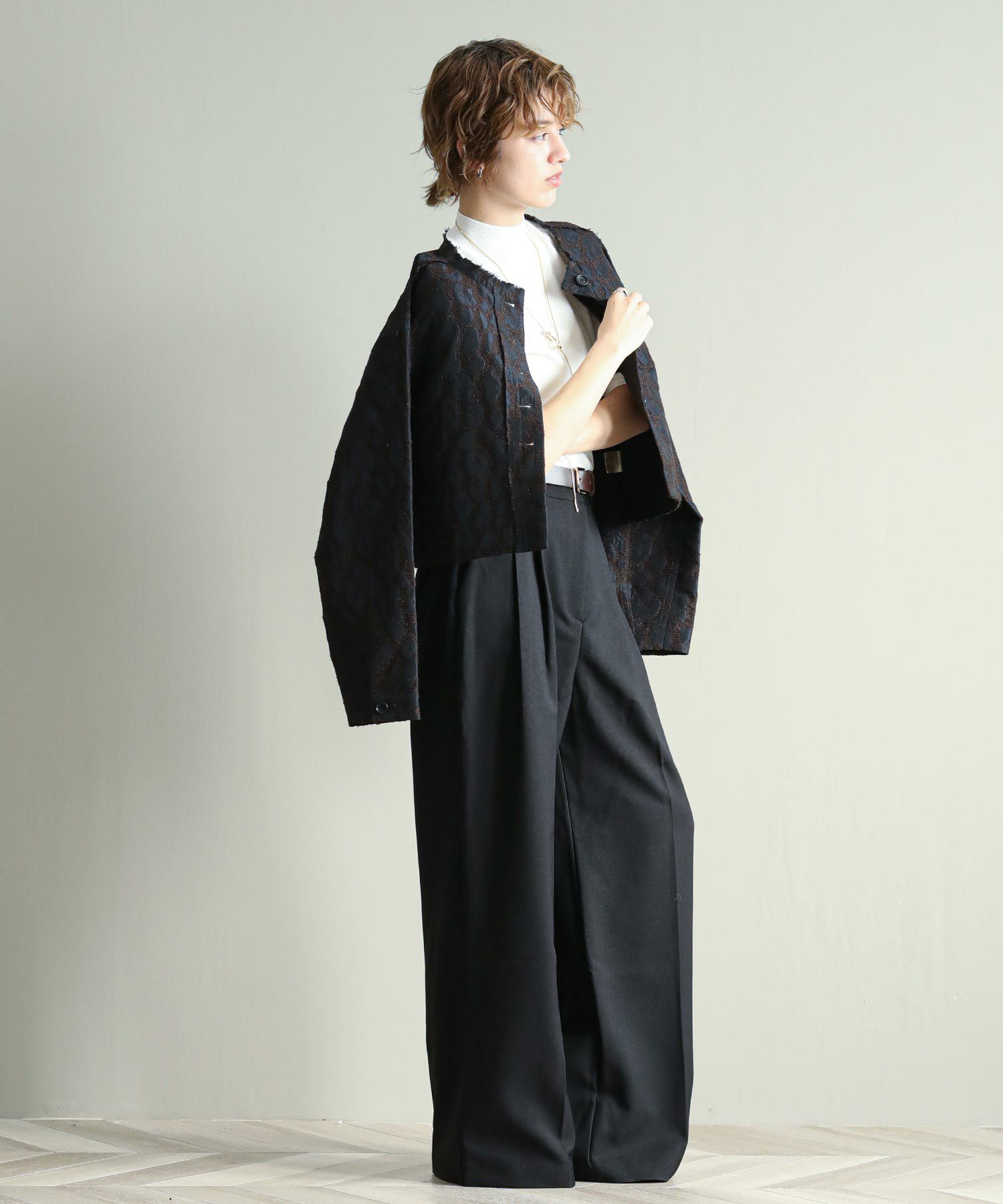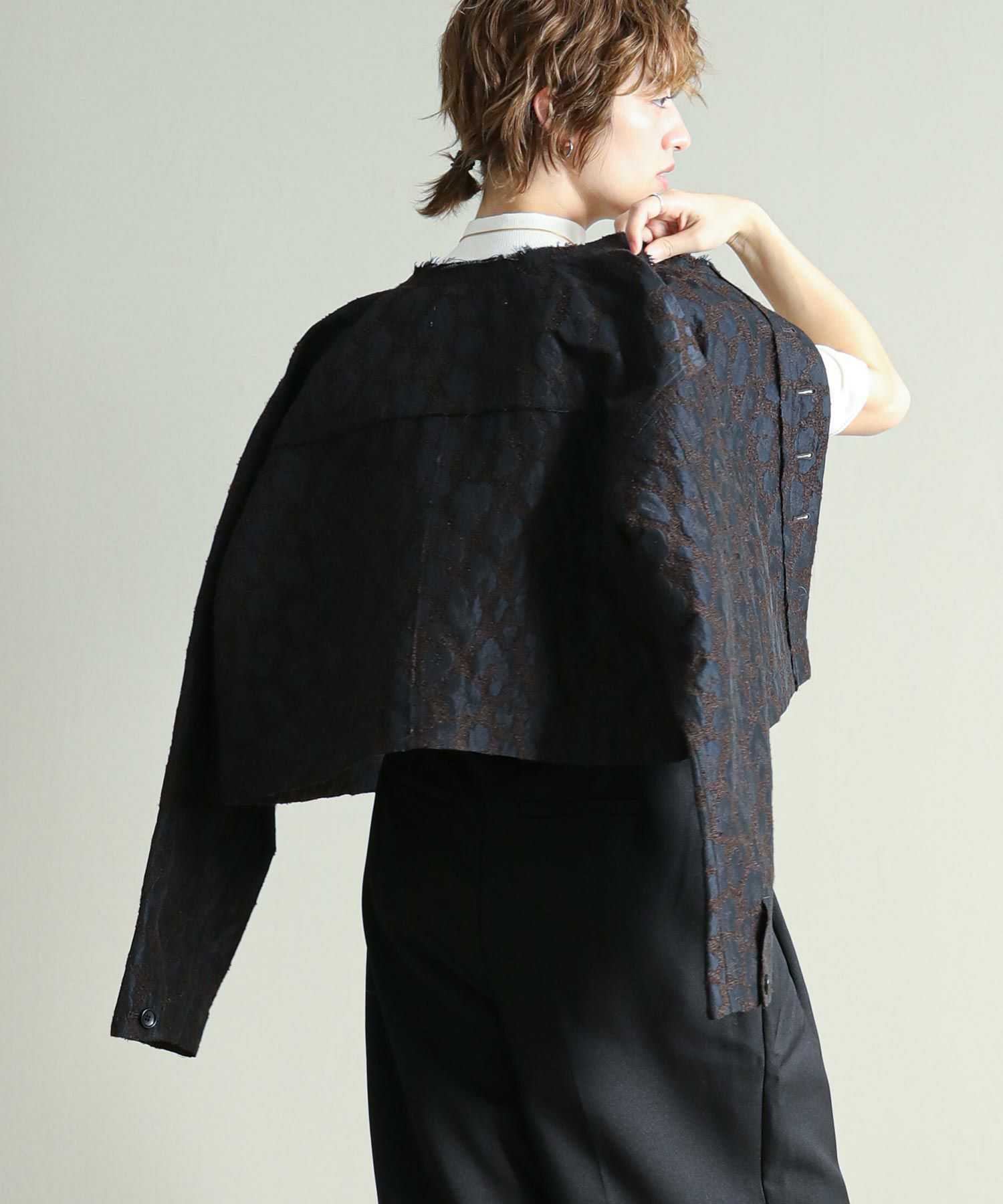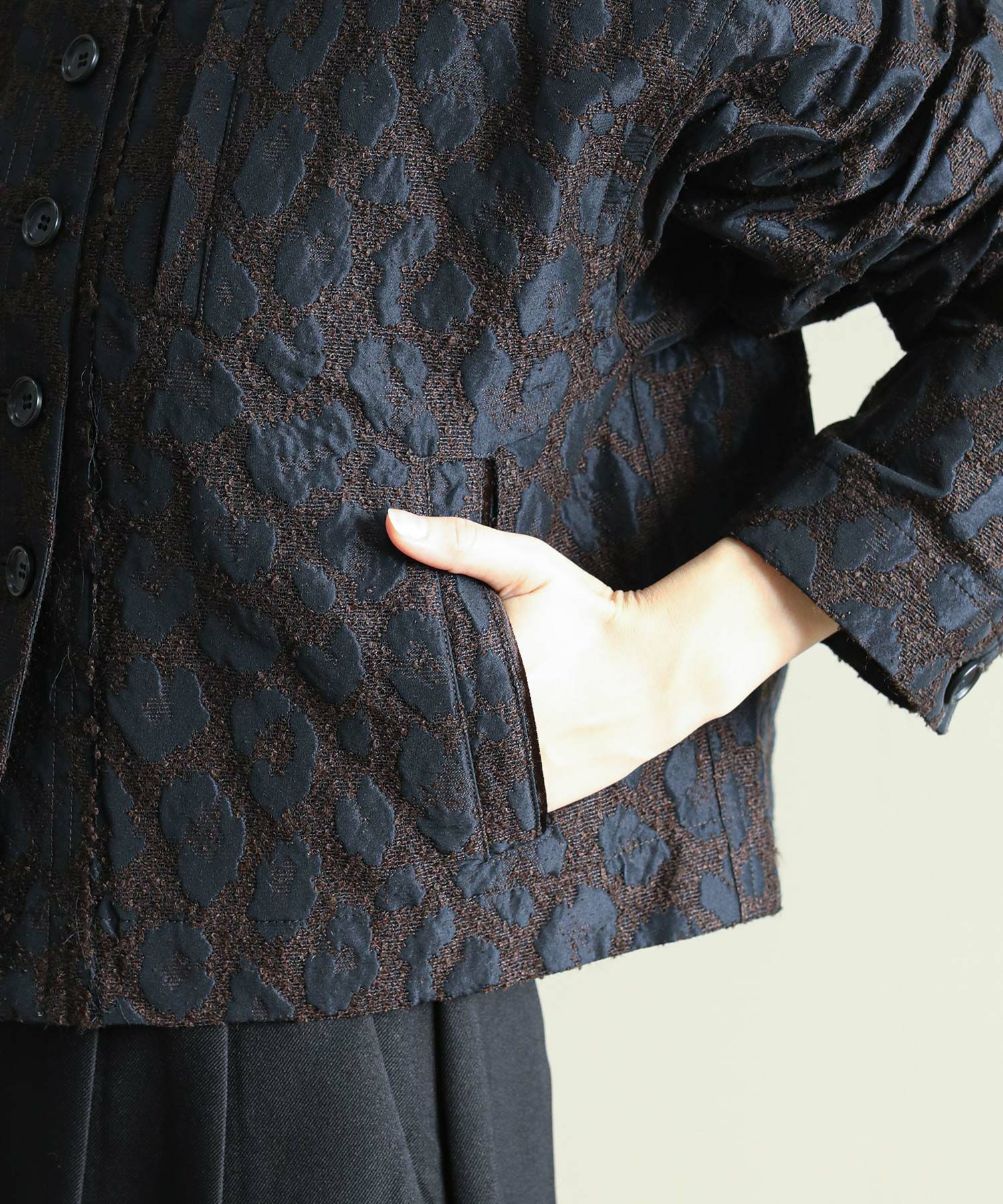 桐生で織り上げたオリジナルの国内素材が使用されています。細いループ糸と微光沢糸を使い、立体感あるジャガード生地です。派手過ぎないレオパード柄で、上品に着ていただけます。襟ぐりや前立て、ヨーク切り替えはカットオフで抜け感をプラス。さりげないベロアテープアクセントもポイント。脇ポケット口にはパイピングを挟み込み、襟ぐりの体側にはテープを叩きつけています。ワイド目の身幅とコンパクトな丈のバランスで、ボリュームのあるワイドパンツやスカートとも相性の良い一枚。