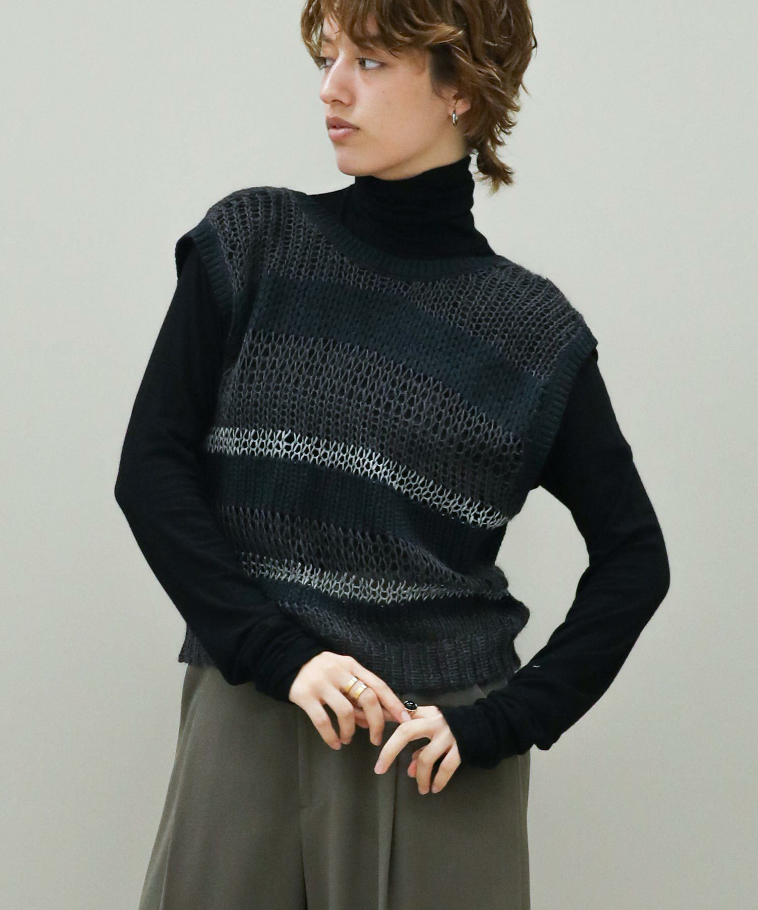 透けている部分とそうでない部分とで編み地に差をつけたボーダー柄。同じ糸を使用した部分も、絶妙に編み方を変化させています。一枚でノースリーブトップスとしてはもちろん、コンパクトな長袖トップスなどとレイヤードして、晩夏から秋冬まで長く着まわしていただけます。深めのVネックとリボン使いがコーディネートに映えるバックスタイルもポイント。Vネック側を前にして、前後2WAYで着用可能です。