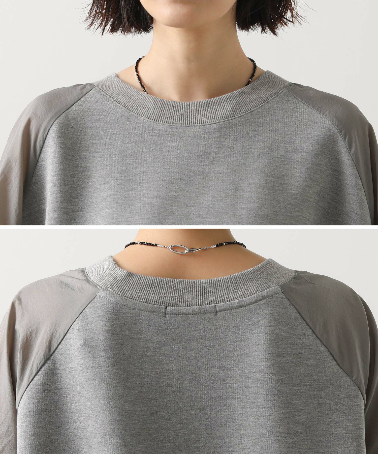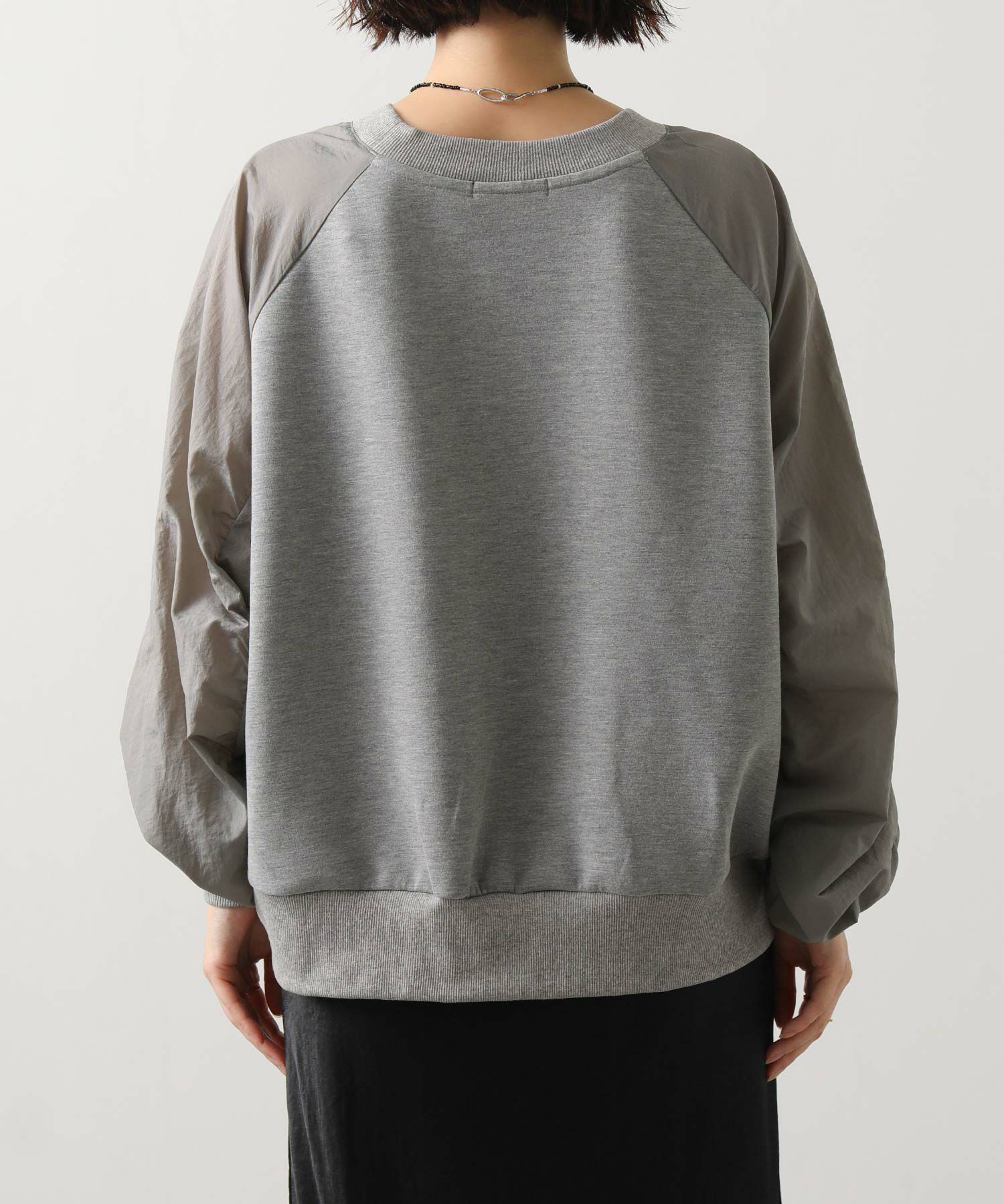 ナイロンワッシャーのほどよいハリ感と、柔らかなカットソー素材を組み合わせたドッキングトップス。