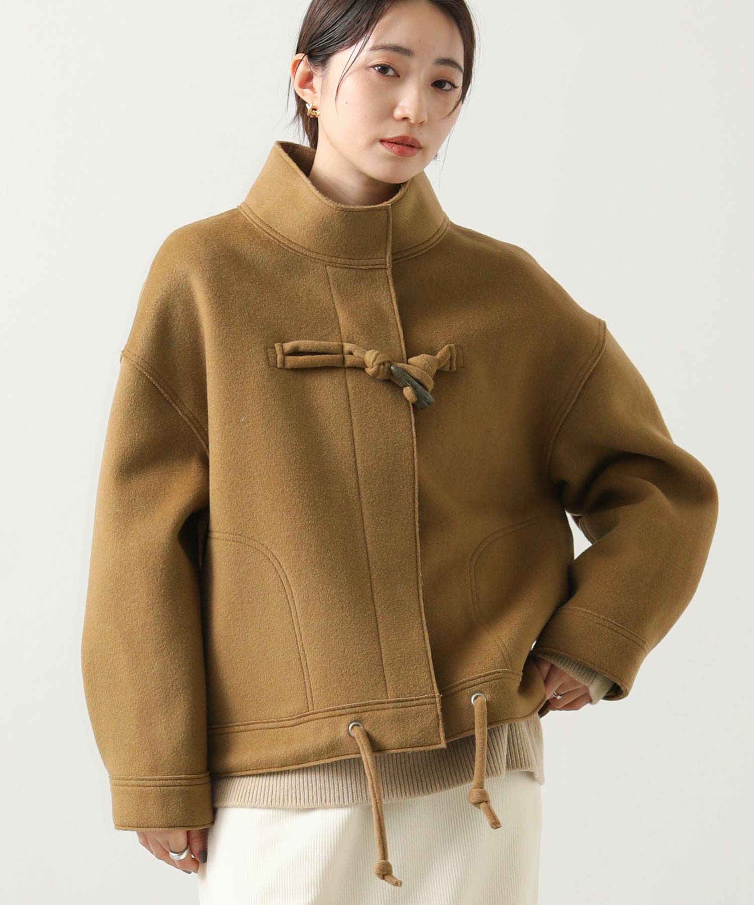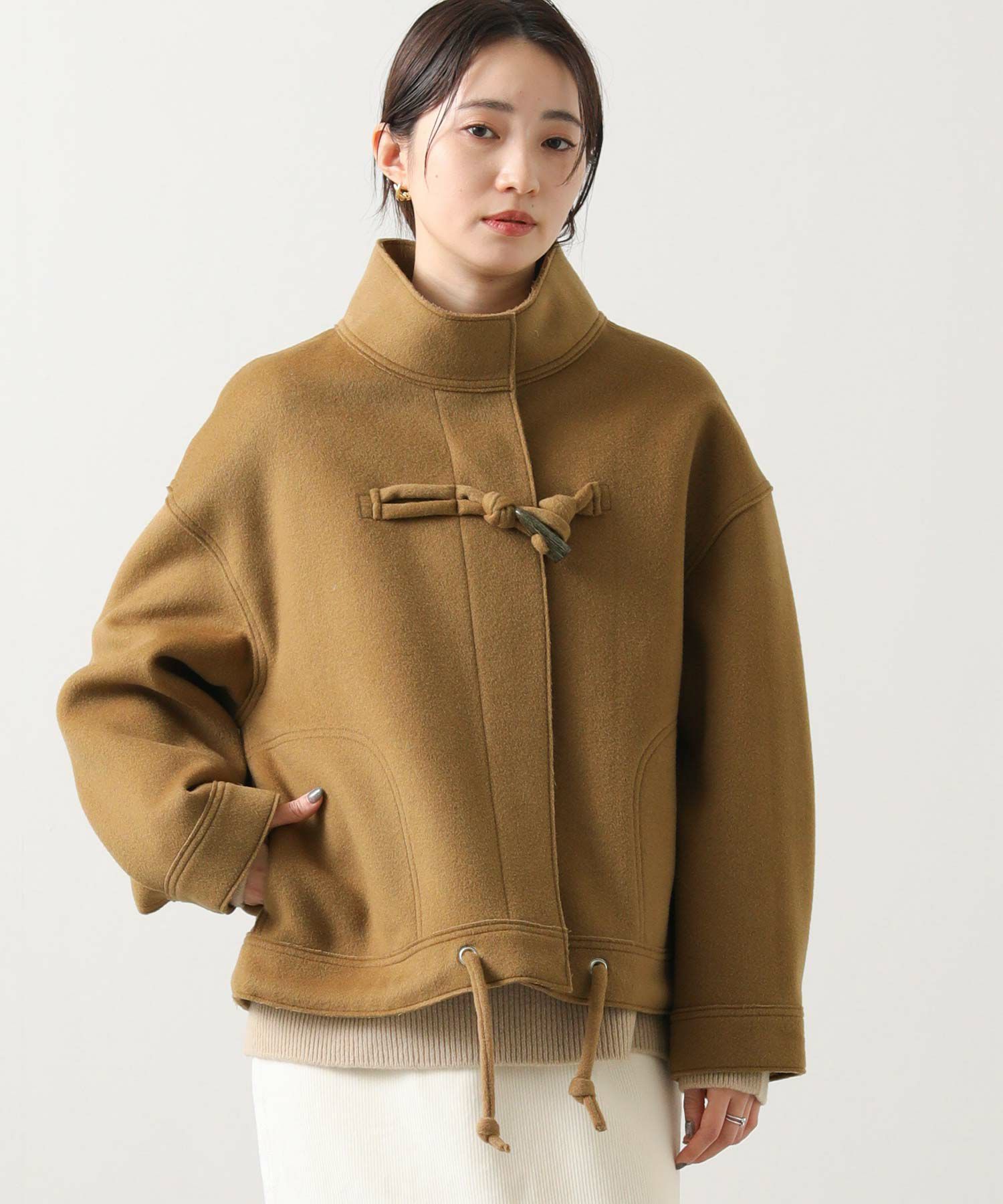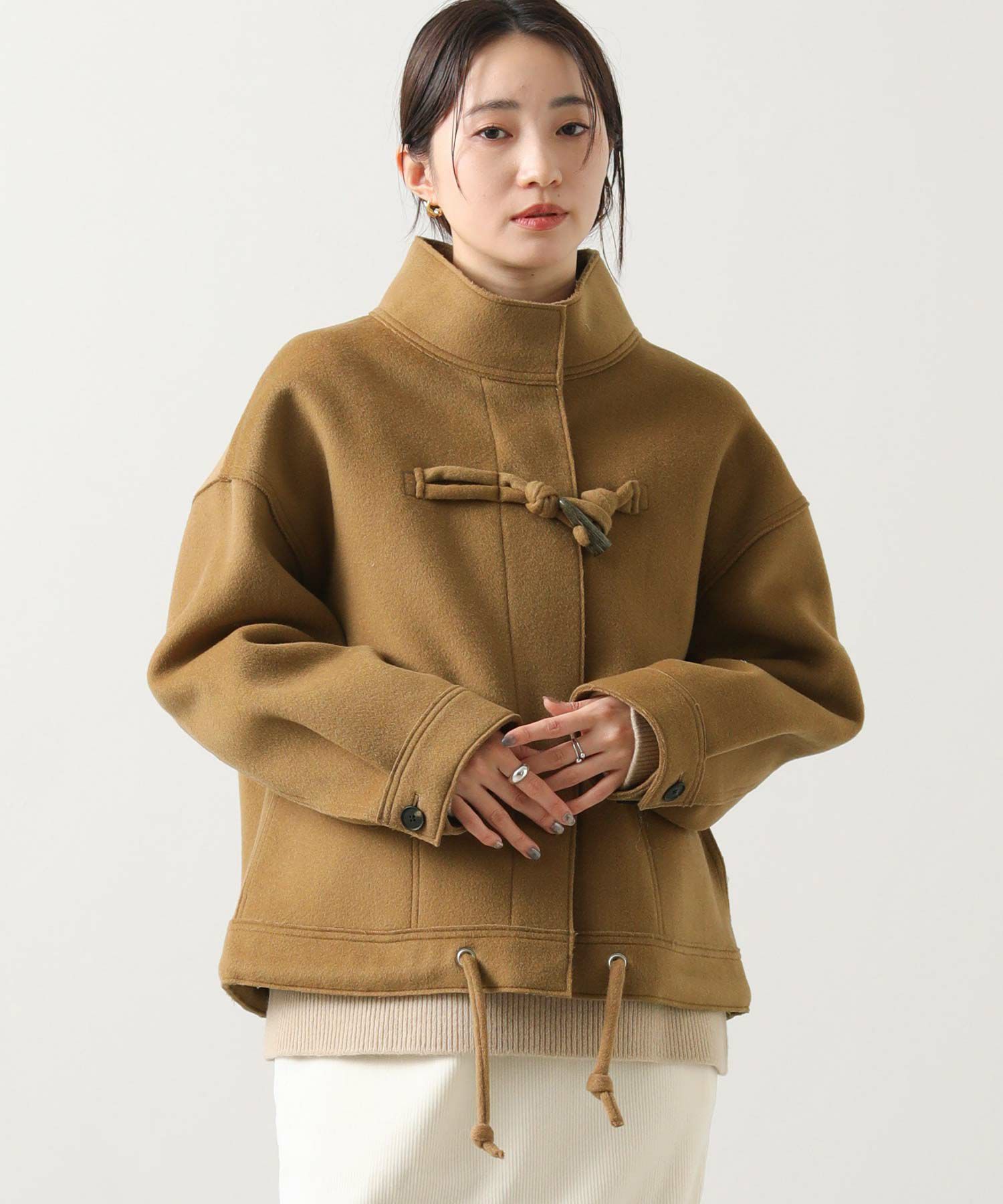 裾やトグルにロープでなく共地を袋にした紐使いにして、ダッフルのマリンやトラッドライクなイメージを少し控えてシックに仕上げました。